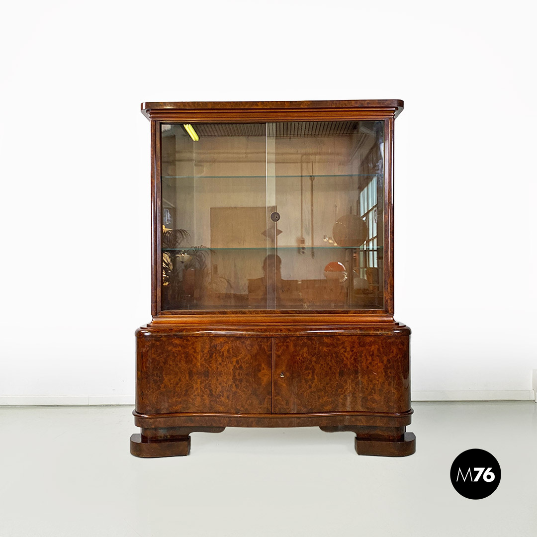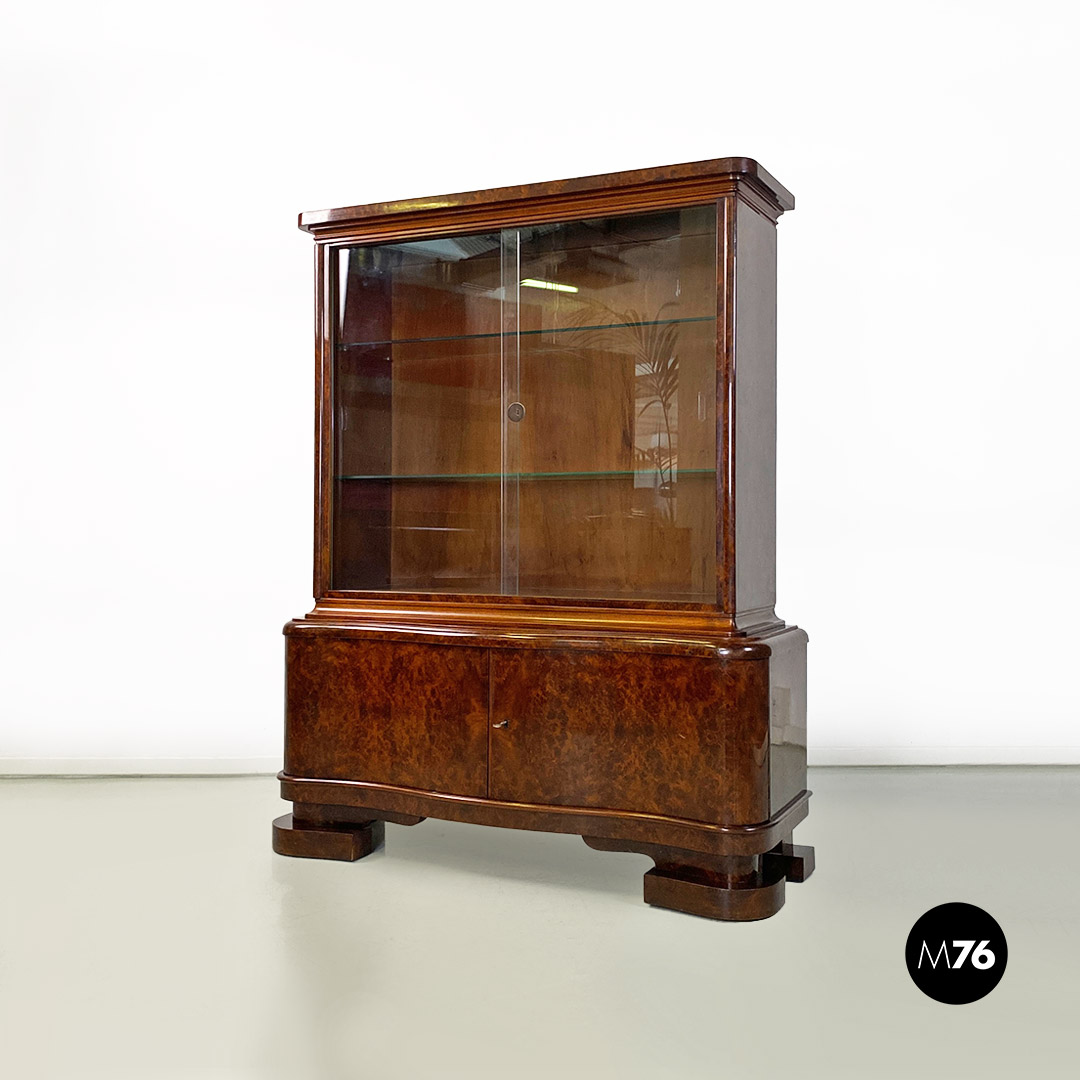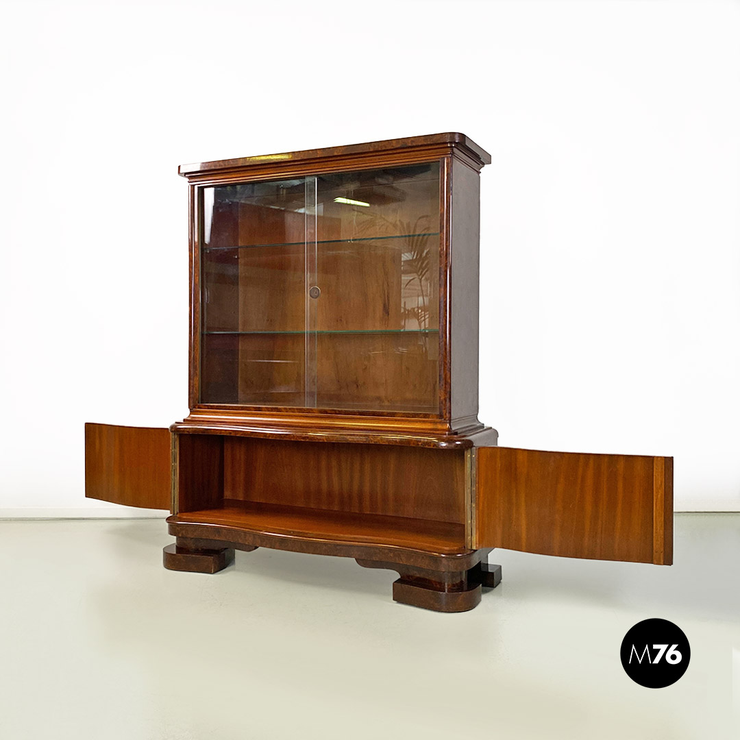 Credenza o highboard a doppio corpo. La parte bassa è chiusa, a contenitore, in legno, provvista di ante a battente dal profilo ricurvo, mentre la parte superiore, meno profonda, presenta due ante scorrevoli in vetro, con due mensole interne con posizione regolabile. Art Deco.