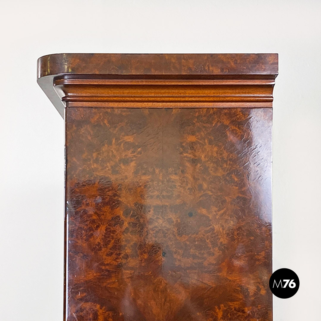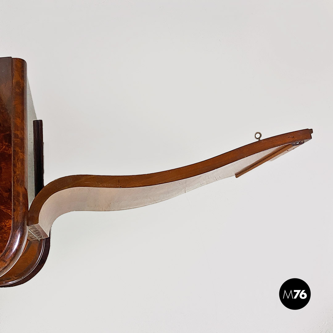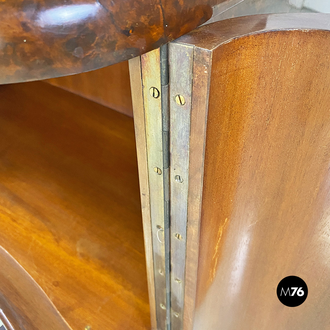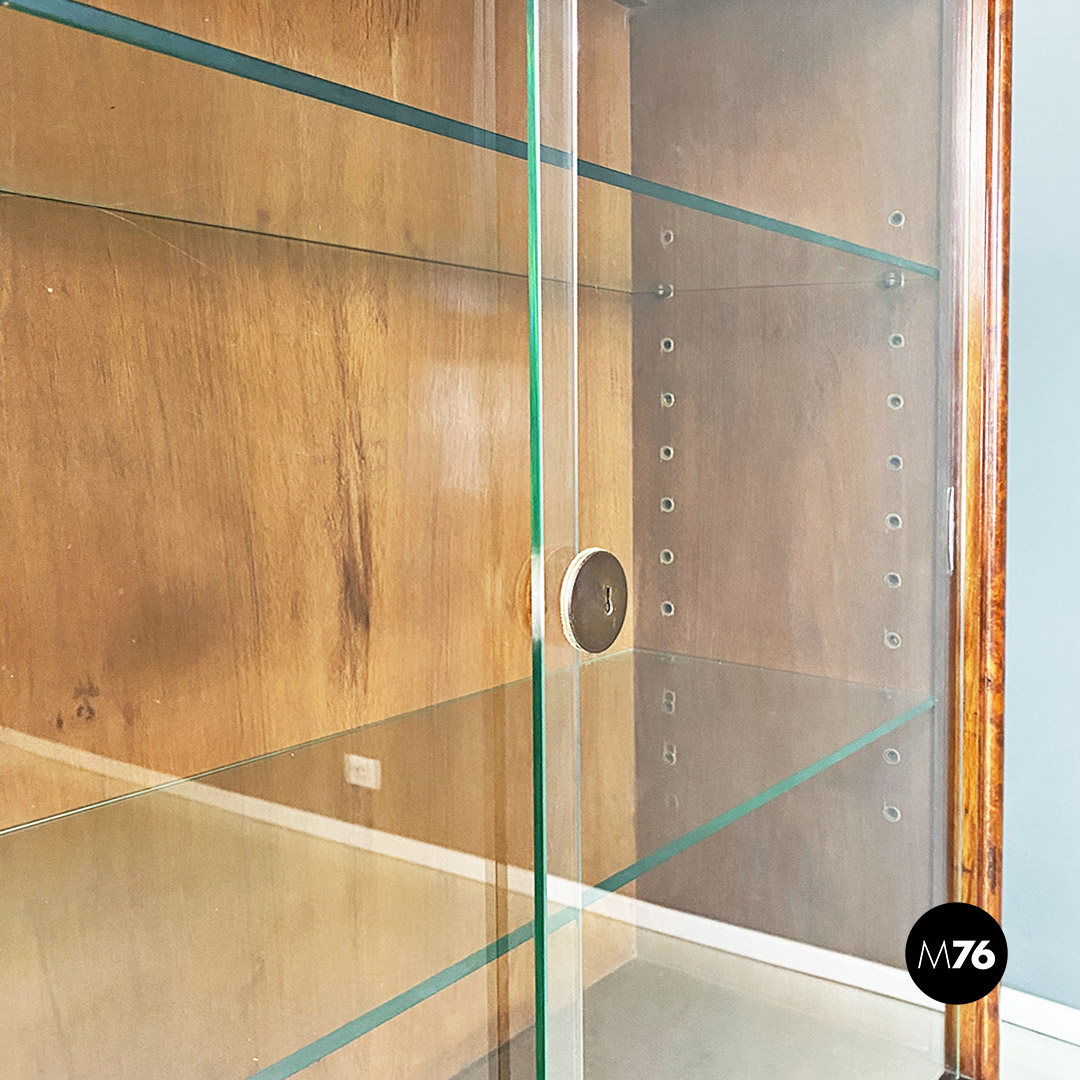 Credenza o highboard a doppio corpo. La parte bassa è chiusa, a contenitore, in legno, provvista di ante a battente dal profilo ricurvo, mentre la parte superiore, meno profonda, presenta due ante scorrevoli in vetro, con due mensole interne con posizione regolabile. Art Deco.