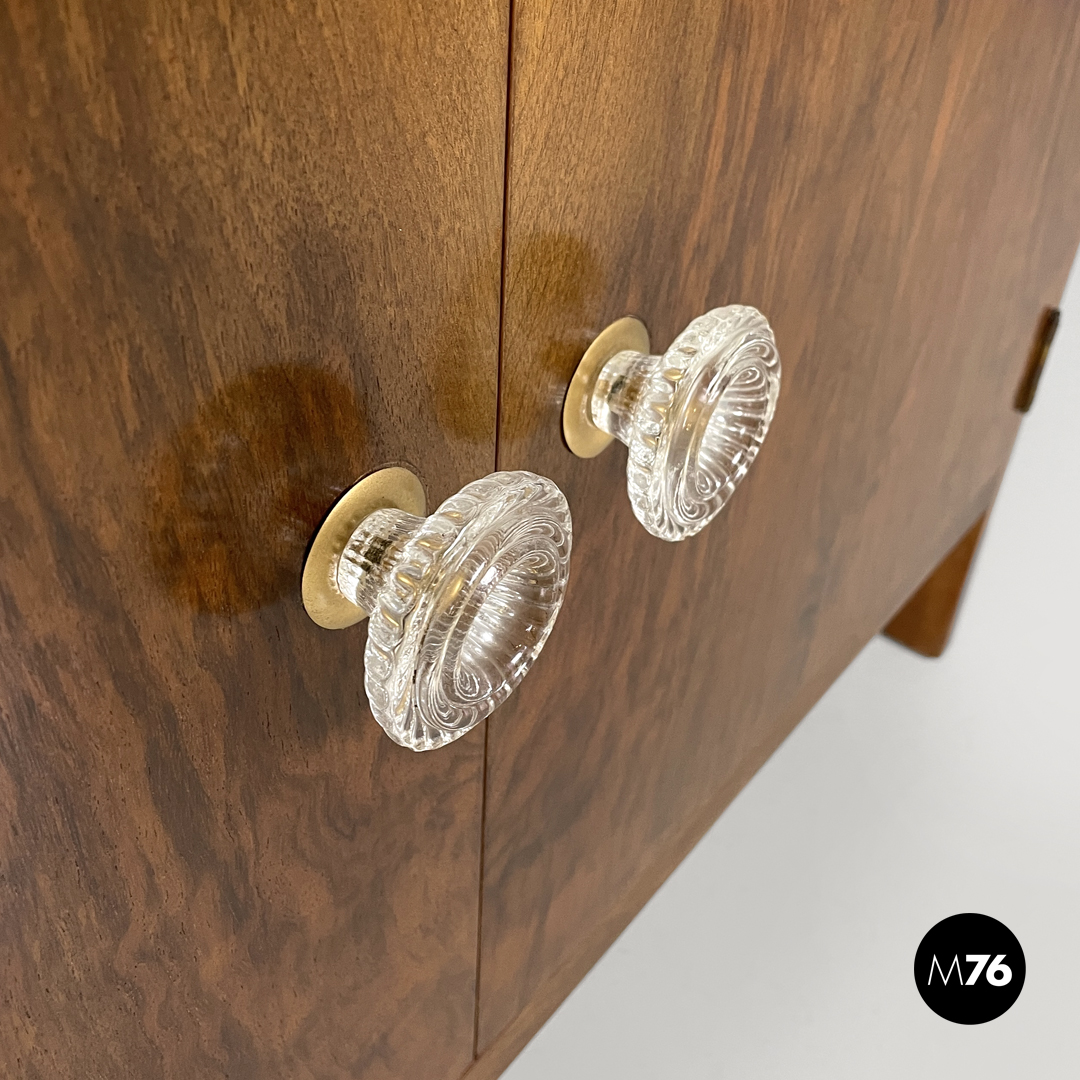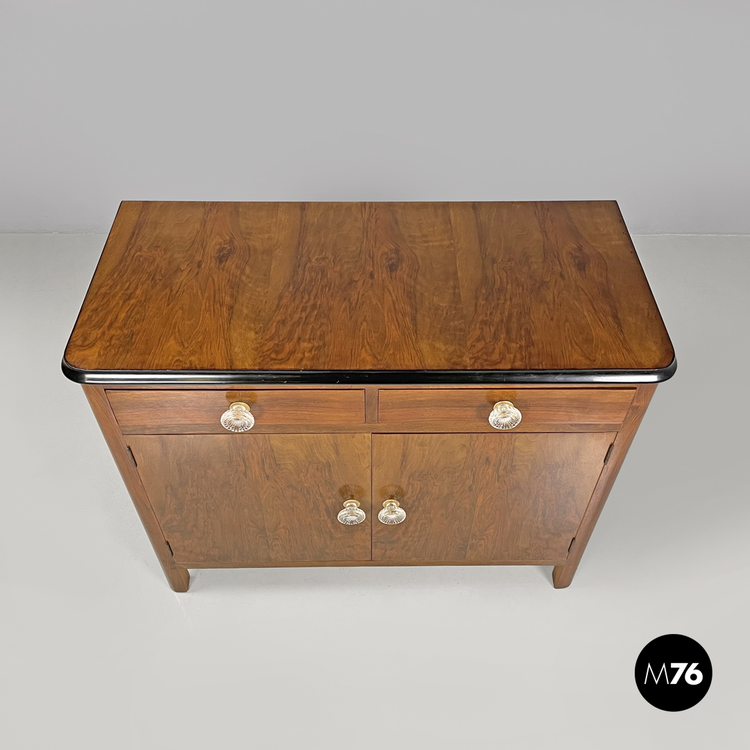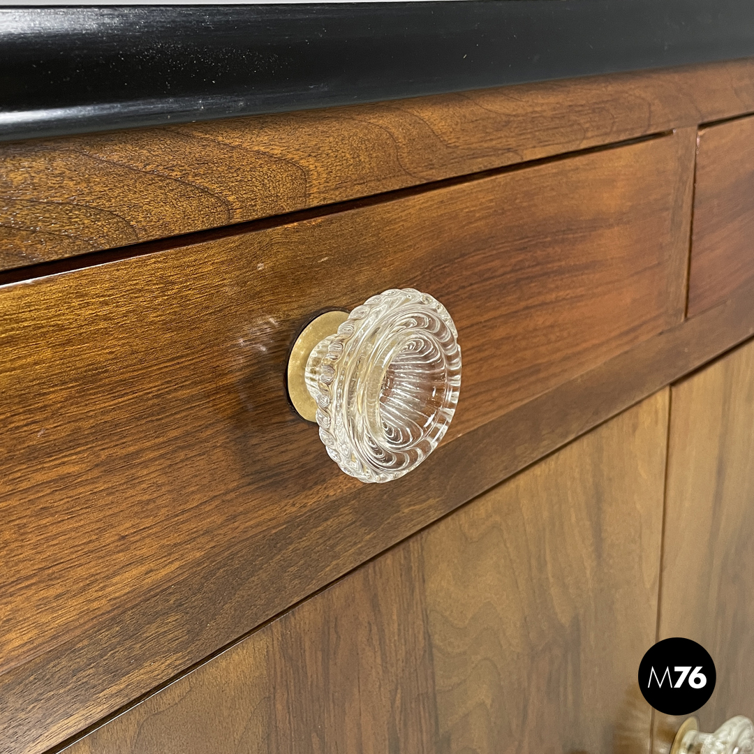 Credenza o sideboard in legno. Il piano del mobile è rettangolare e presenta profili sagomati verniciati in nero, sono presenti due cassetti e due ante con maniglie tonde in vetro trasparente. Le due ante si aprono su un vano interno diviso da una mensola centrale. Con quattro gambe, le due posteriori a sezione quadrata e le due davanti con profilo semicircolare.