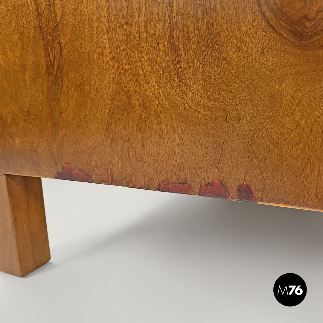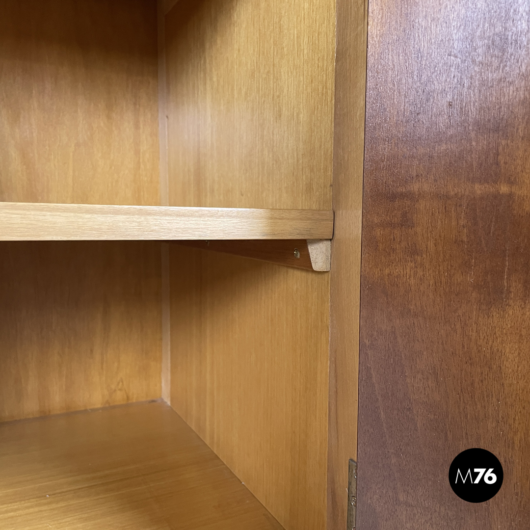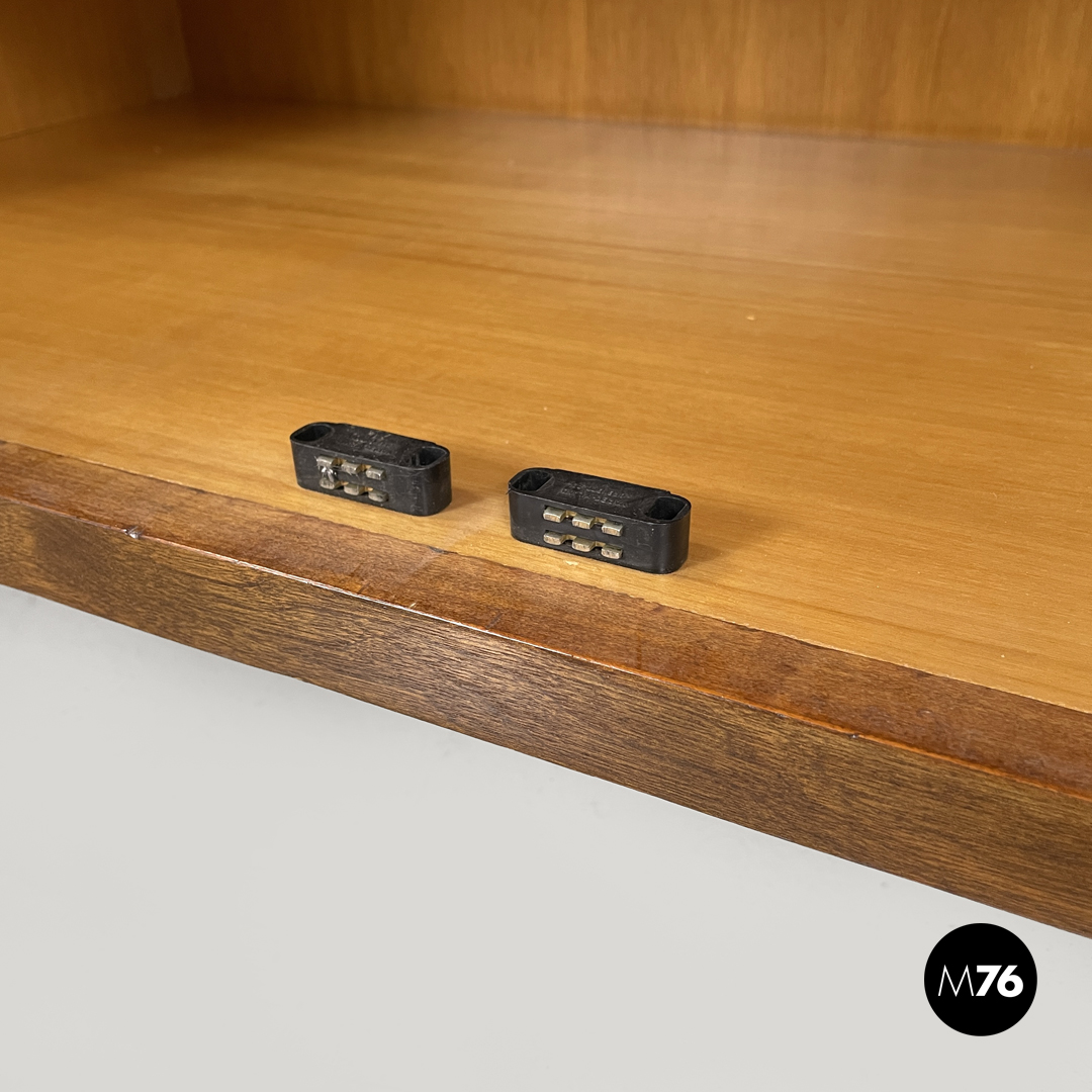 Credenza o sideboard in legno. Il piano del mobile è rettangolare e presenta profili sagomati verniciati in nero, sono presenti due cassetti e due ante con maniglie tonde in vetro trasparente. Le due ante si aprono su un vano interno diviso da una mensola centrale. Con quattro gambe, le due posteriori a sezione quadrata e le due davanti con profilo semicircolare.