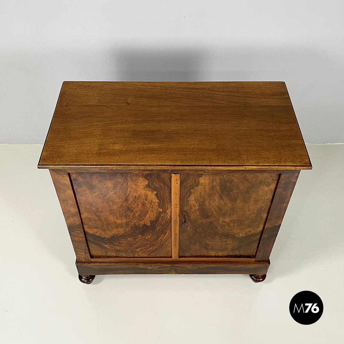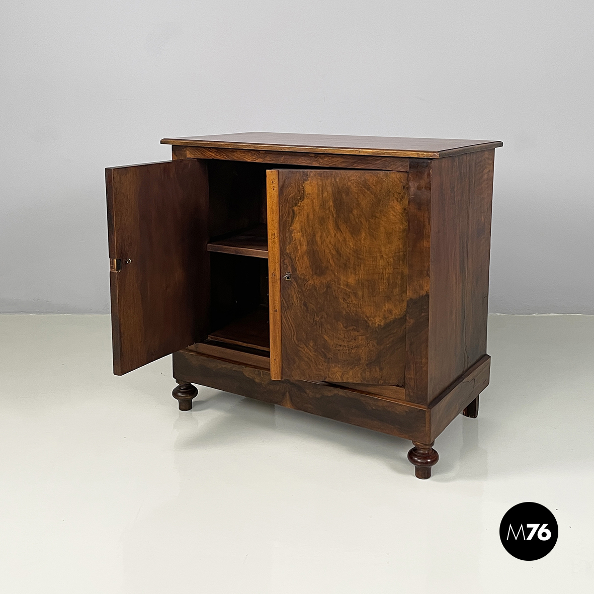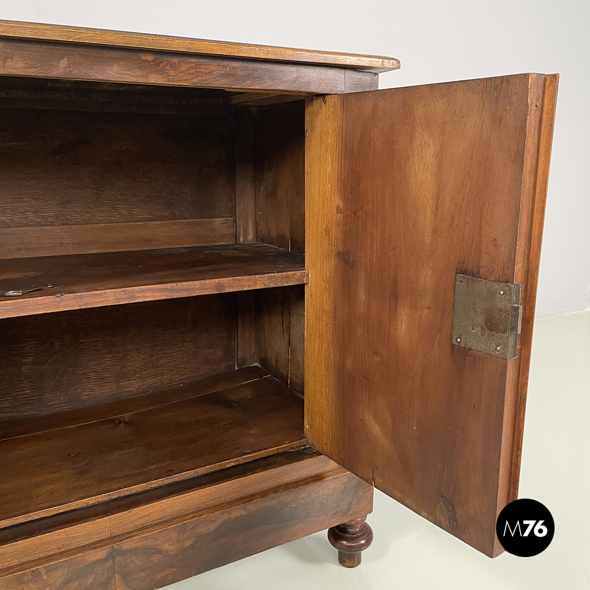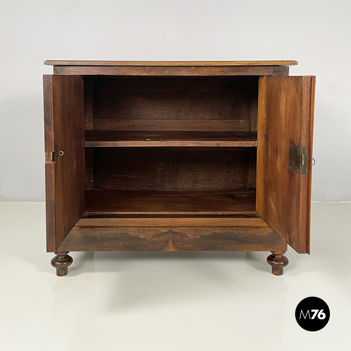 Credenza con piano rettangolare, interamente in legno. Sul fronte presenta una doppia anta a battente e con mensola interna. Chiave presente. I piedini anteriori sono lavorati, mentre piedini posteriori sono a sezione quadrata. Utilizzabile come sideboard, armadietto o highboard.