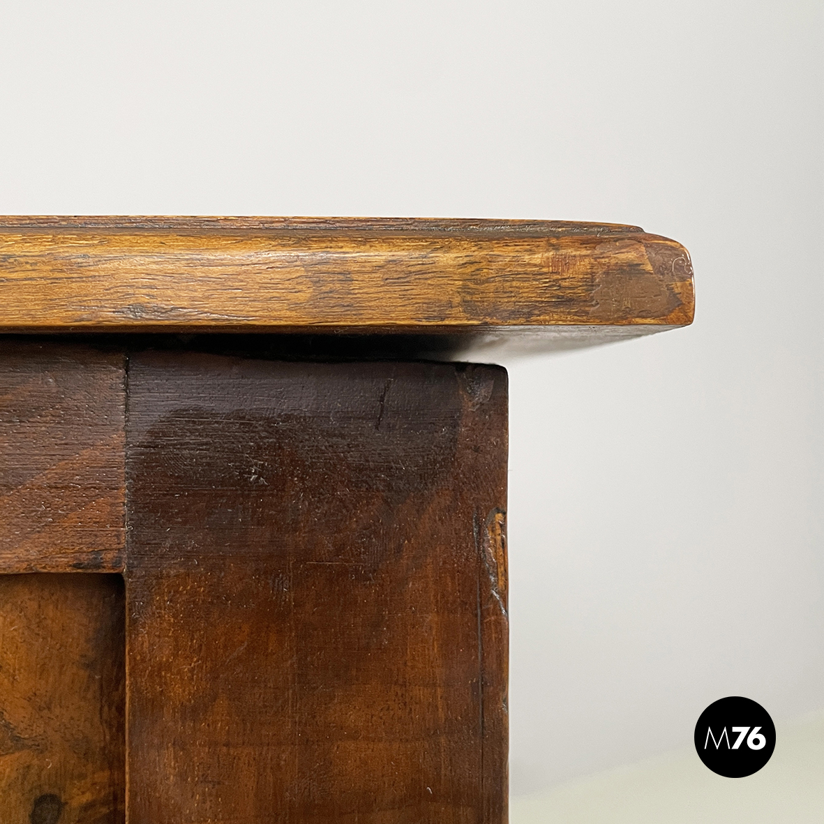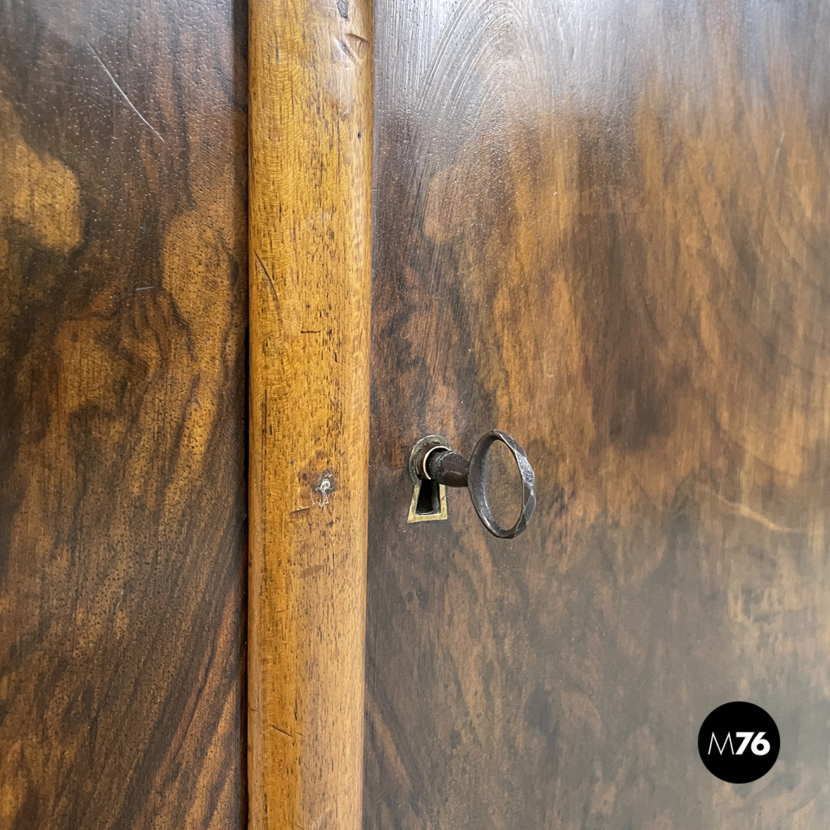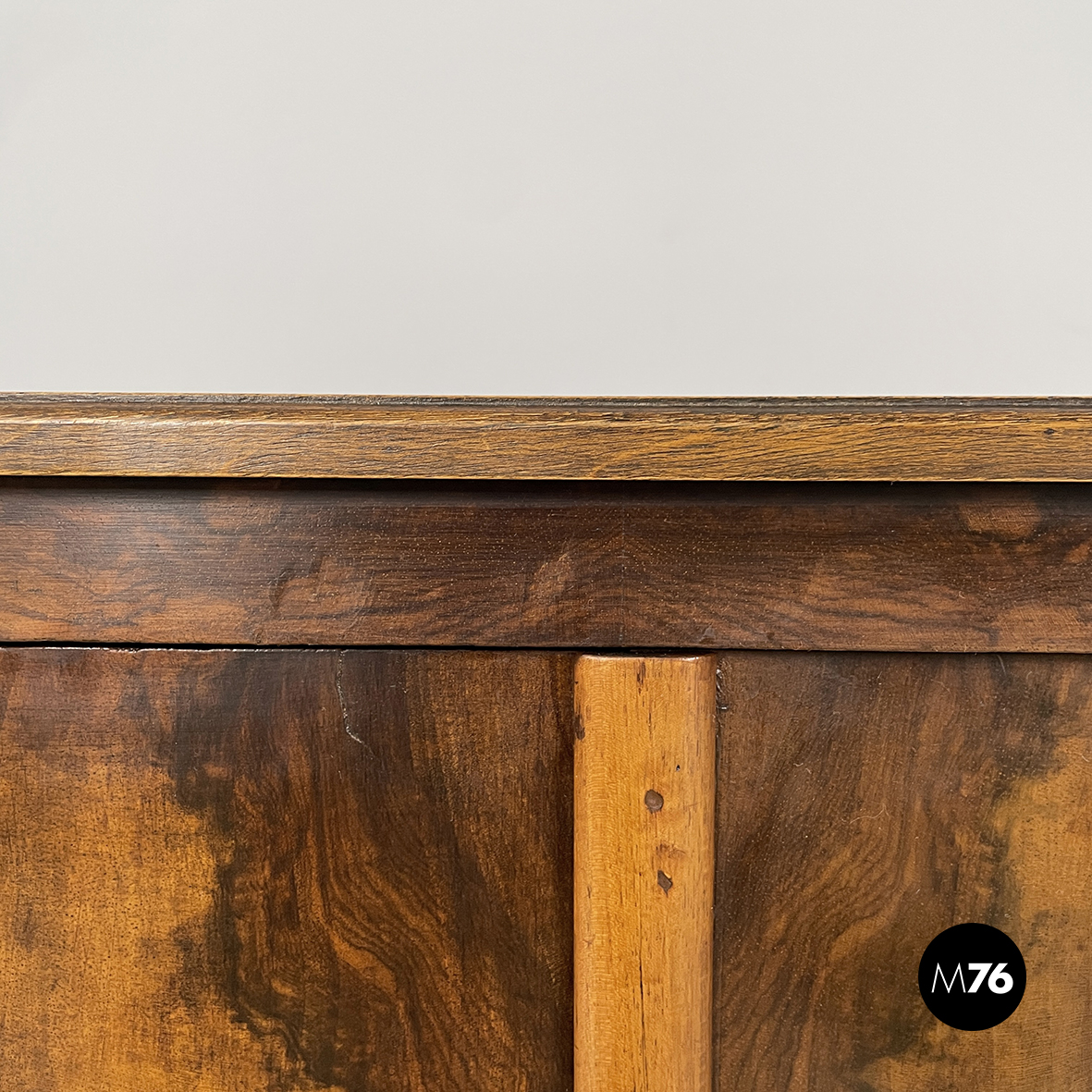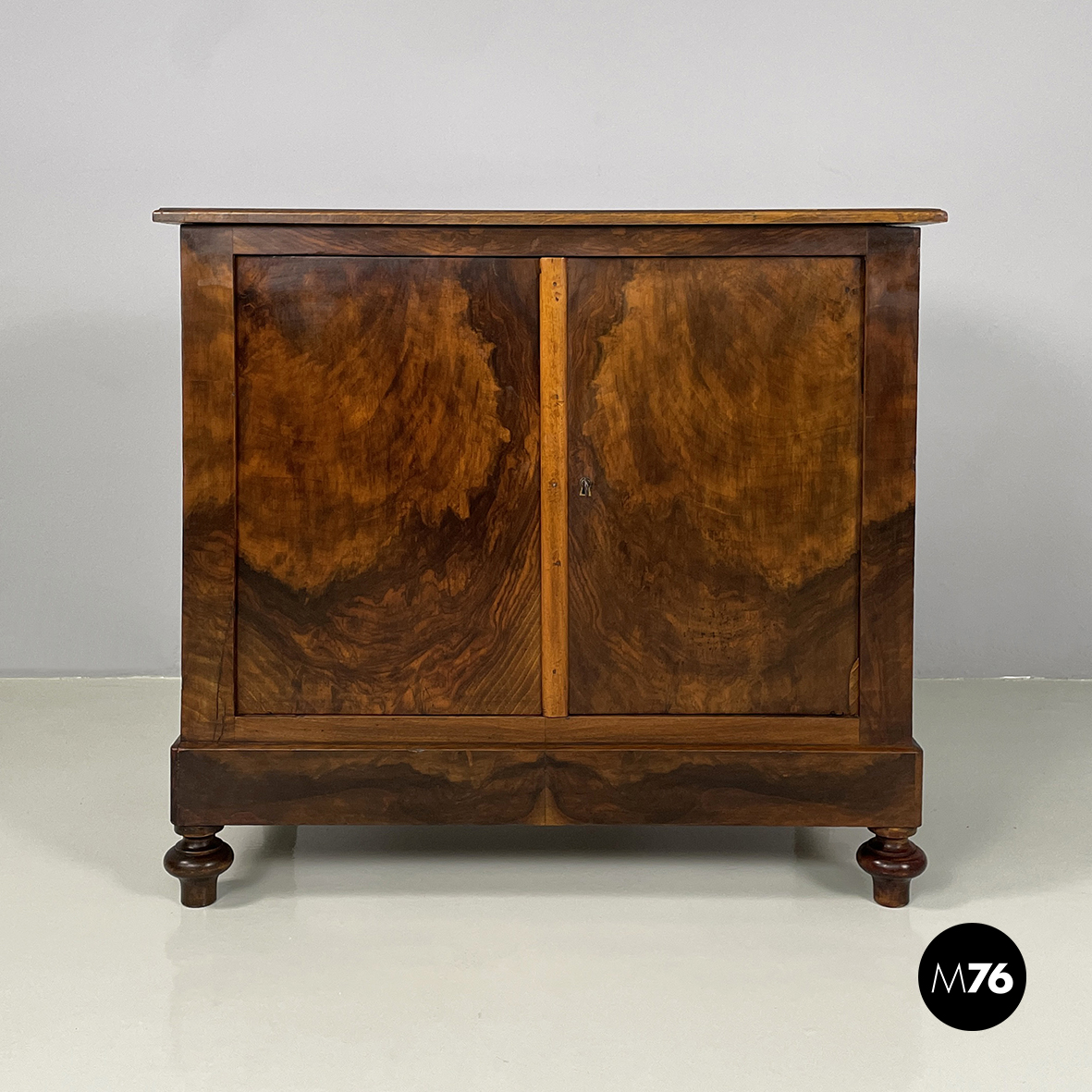 Credenza con piano rettangolare, interamente in legno. Sul fronte presenta una doppia anta a battente e con mensola interna. Chiave presente. I piedini anteriori sono lavorati, mentre piedini posteriori sono a sezione quadrata. Utilizzabile come sideboard, armadietto o highboard.