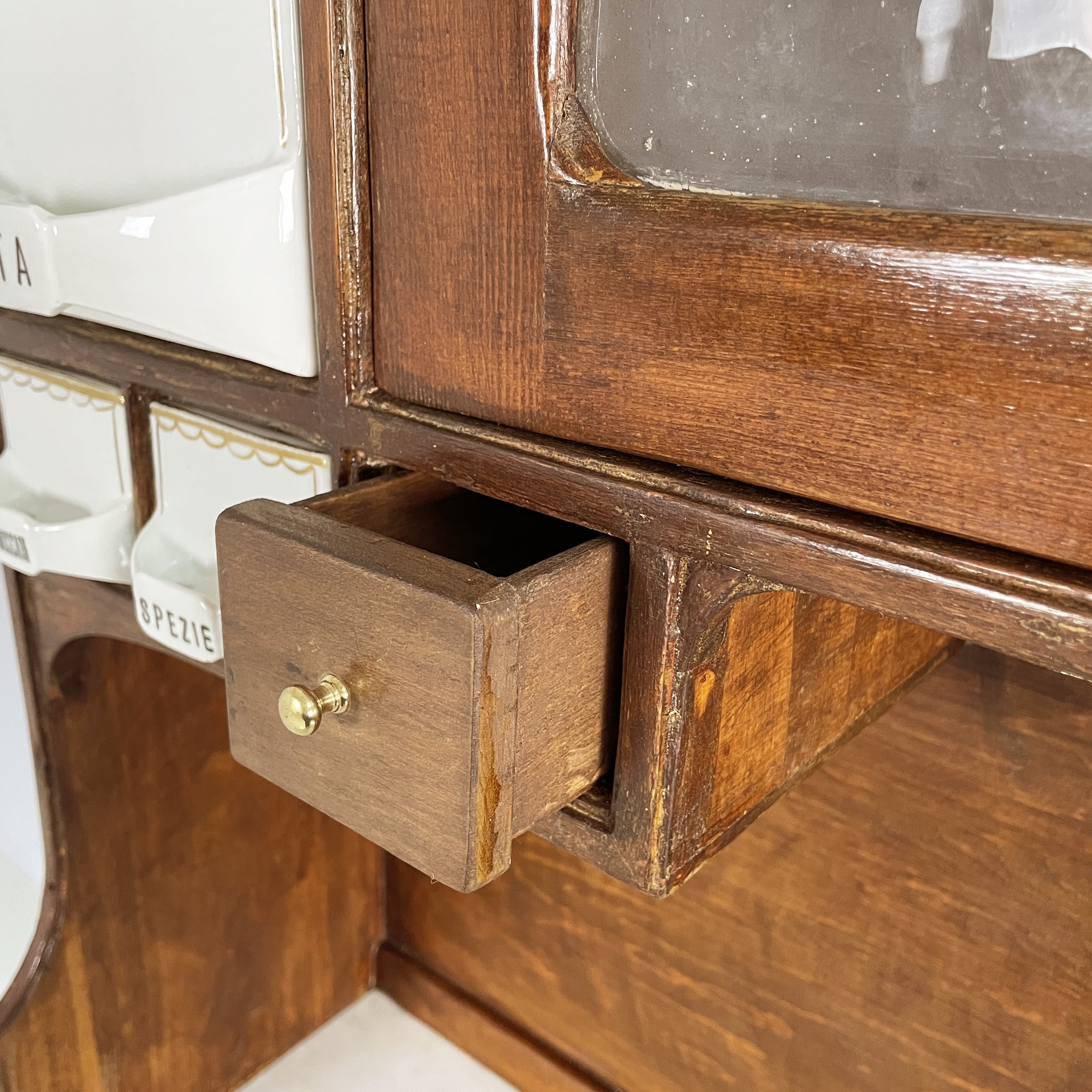 Credenza da cucina a base rettangolare a due moduli con struttura in legno. La parte superiore presenta uno scompartimento centrale con anta a battente in vetro lavorato e legno con mensola interna. Intorno al vano centrale sono presenti diversi cassetti: due cassetti in legno e dieci cassetti in ceramica con decorazioni dorate e scritte nere. Nella parte inferiore è presente un piano in marmo bianco con due cassetti rettangolari e un vano con doppia anta a battente, interni bianchi e mensola interna. Maniglie tonde in ceramica con dettaglio in metallo. Zampe a sezione squadrata. utilizzabile come highboard o sideboard. Retro non rifinito.