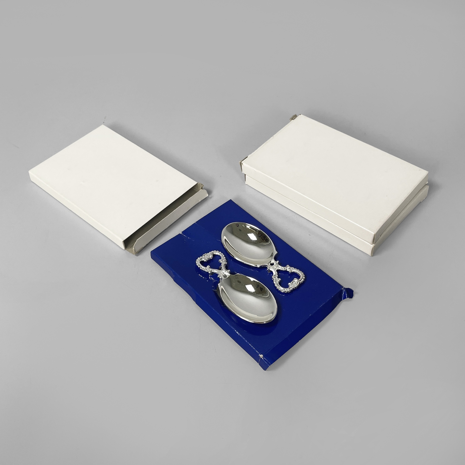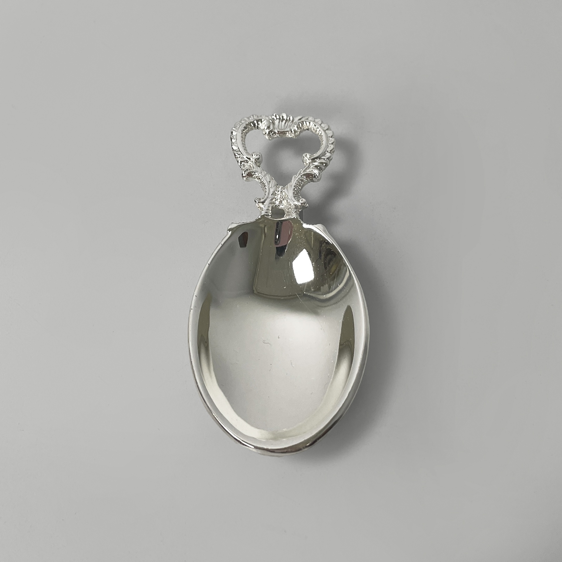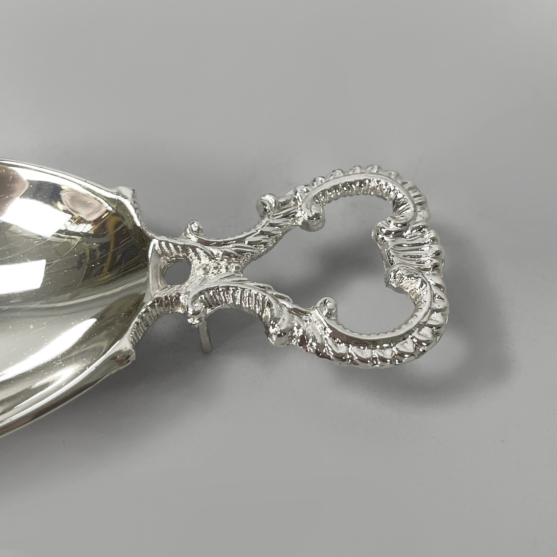 Set di sei cucchiai da ostrica placcati argento. Il manico finemente lavorato è a forma di cuore. Sotto è presente un piccolo sostegno. In scatola di cartone.