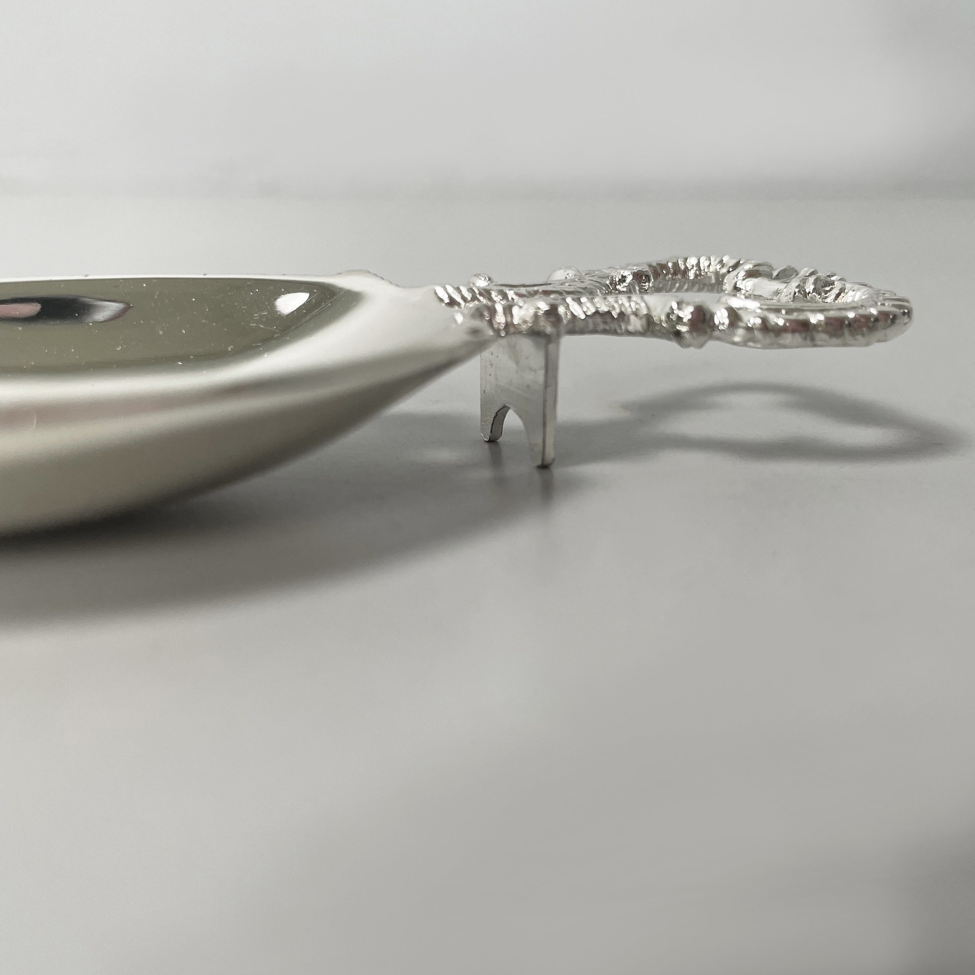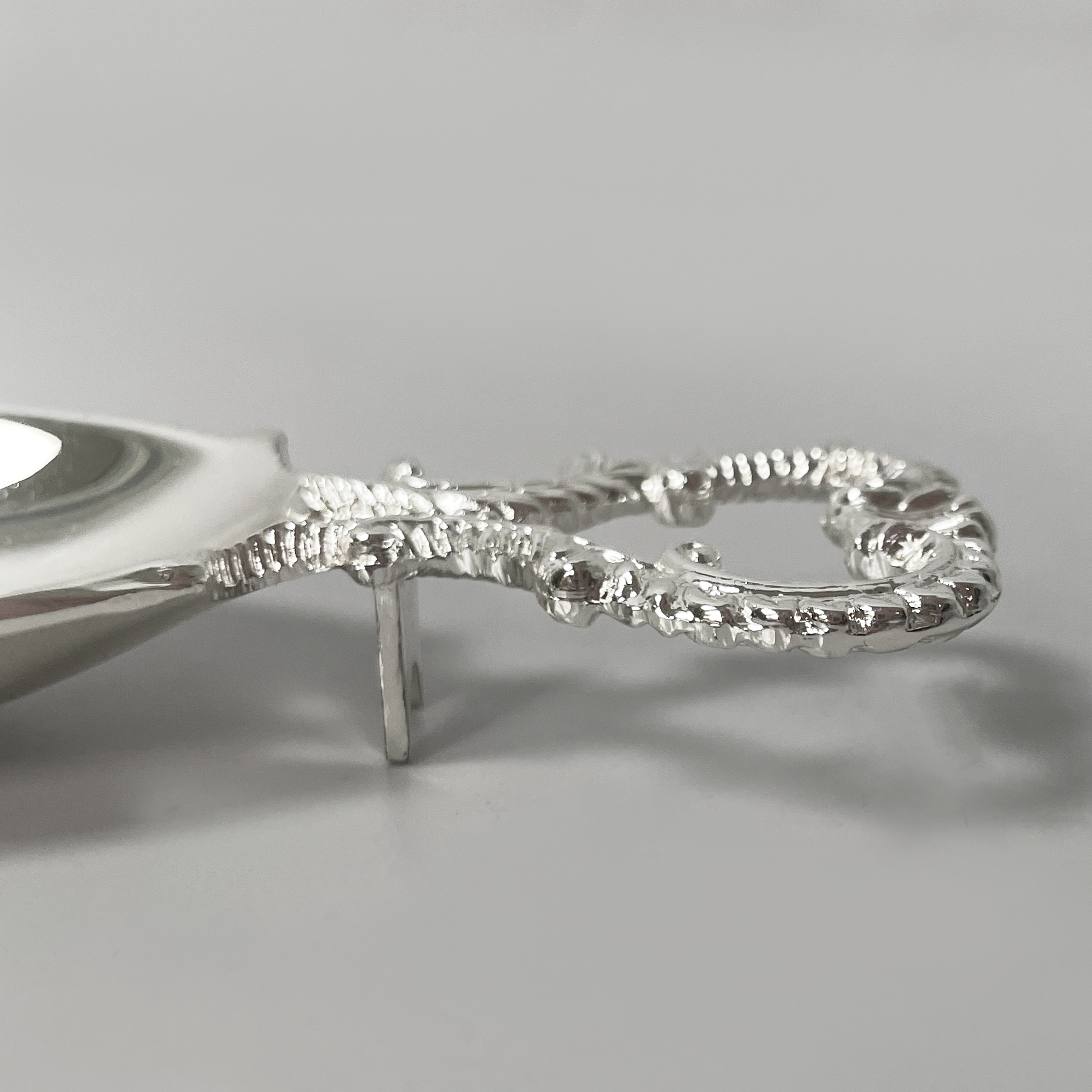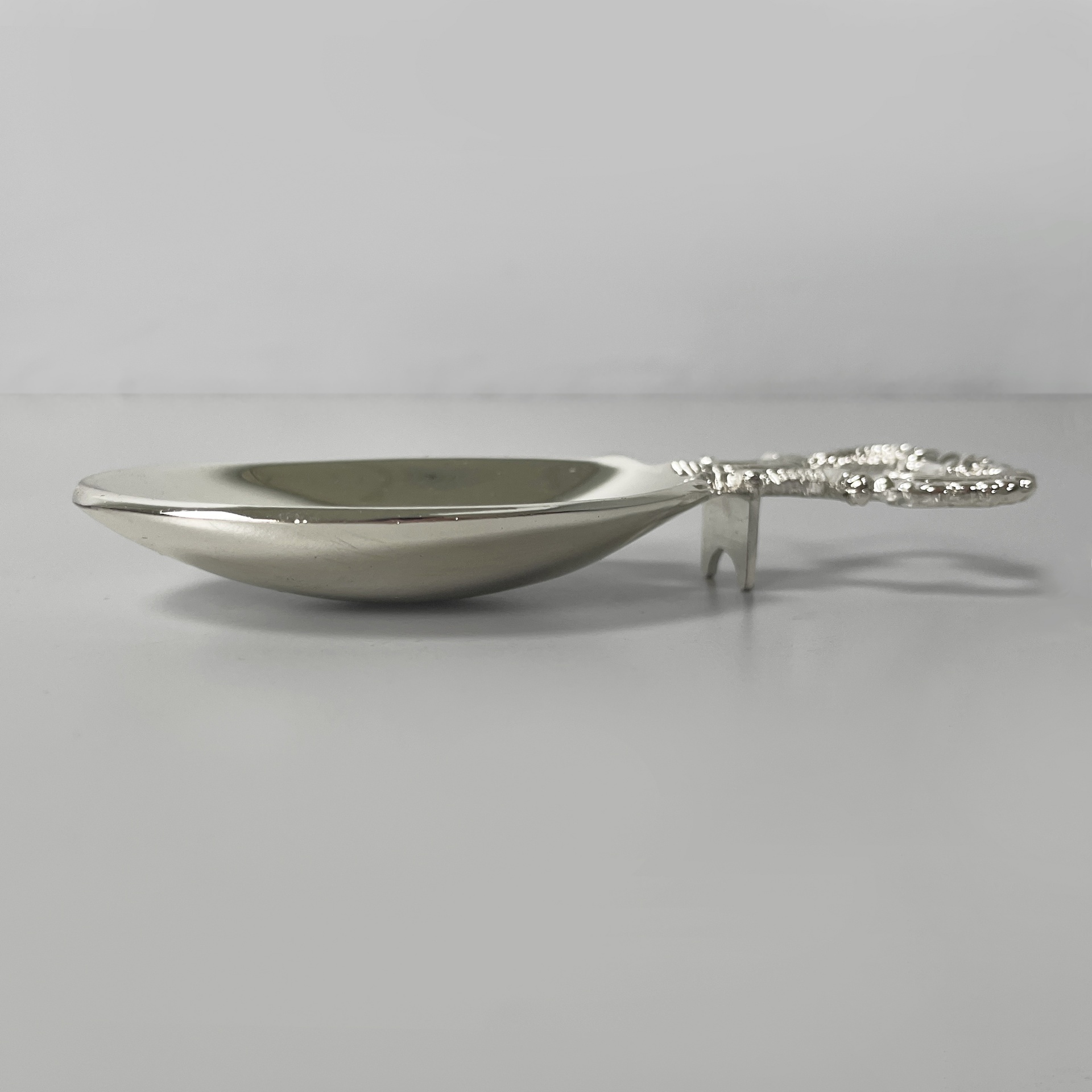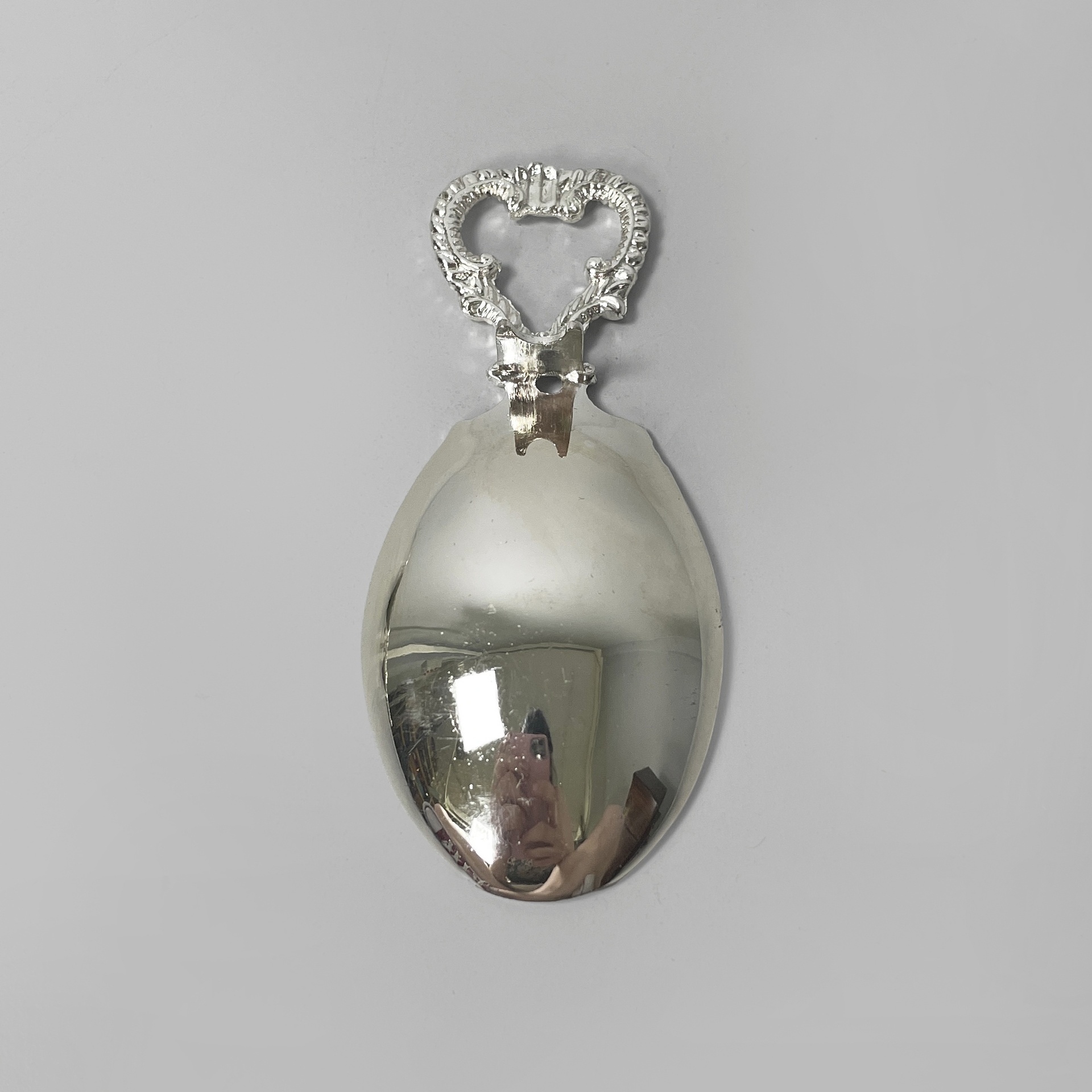 Set di sei cucchiai da ostrica placcati argento. Il manico finemente lavorato è a forma di cuore. Sotto è presente un piccolo sostegno. In scatola di cartone.