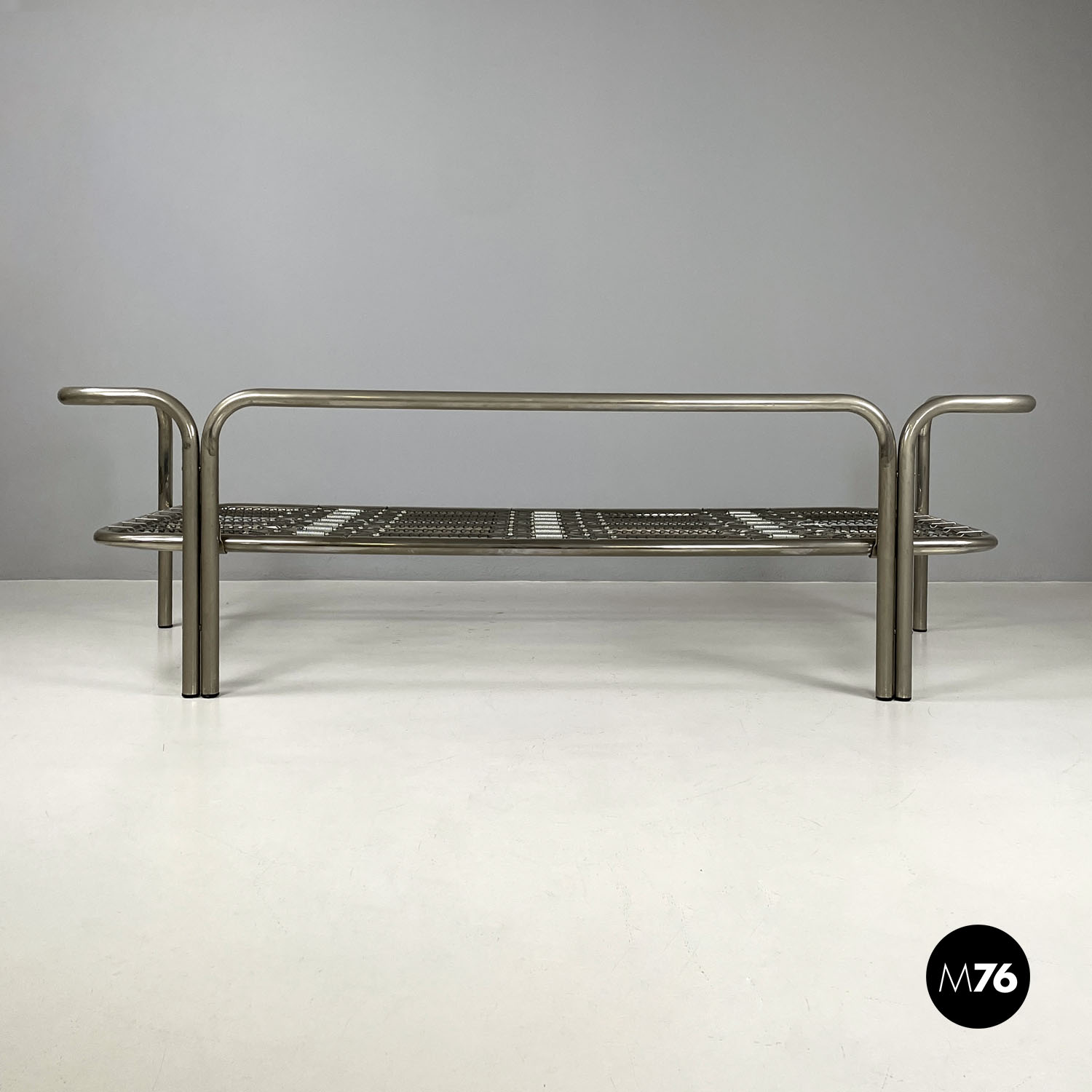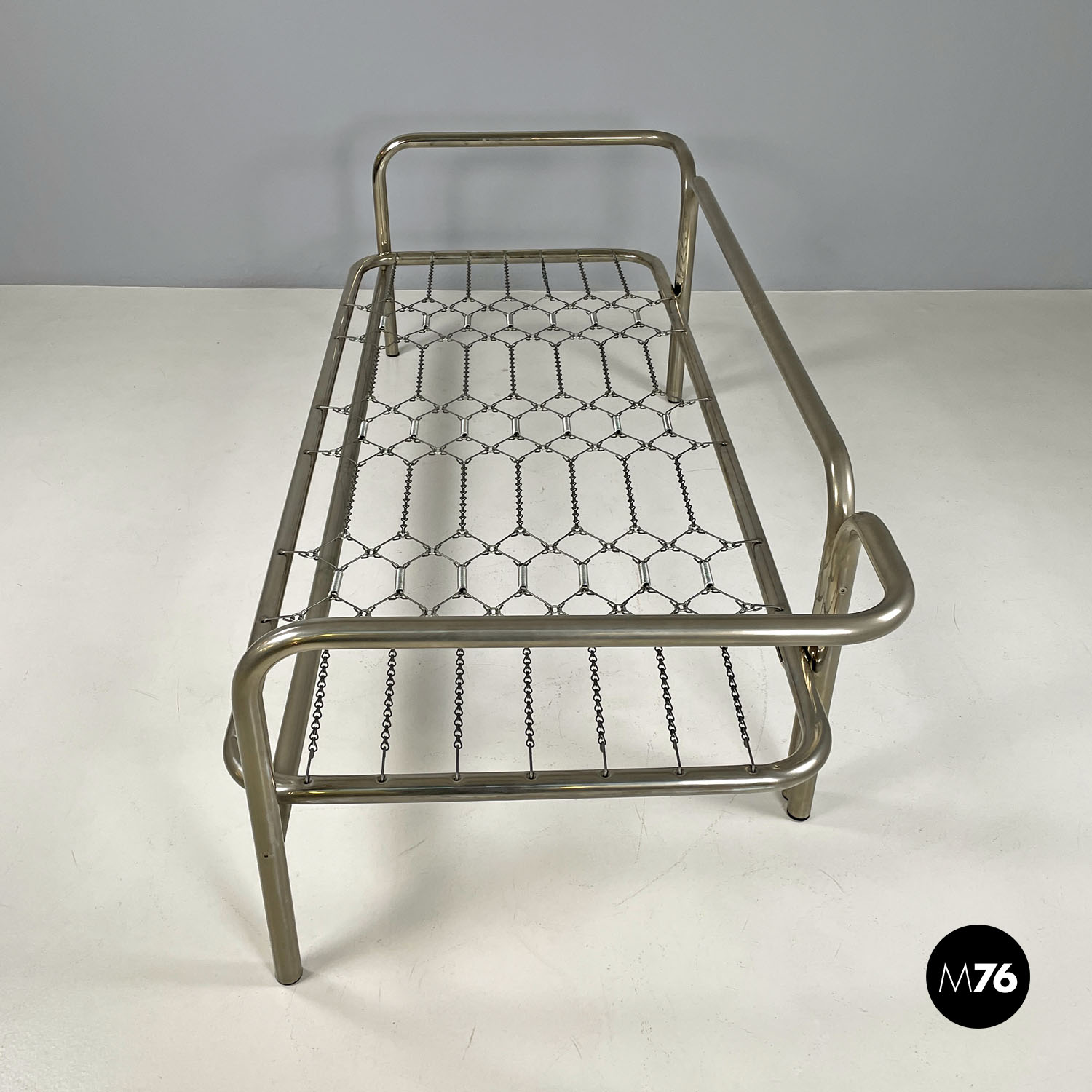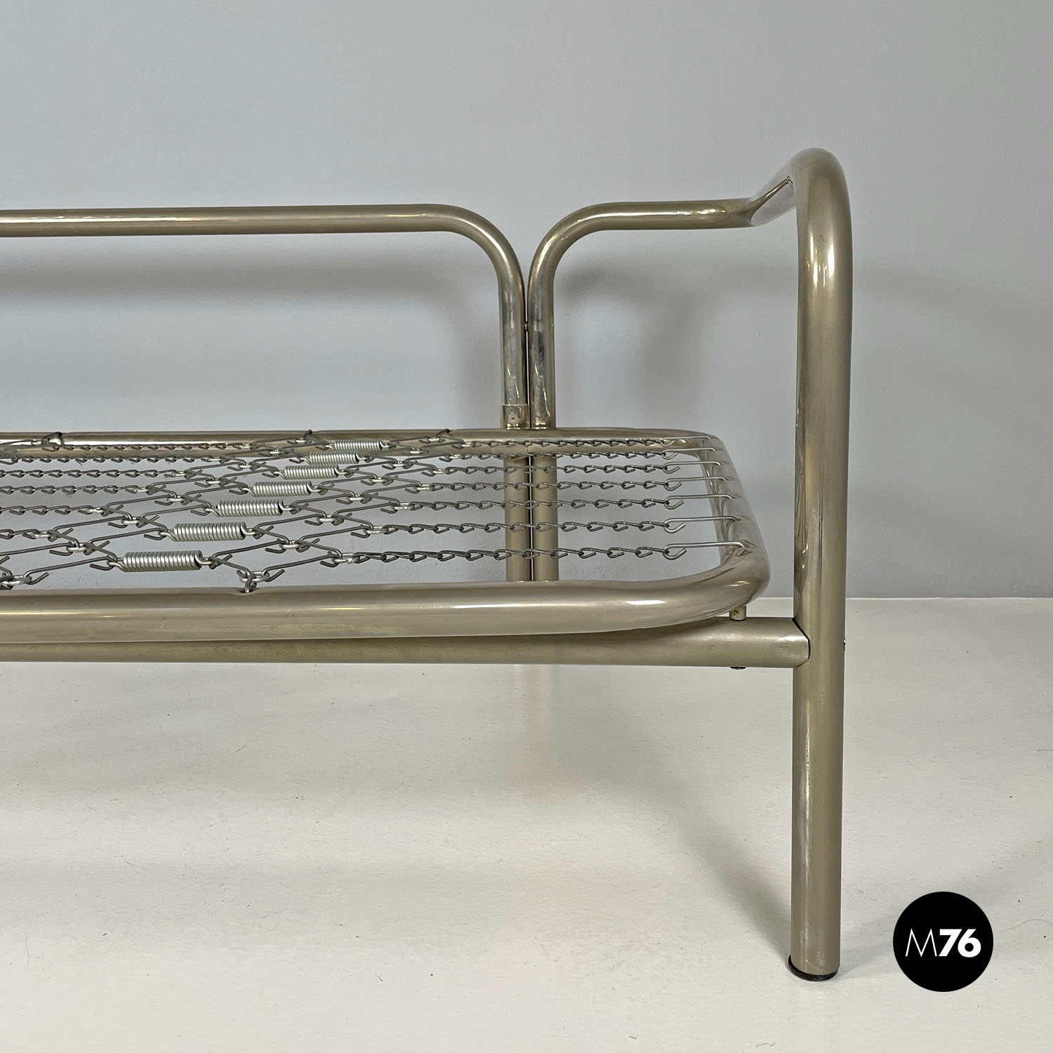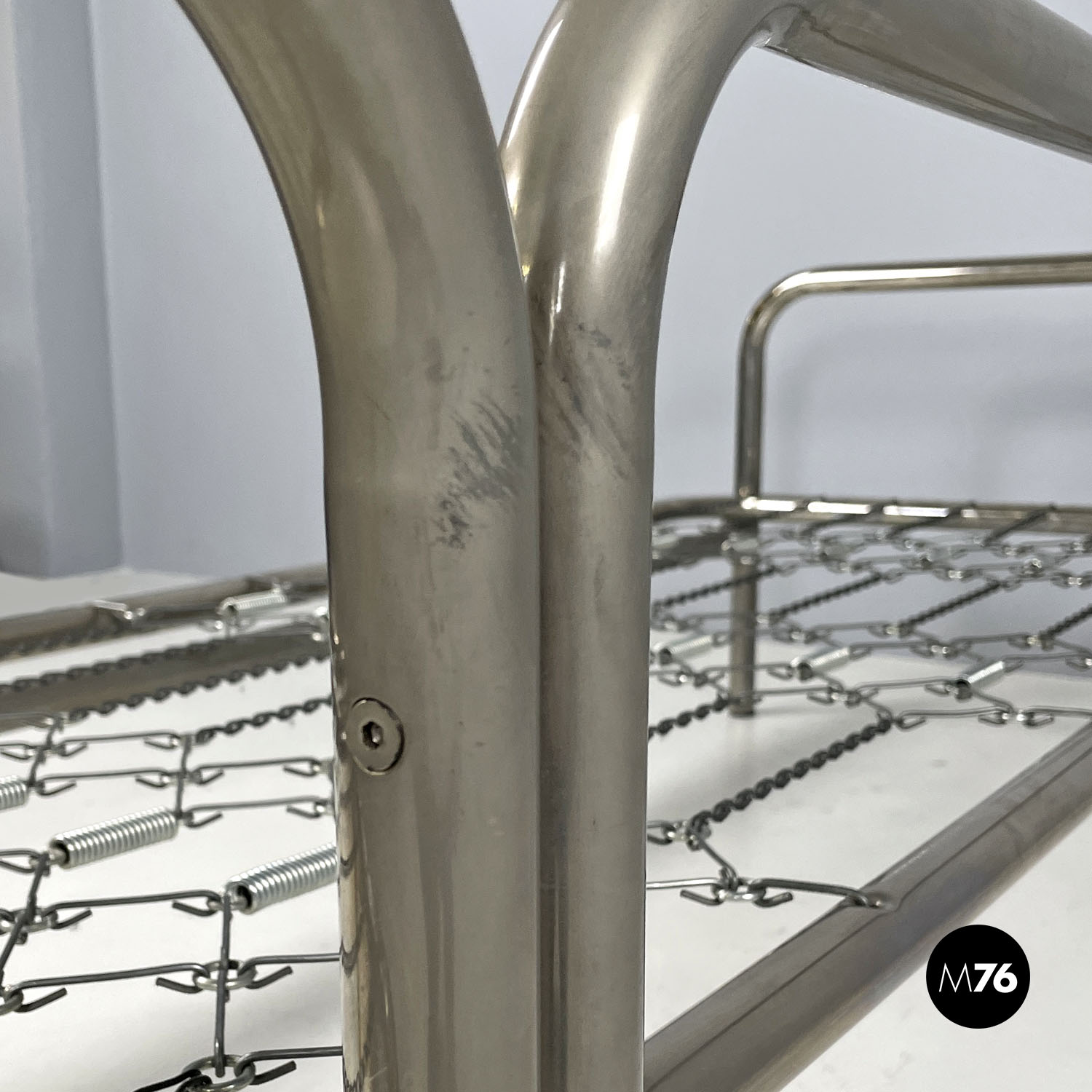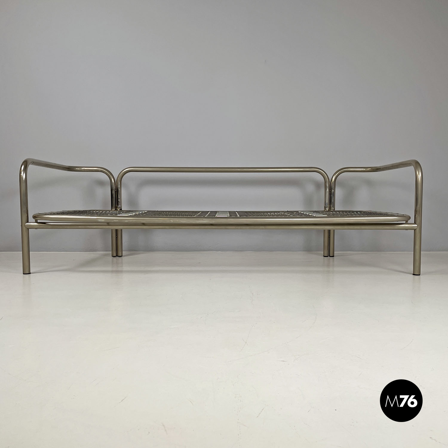 Daybed o letto modello Locus Solus con struttura in metallo cromato in patina. La struttura è interamente in tubolare, che si modella curvandosi a formare lo schienale e i braccioli. La seduta è composta da una rete metallica, perfetta per posizionare un materasso e renderlo un letto o un divano. Sul fronte presenta due zampe, sul retro quattro unite in due coppie.