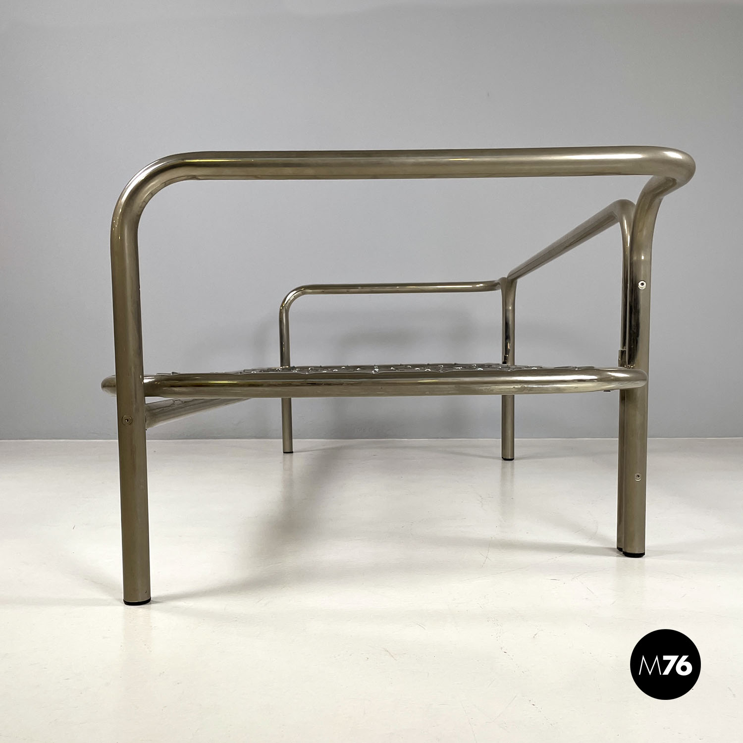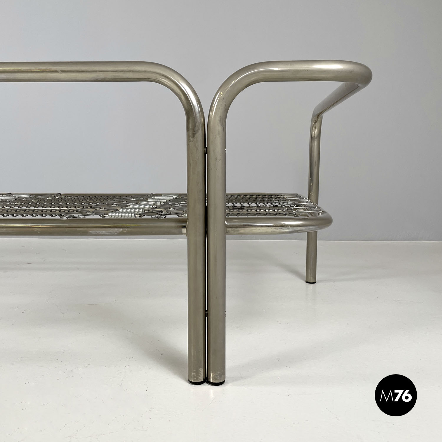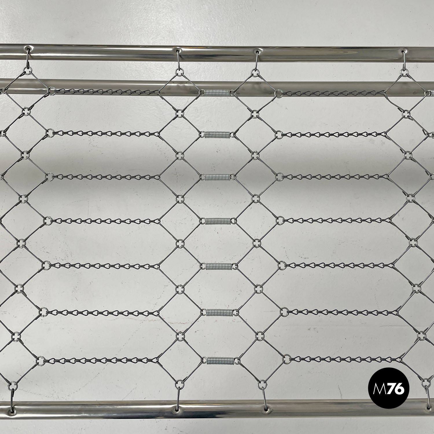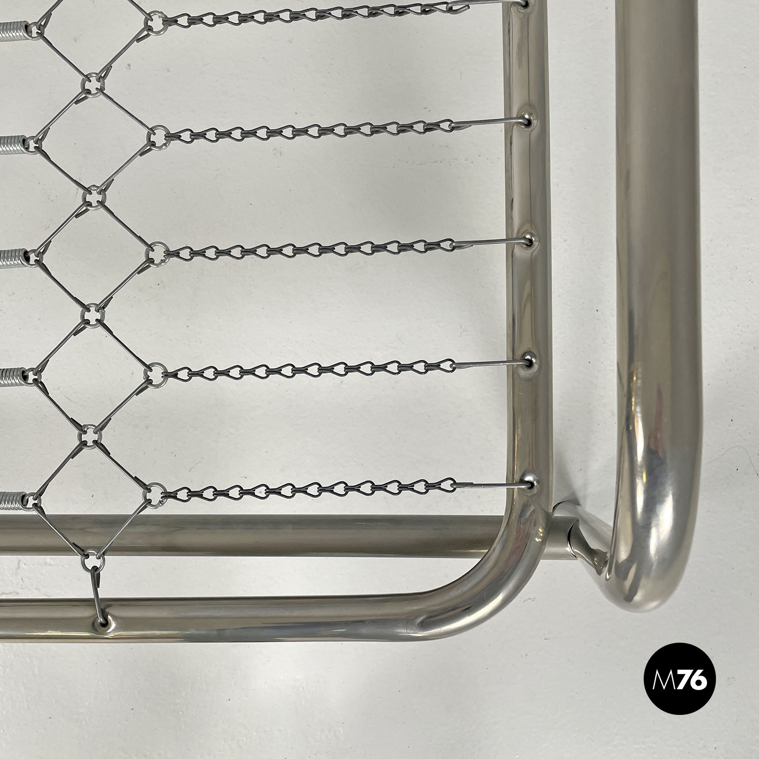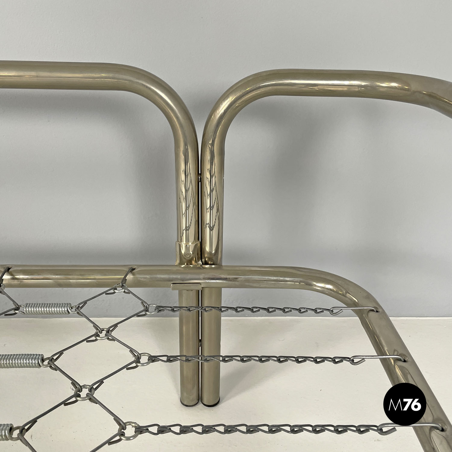 Daybed o letto modello Locus Solus con struttura in metallo cromato in patina. La struttura è interamente in tubolare, che si modella curvandosi a formare lo schienale e i braccioli. La seduta è composta da una rete metallica, perfetta per posizionare un materasso e renderlo un letto o un divano. Sul fronte presenta due zampe, sul retro quattro unite in due coppie.