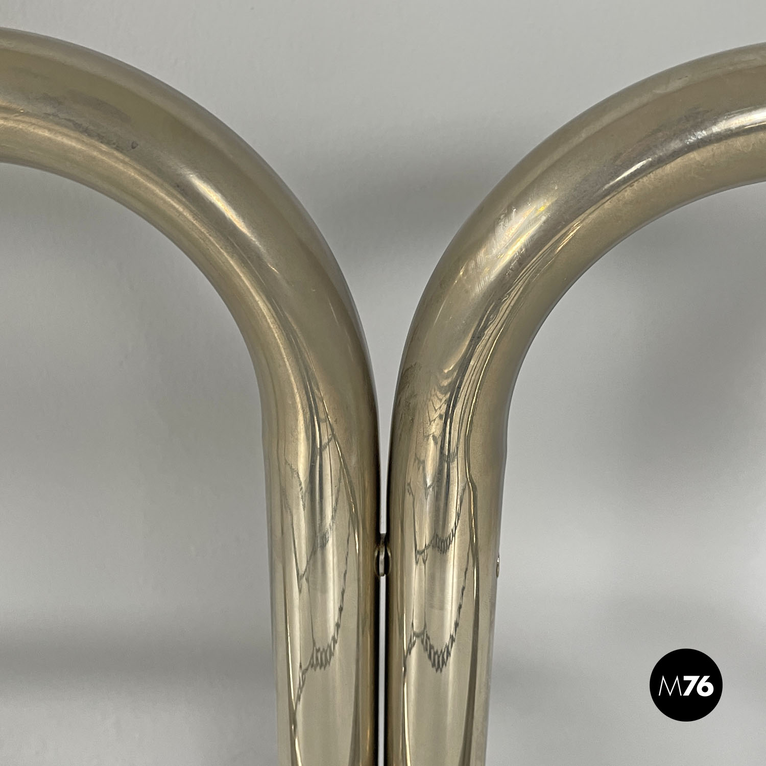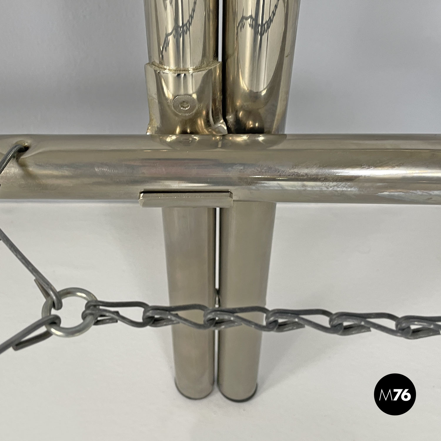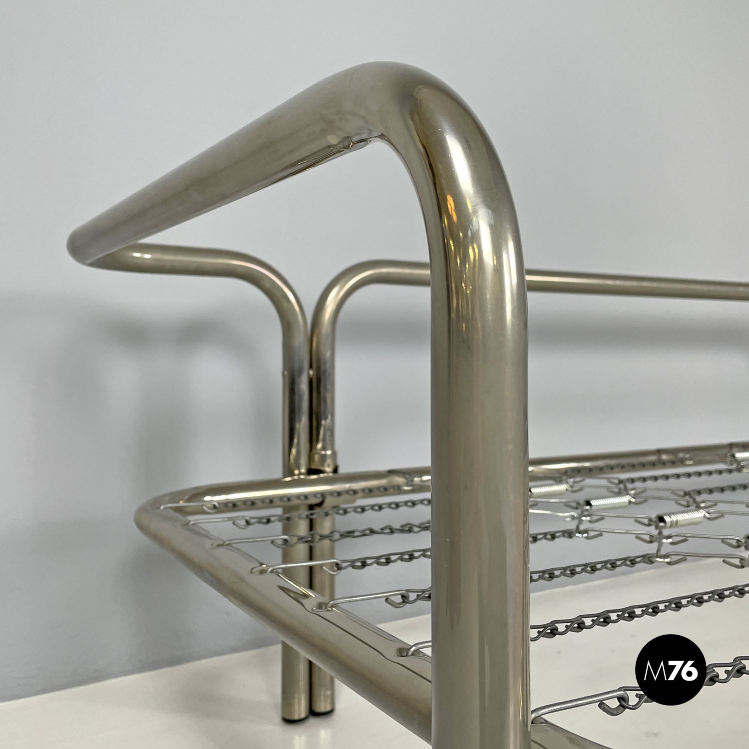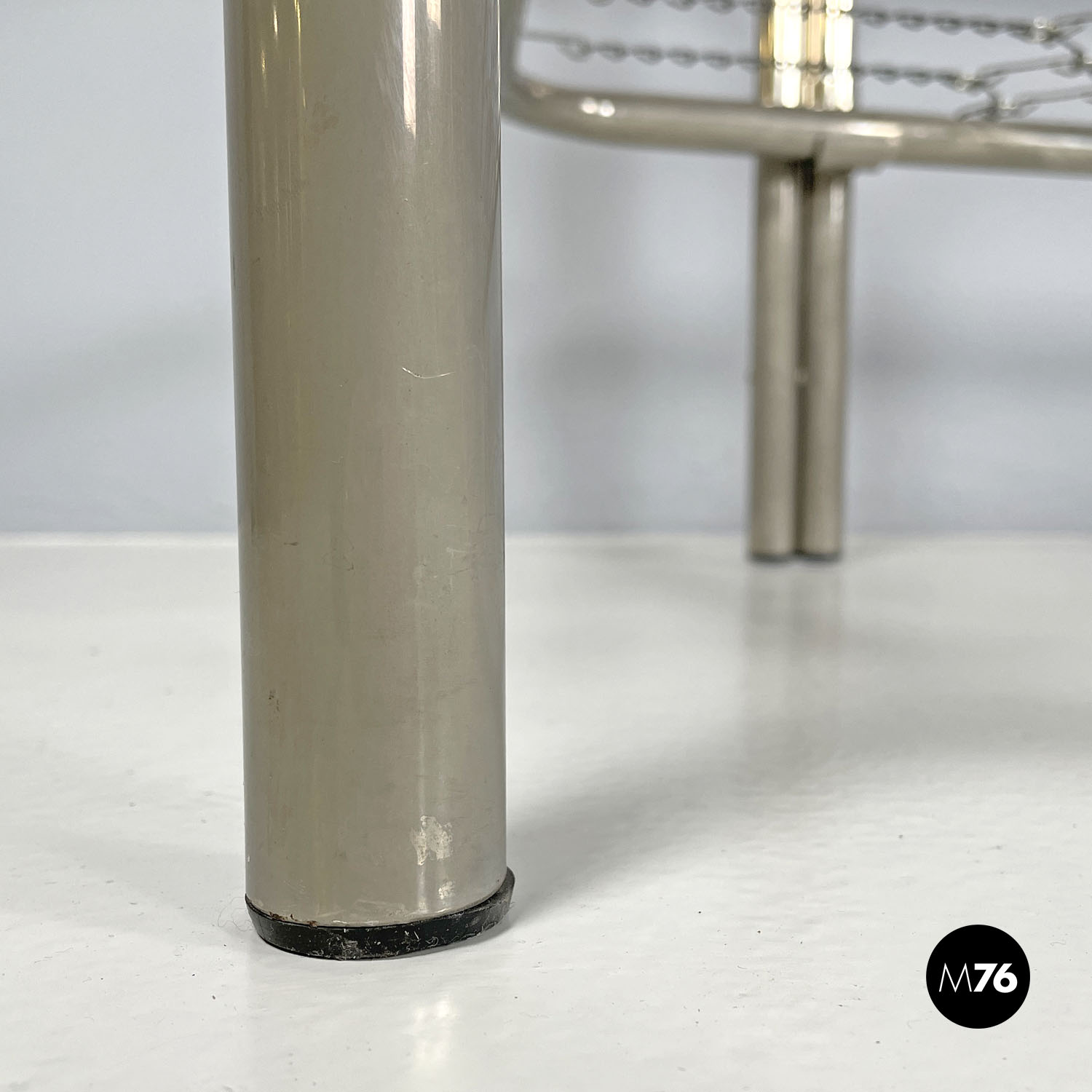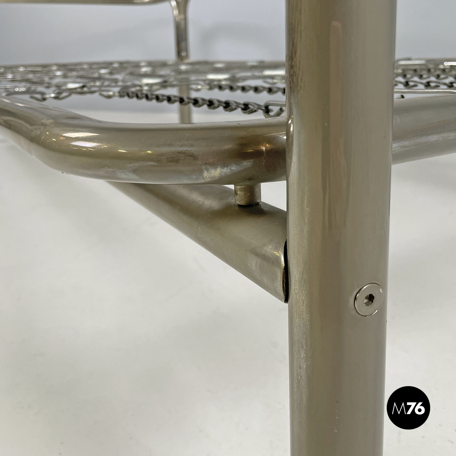 Daybed o letto modello Locus Solus con struttura in metallo cromato in patina. La struttura è interamente in tubolare, che si modella curvandosi a formare lo schienale e i braccioli. La seduta è composta da una rete metallica, perfetta per posizionare un materasso e renderlo un letto o un divano. Sul fronte presenta due zampe, sul retro quattro unite in due coppie.