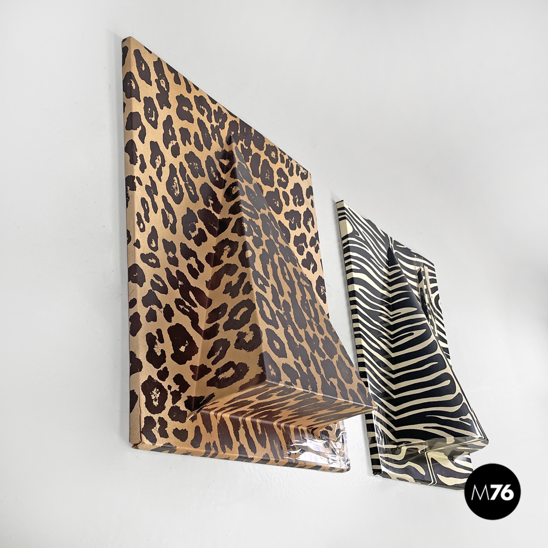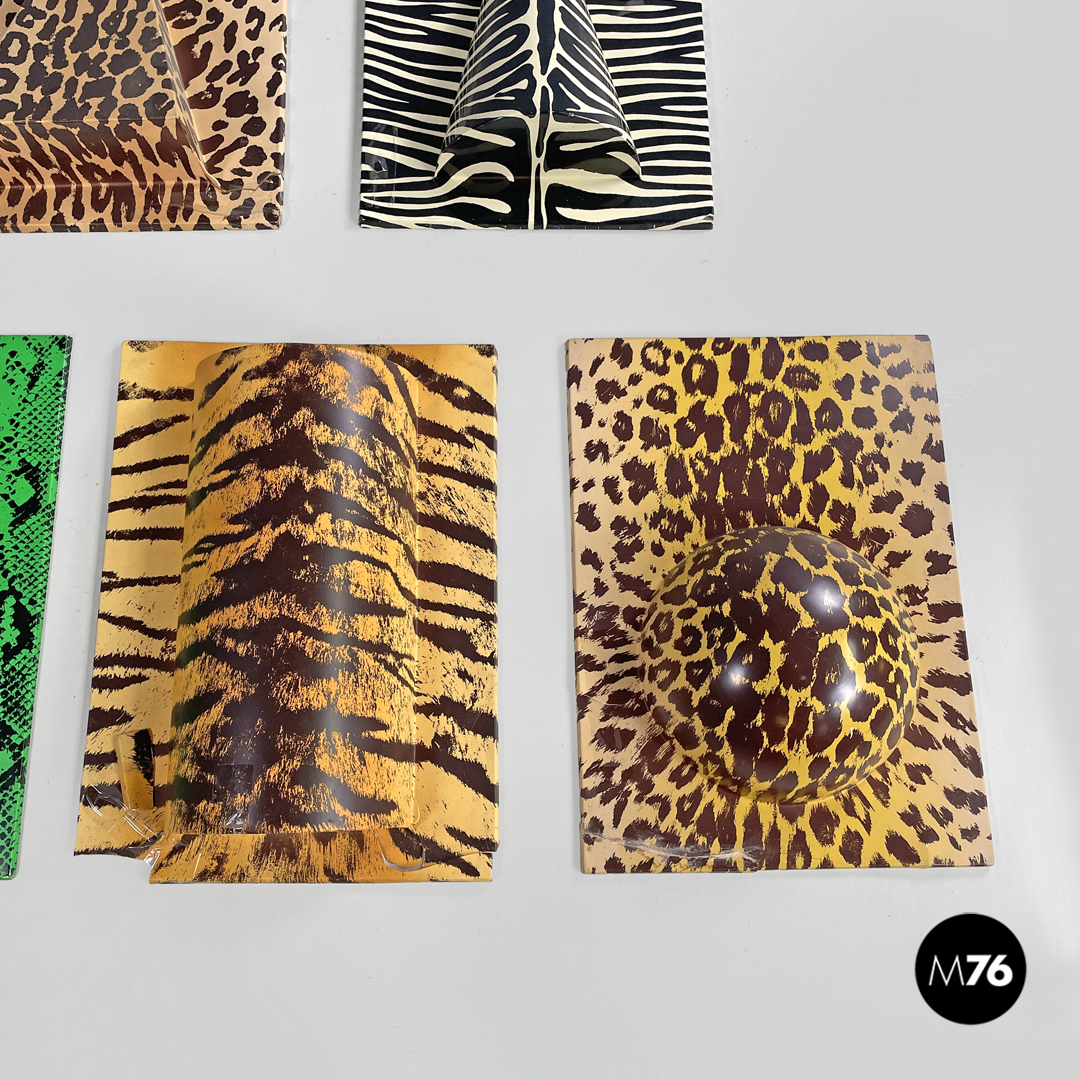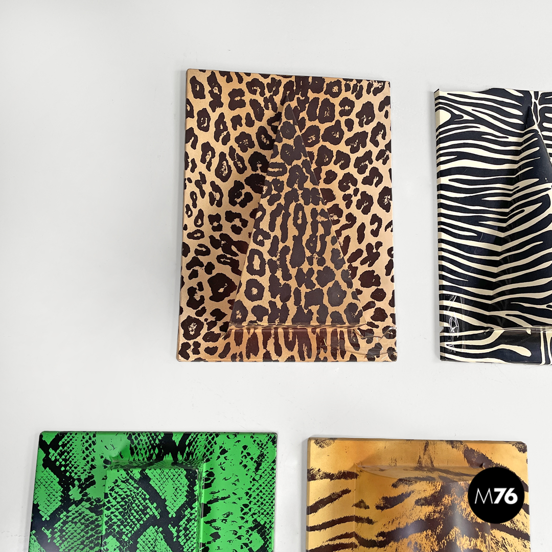 Decorazioni da parete modello Zoo Geometrico rettangolari in metacrilato con pattern in serigrafia. La composizione è composta da cinque moduli, ognuno con un pattern, un colore e una forma geometrica in rilievo diversa. I pattern sono tutti appartenenti al mondo animale, si trovano infatti trame leopardate, zebrate e a pelle di serpente. I colori principali sono il nero, il bianco, i toni del marrone e il verde acceso.