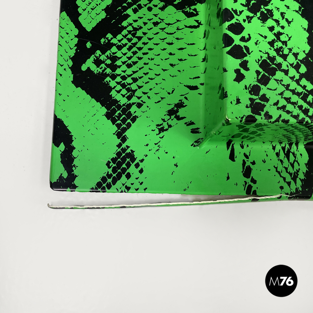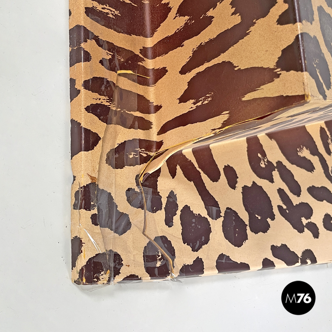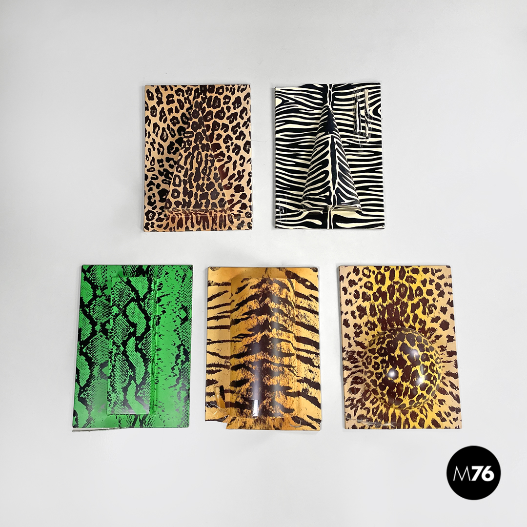 Decorazioni da parete modello Zoo Geometrico rettangolari in metacrilato con pattern in serigrafia. La composizione è composta da cinque moduli, ognuno con un pattern, un colore e una forma geometrica in rilievo diversa. I pattern sono tutti appartenenti al mondo animale, si trovano infatti trame leopardate, zebrate e a pelle di serpente. I colori principali sono il nero, il bianco, i toni del marrone e il verde acceso.