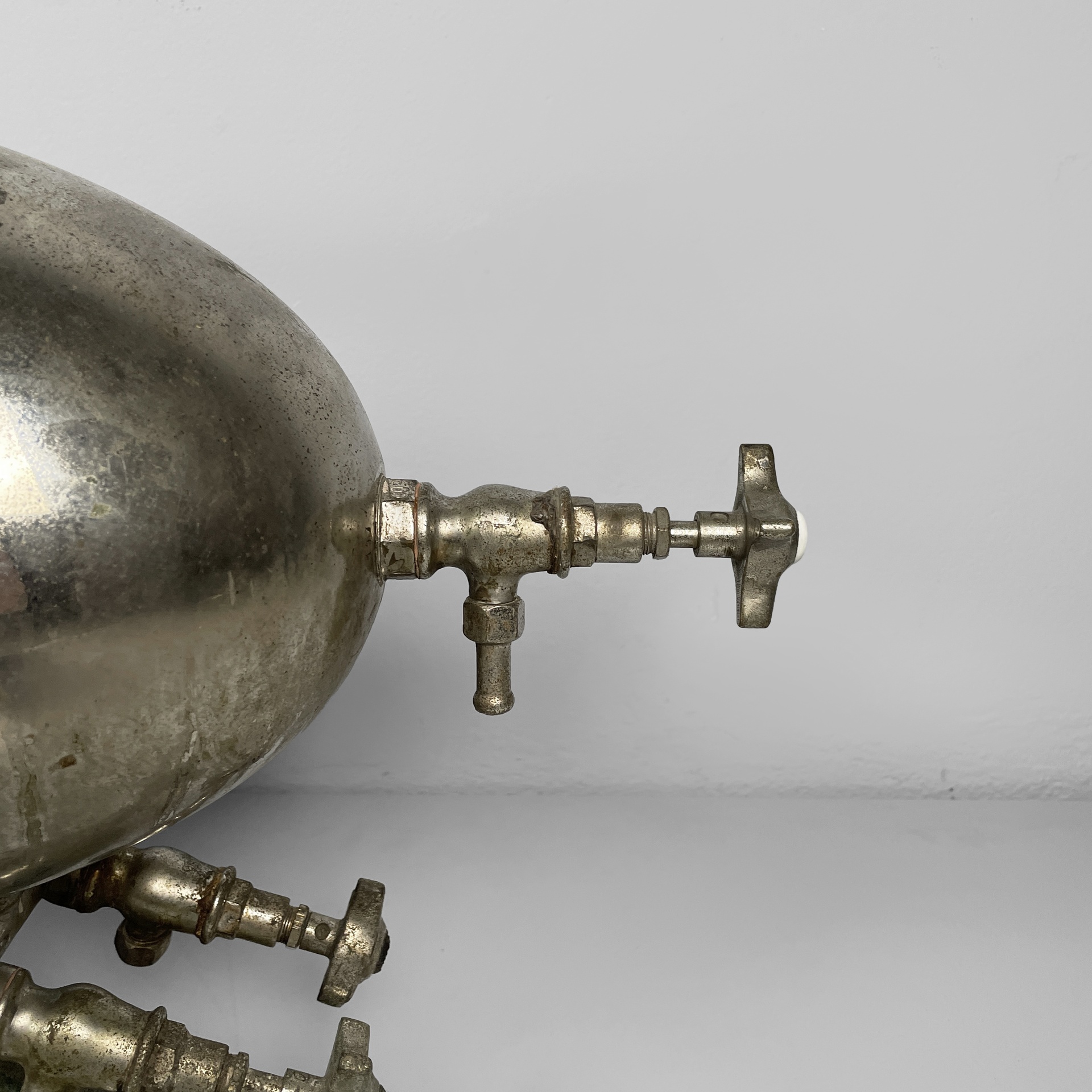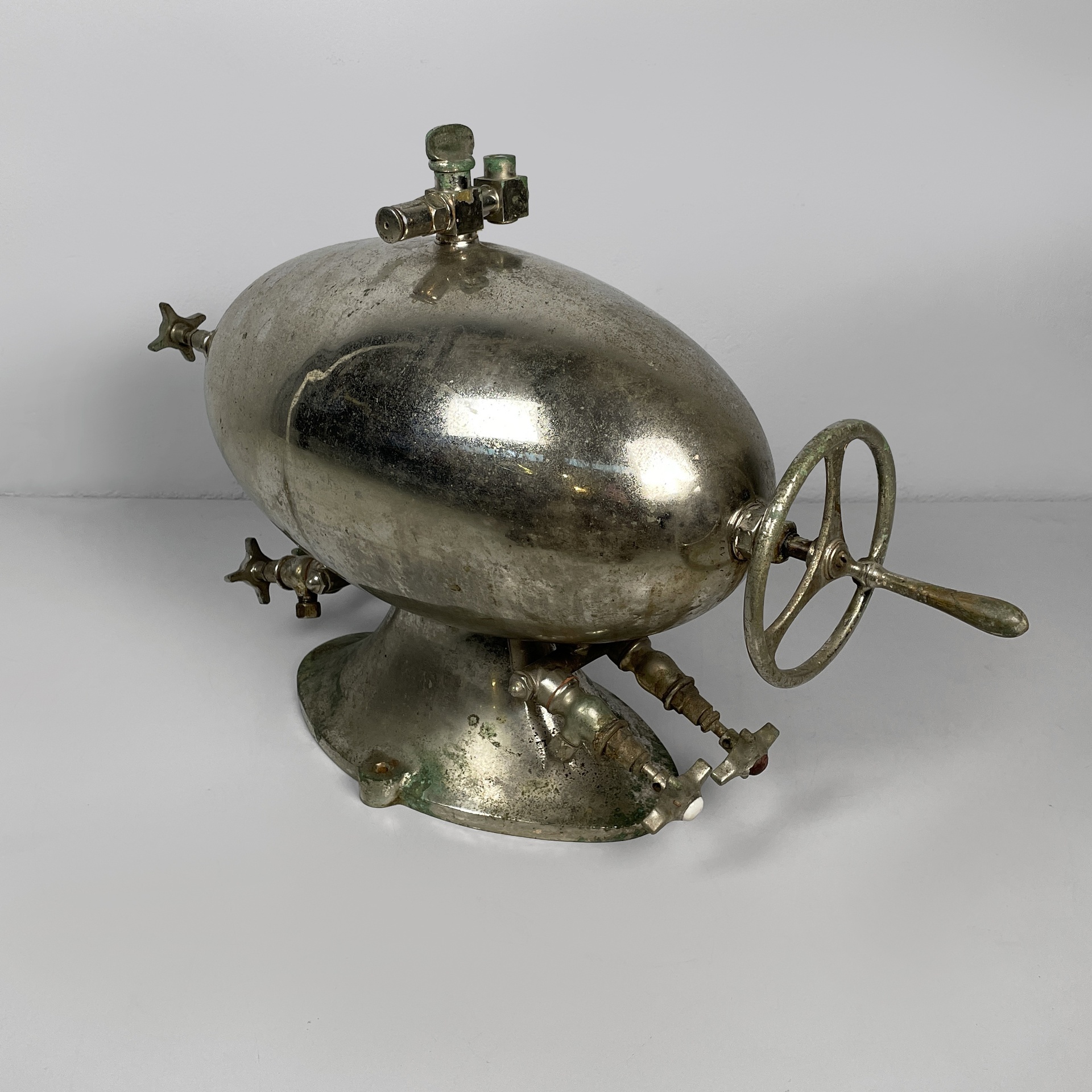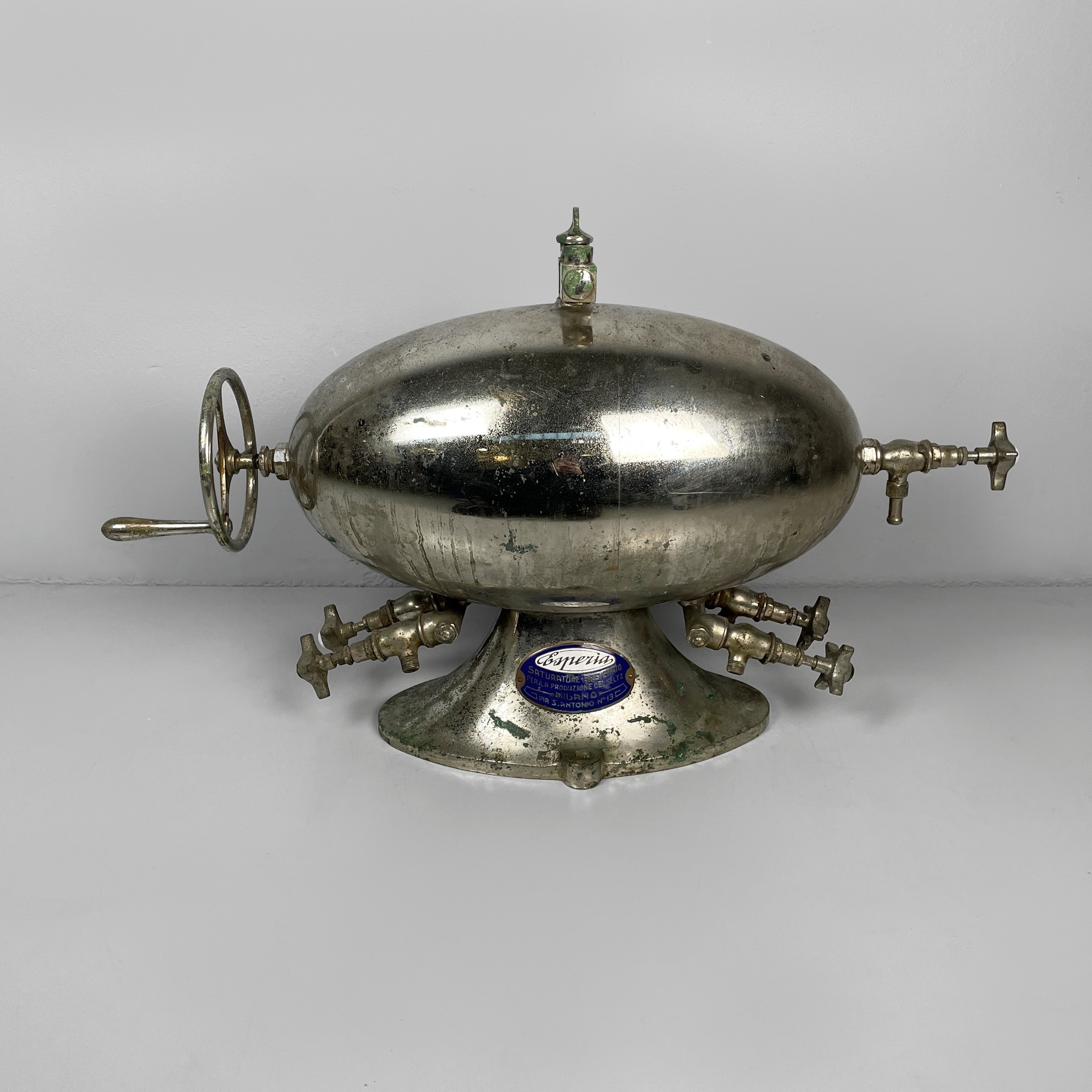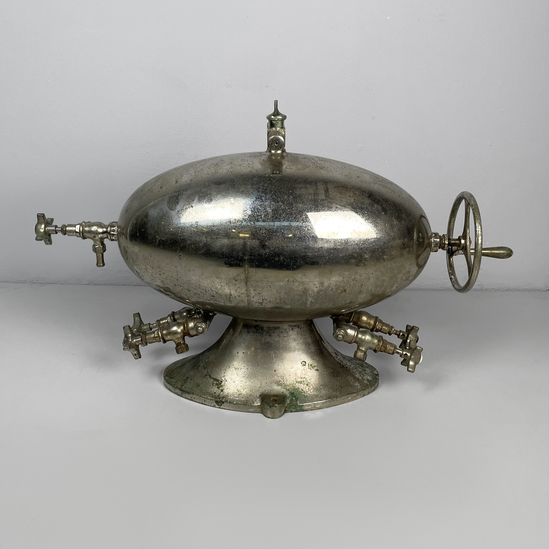Distributore di selz o bevande in acciaio. Il distributore è di forma ovale con base tonda. Sul lato è presente una manovella rotonda, mentre sui vari lati sono presenti i vari attacchi per il tubi.