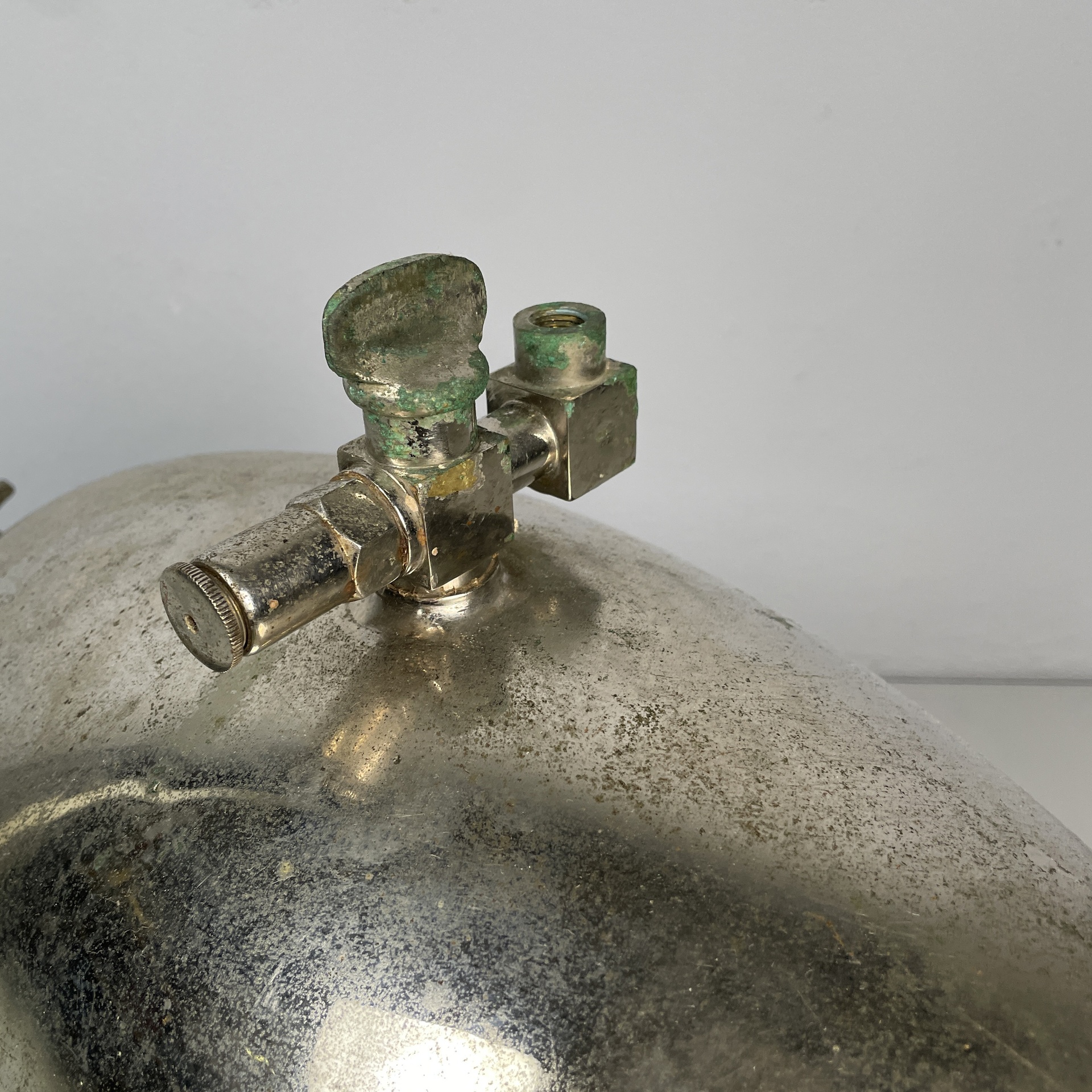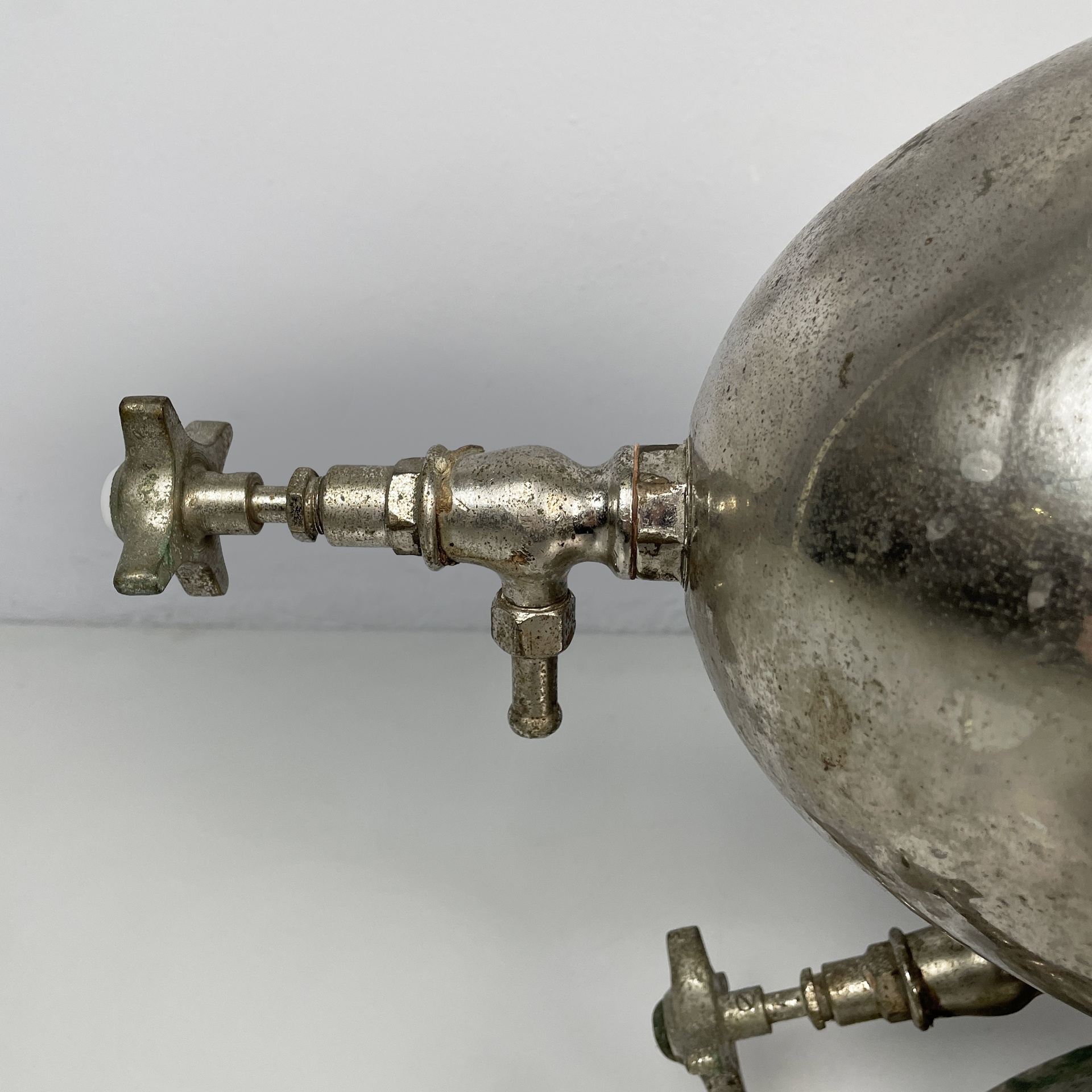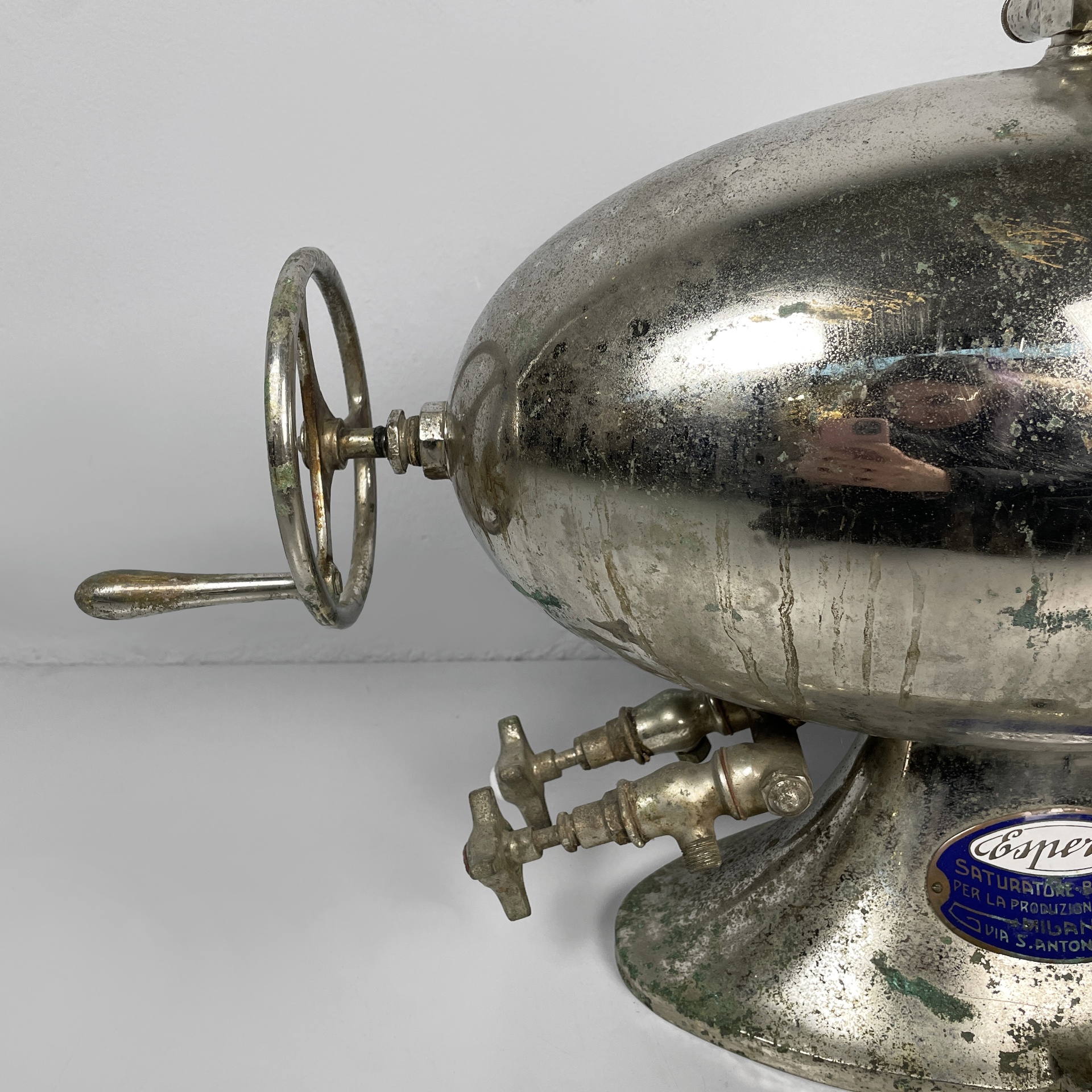 Distributore di selz o bevande in acciaio. Il distributore è di forma ovale con base tonda. Sul lato è presente una manovella rotonda, mentre sui vari lati sono presenti i vari attacchi per il tubi.