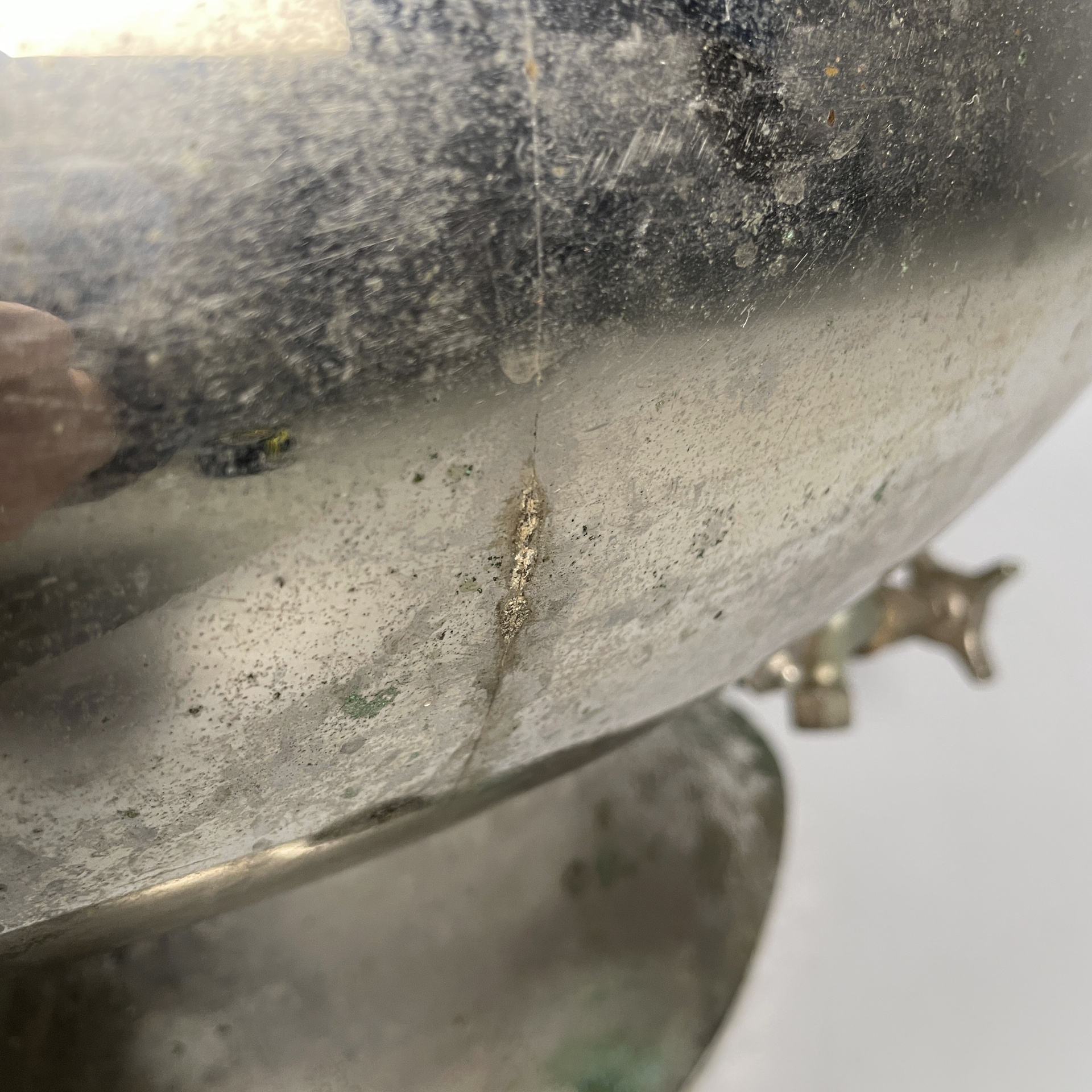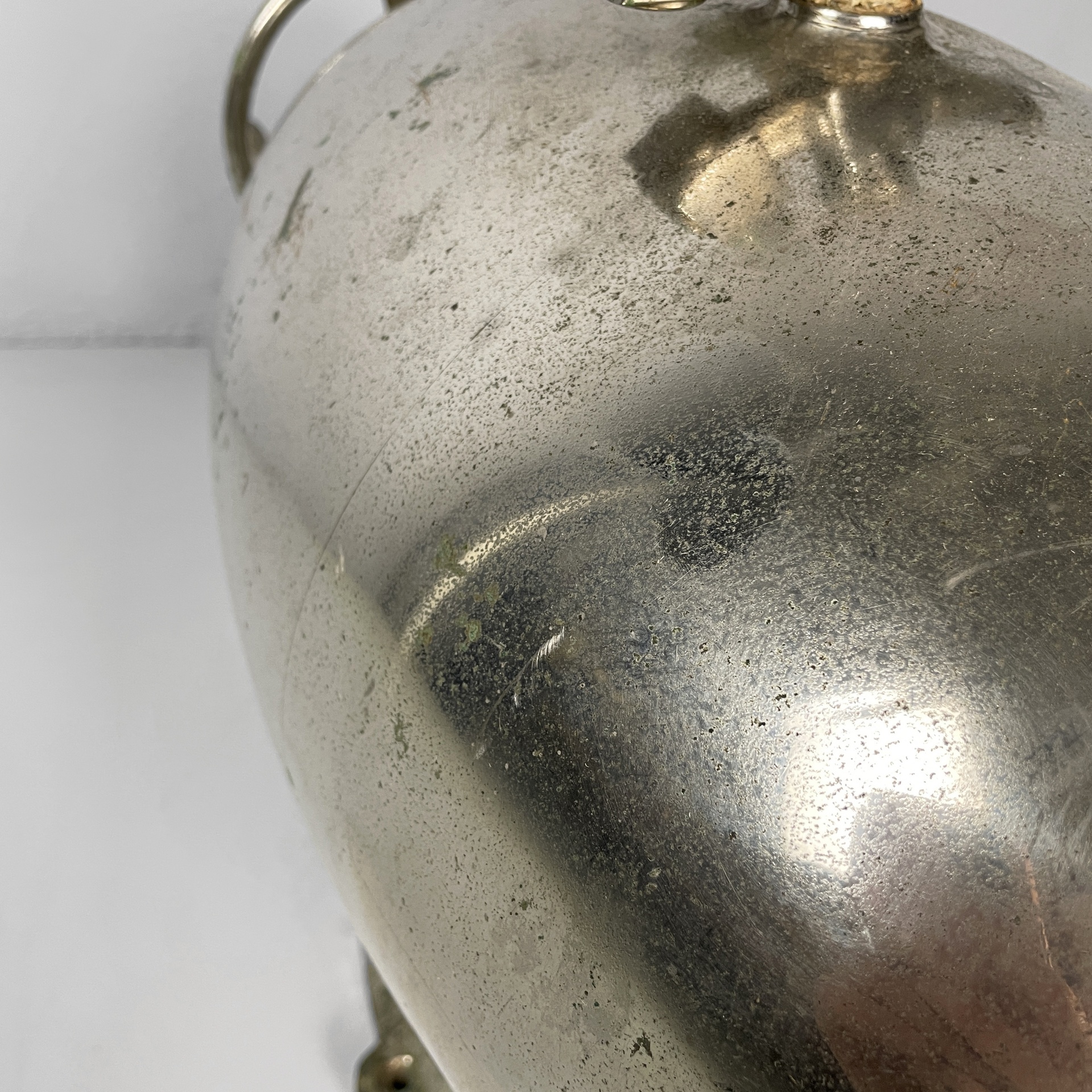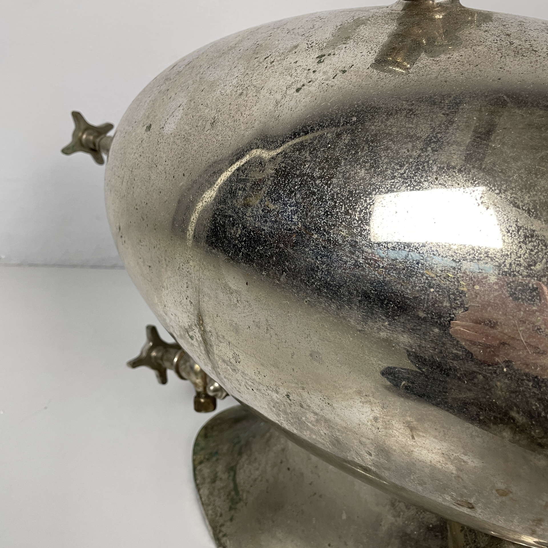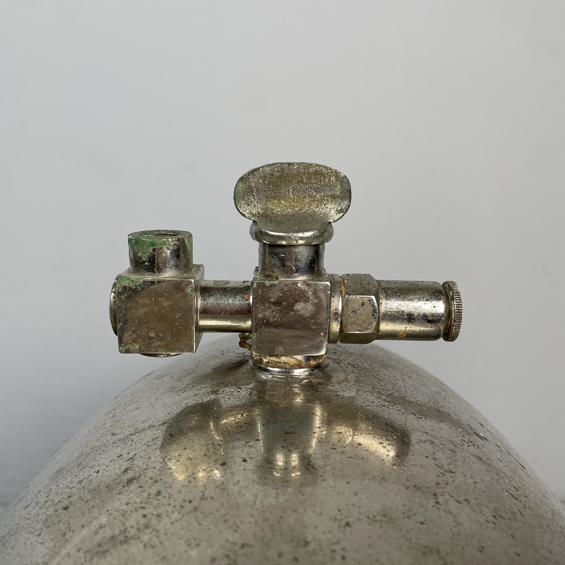 Distributore di selz o bevande in acciaio. Il distributore è di forma ovale con base tonda. Sul lato è presente una manovella rotonda, mentre sui vari lati sono presenti i vari attacchi per il tubi.