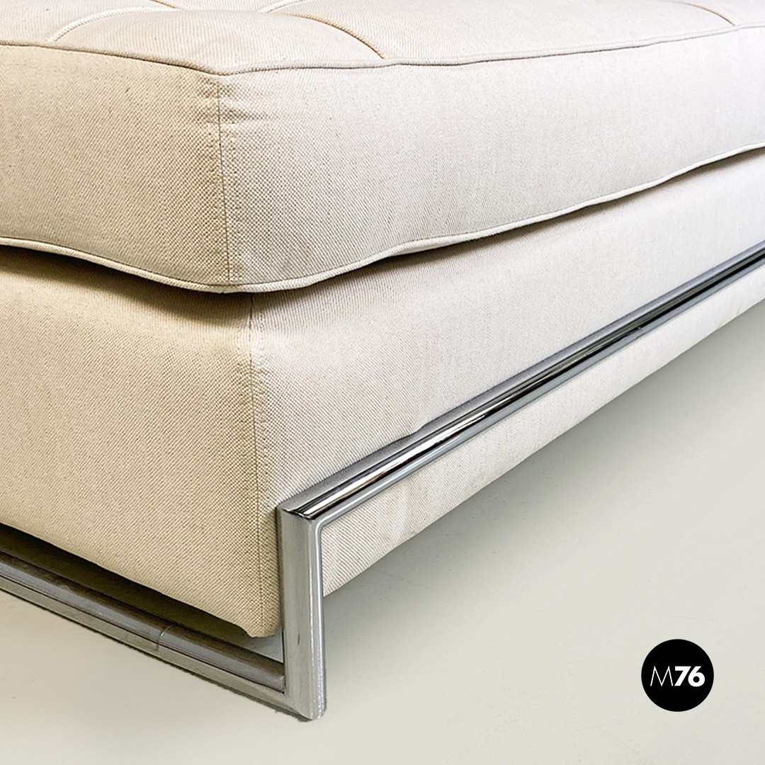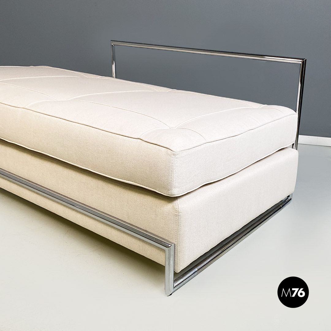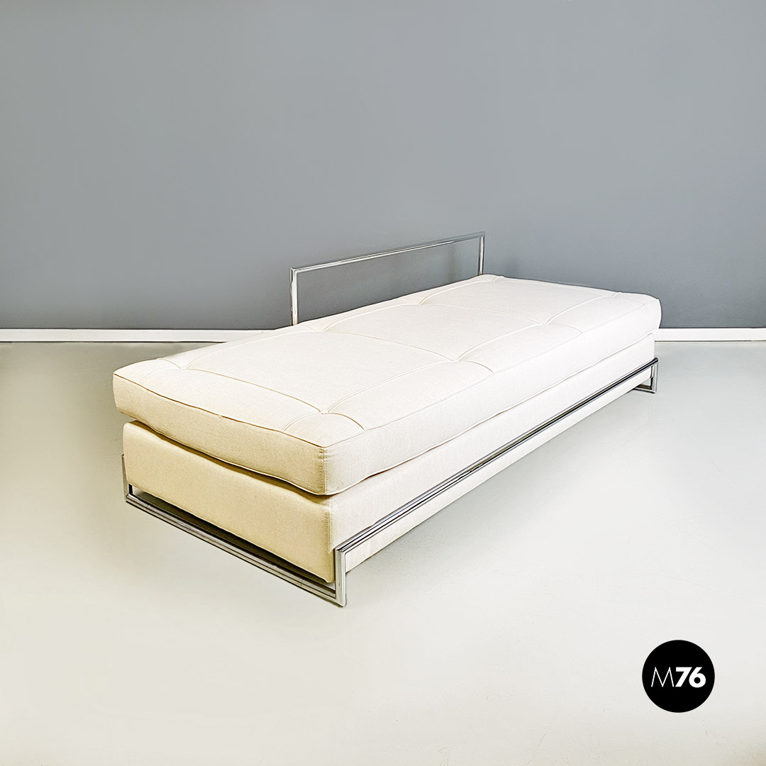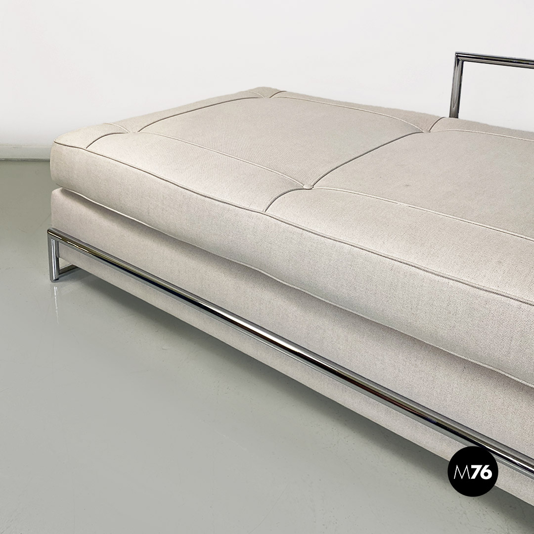 Divani o daybed gemelli dal disegno bauhaus con struttura in tubolare d’acciaio cromato, seduta imbottita e rivestita in cotone bianco ed impunture sulla seduta. Possibile acquistare anche il singolo divano.