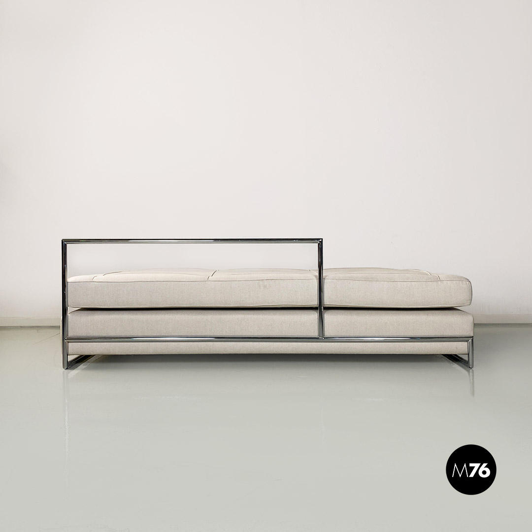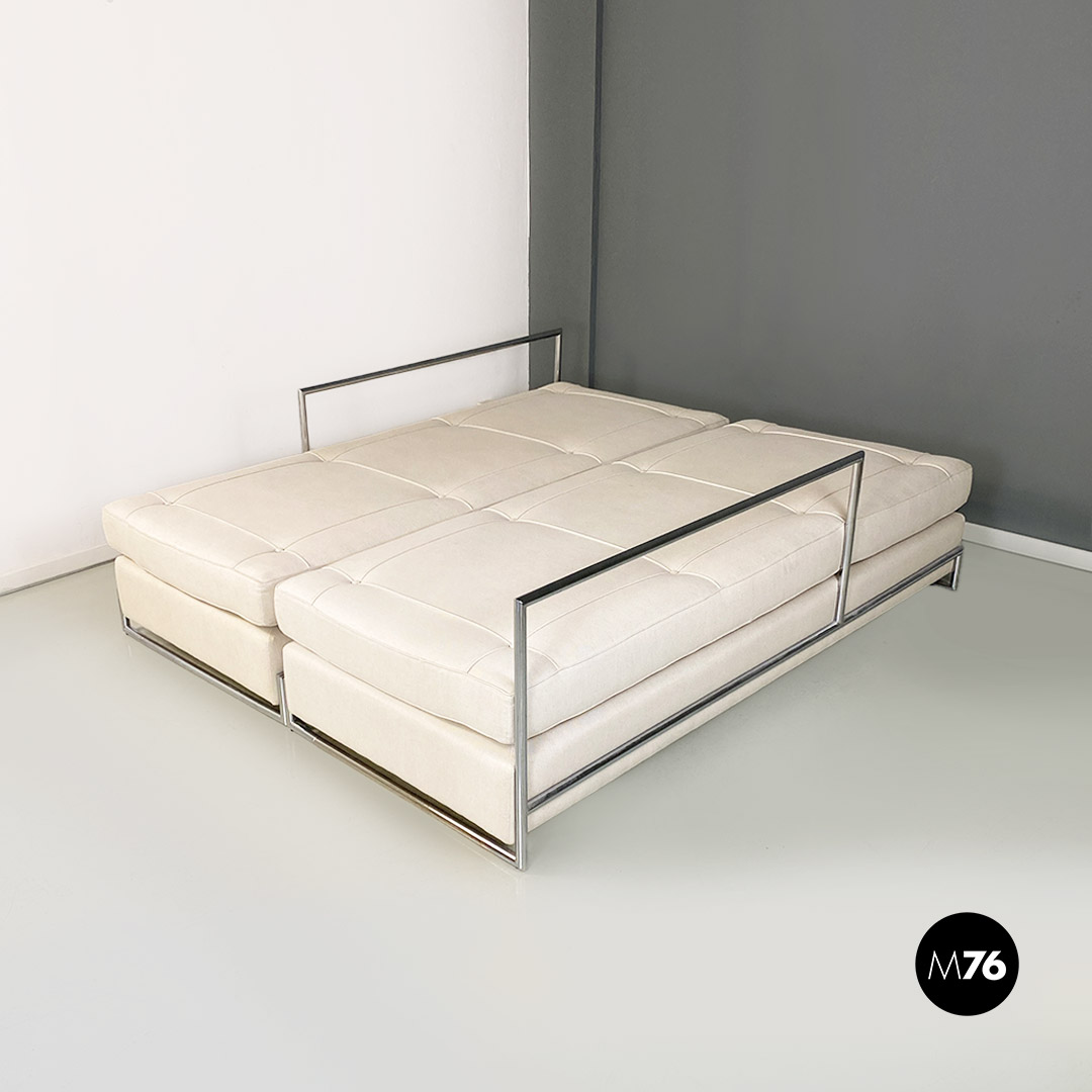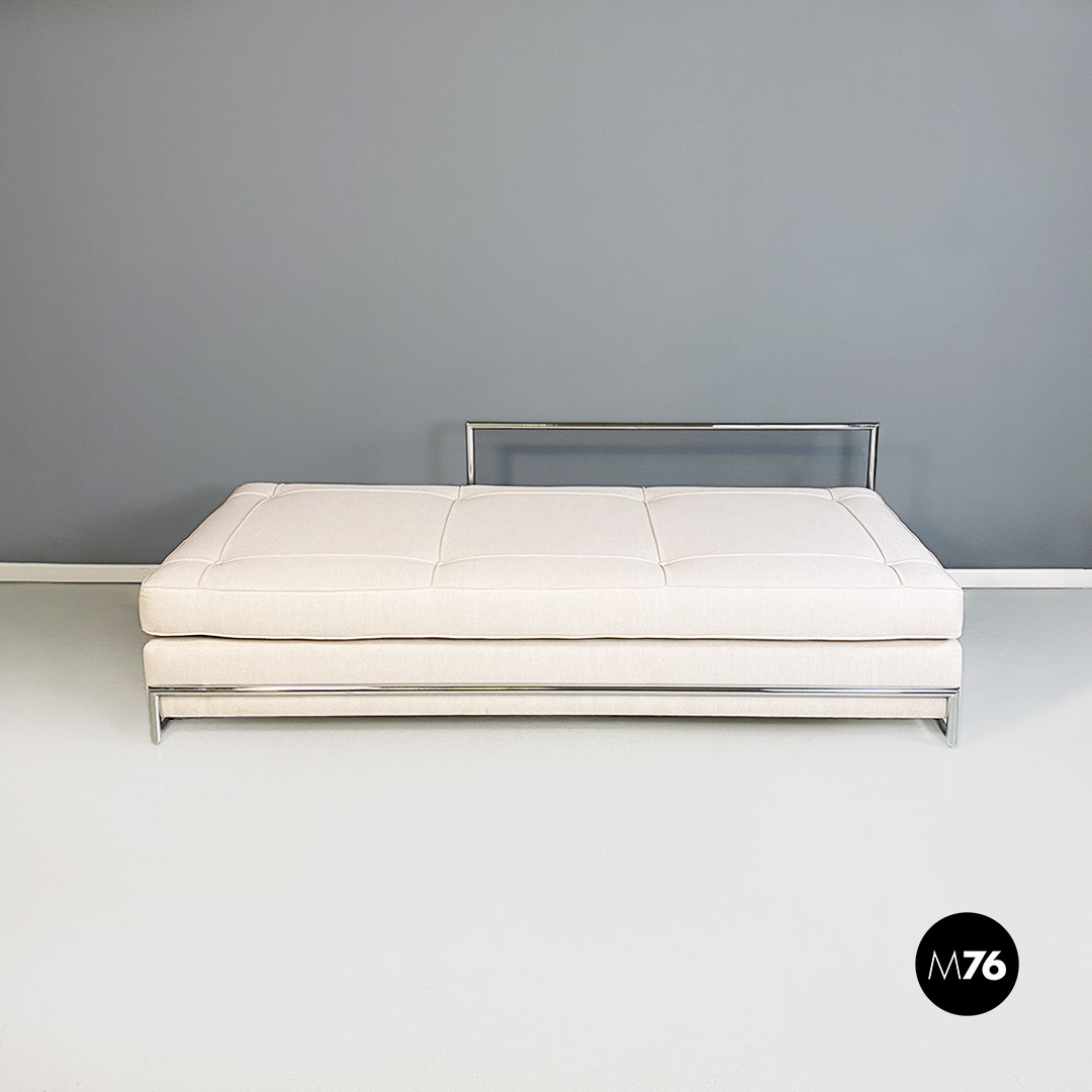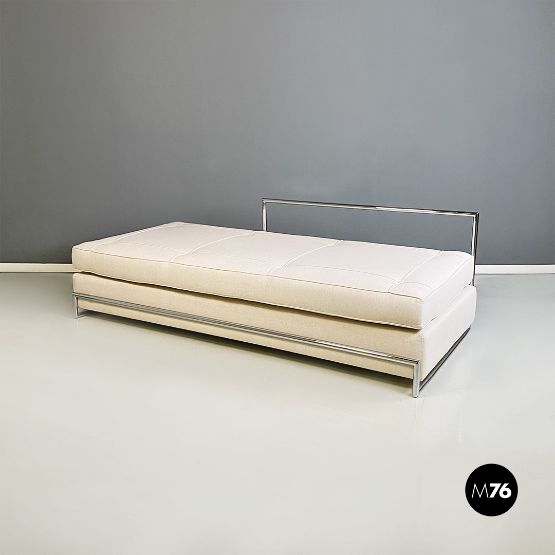 Divani o daybed gemelli dal disegno bauhaus con struttura in tubolare d’acciaio cromato, seduta imbottita e rivestita in cotone bianco ed impunture sulla seduta. Possibile acquistare anche il singolo divano.