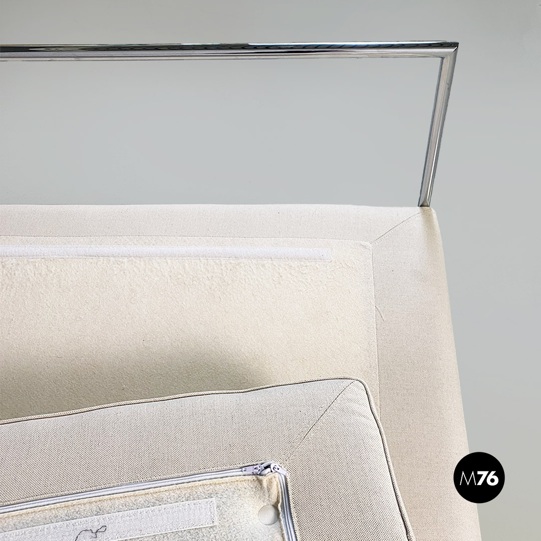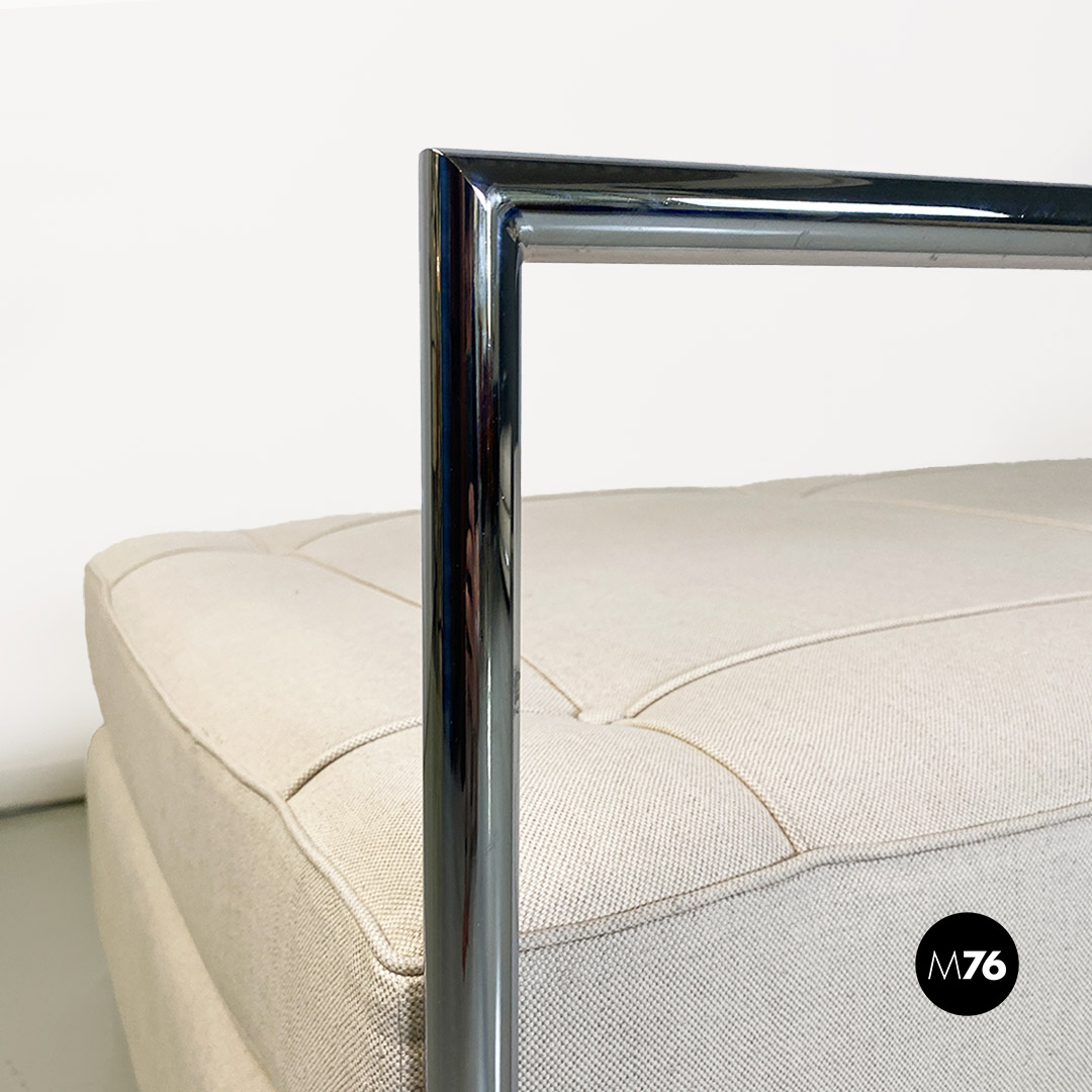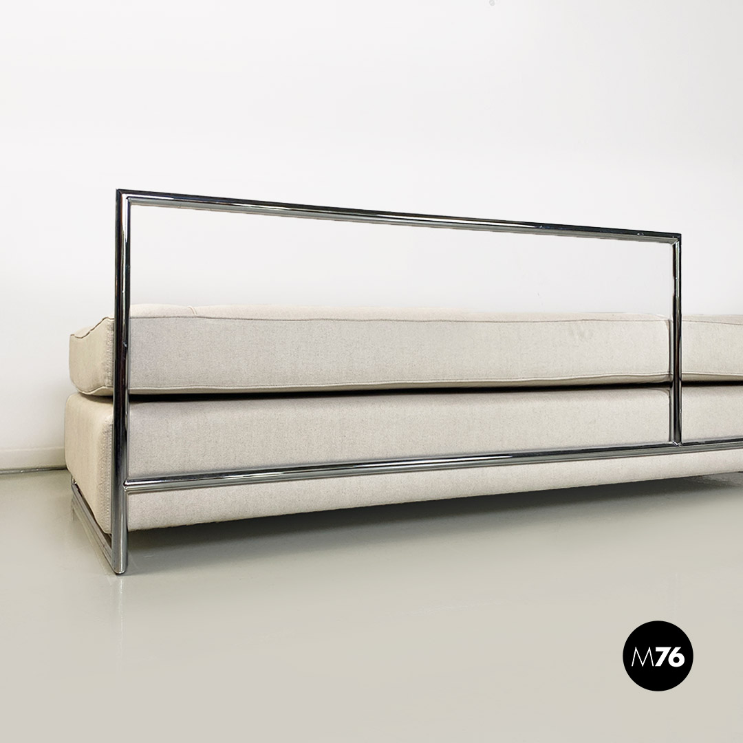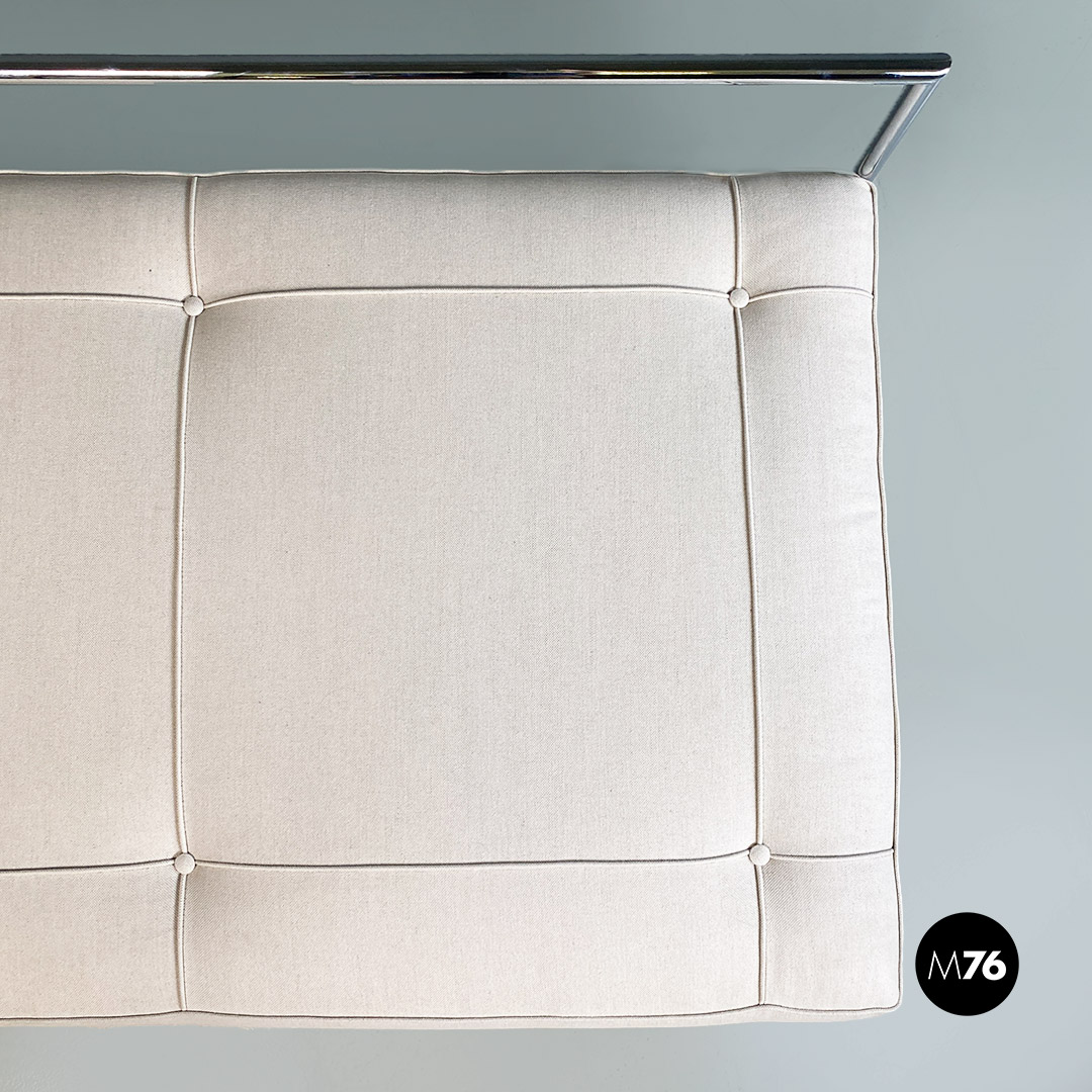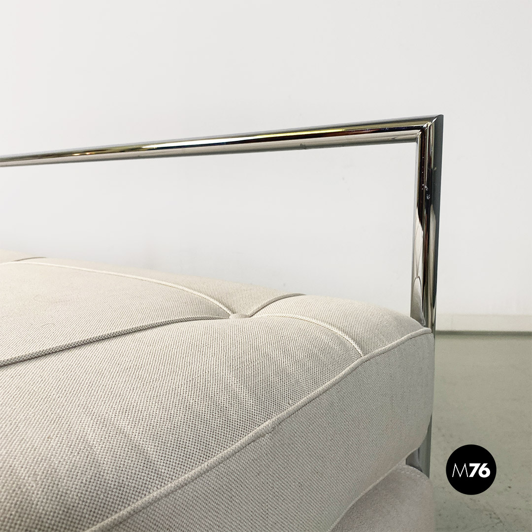 Divani o daybed gemelli dal disegno bauhaus con struttura in tubolare d’acciaio cromato, seduta imbottita e rivestita in cotone bianco ed impunture sulla seduta. Possibile acquistare anche il singolo divano.