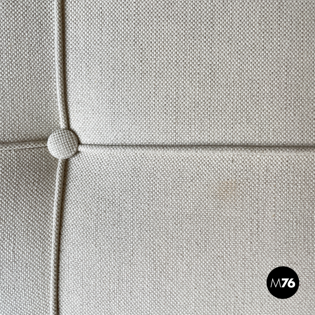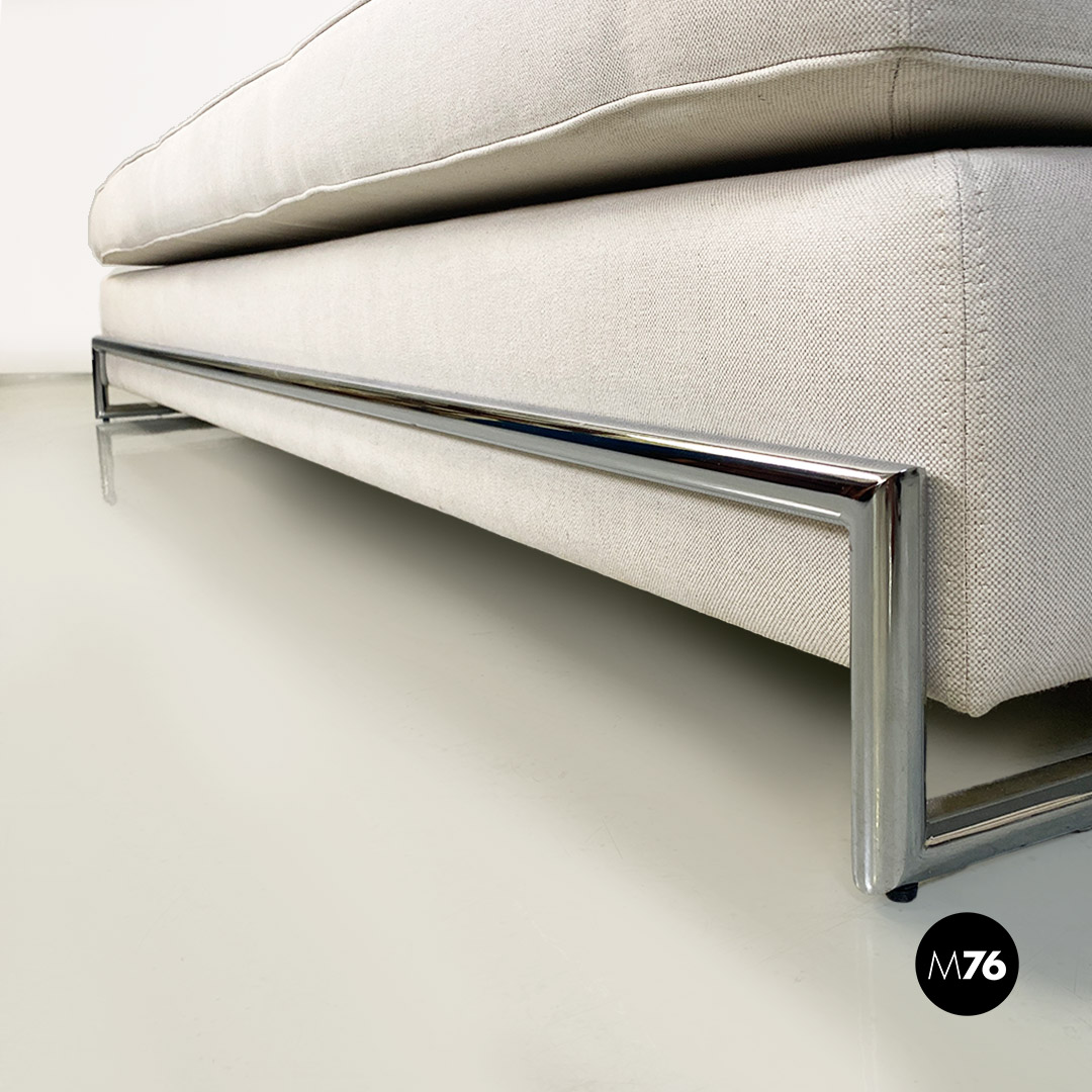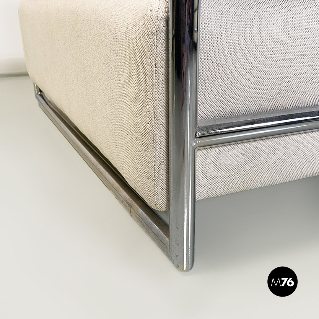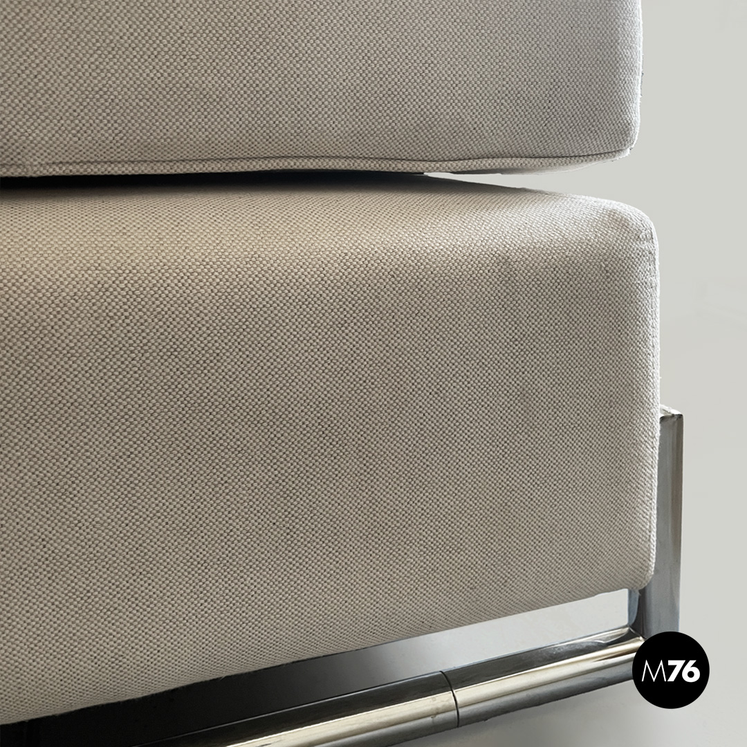 Divani o daybed gemelli dal disegno bauhaus con struttura in tubolare d’acciaio cromato, seduta imbottita e rivestita in cotone bianco ed impunture sulla seduta. Possibile acquistare anche il singolo divano.