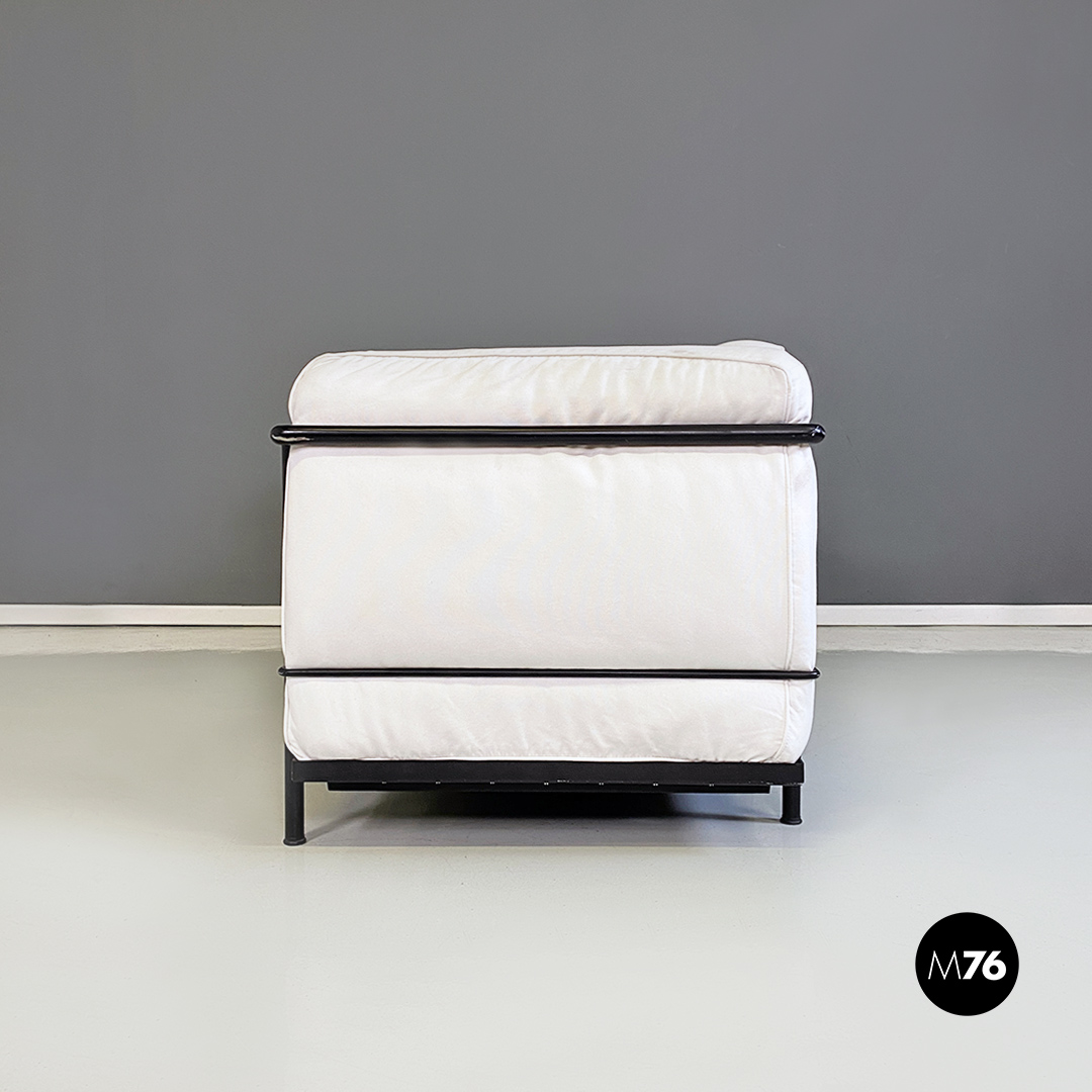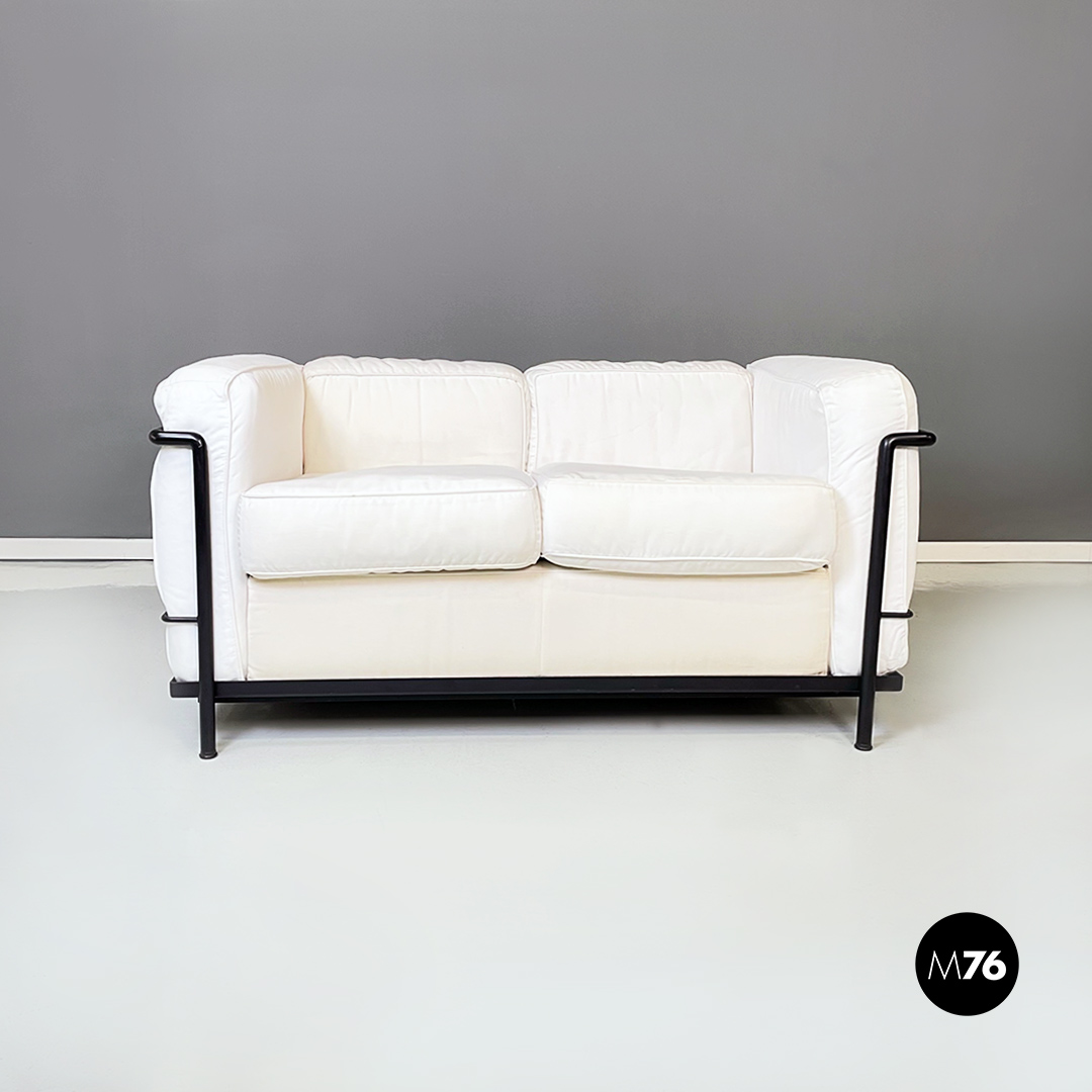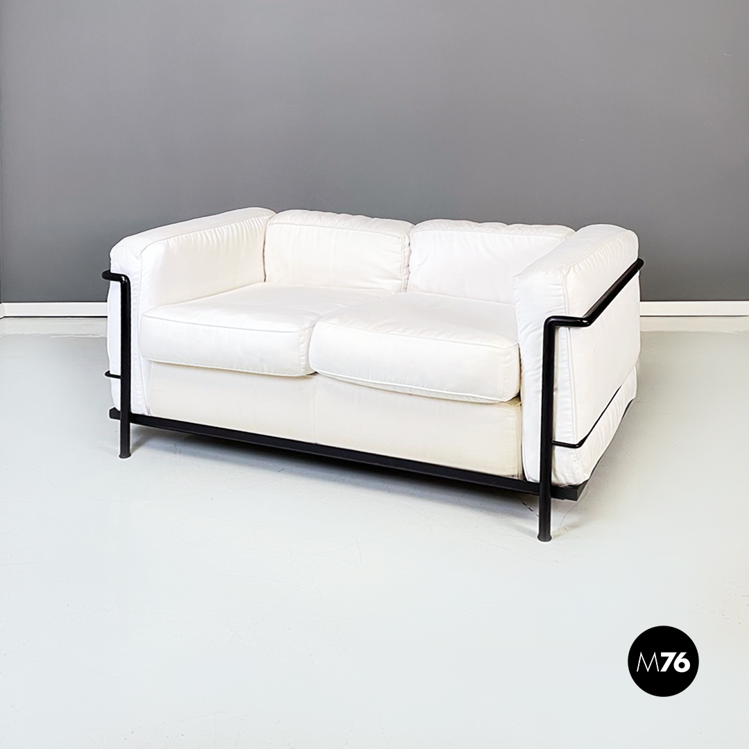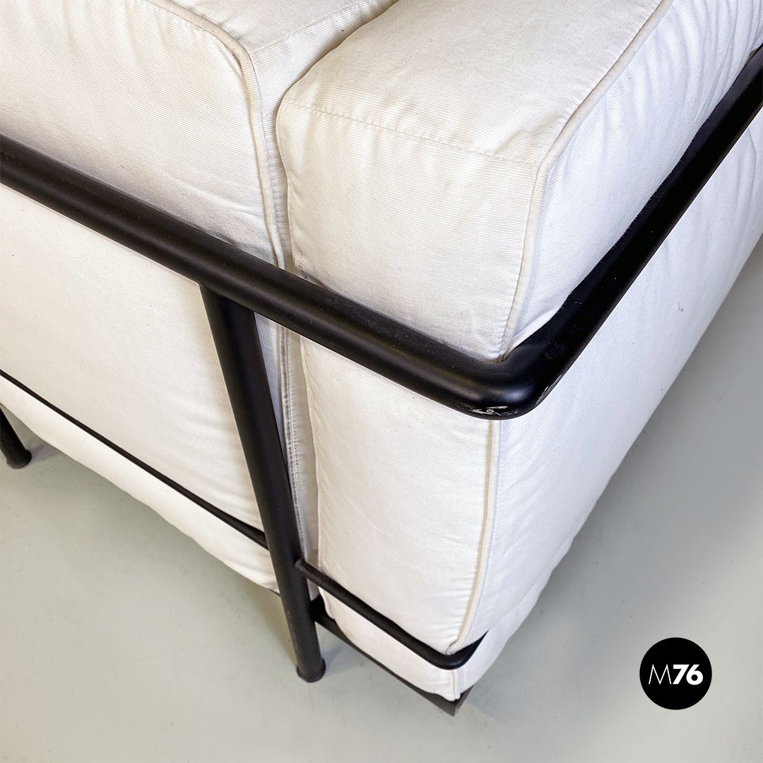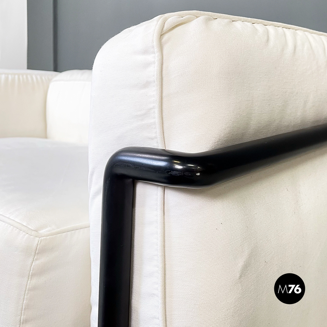 Coppia di divani modello LC2 da due e tre posti, con struttura in tubolare nero con finitura satinata e rivestimento interamente sfoderabile in tessuto di cotone bianco.