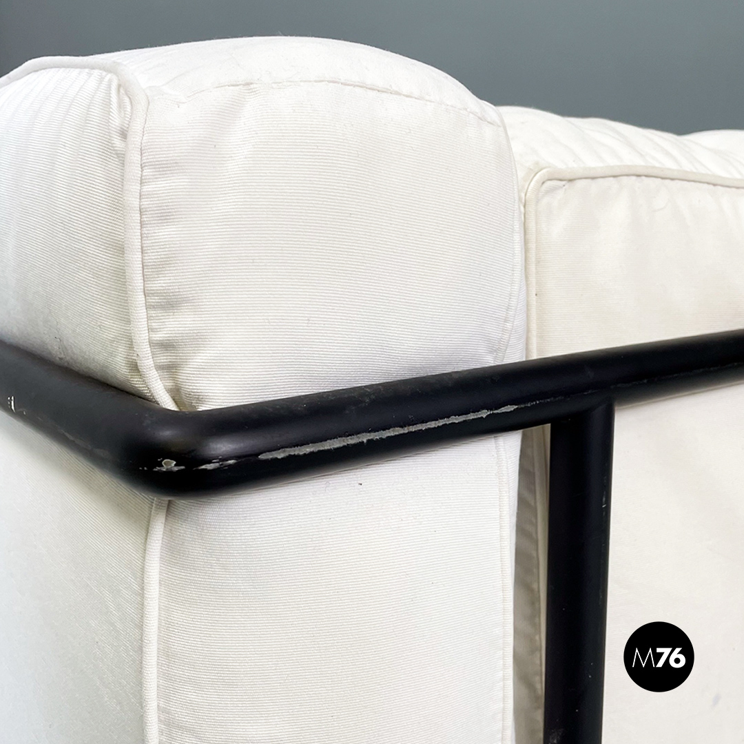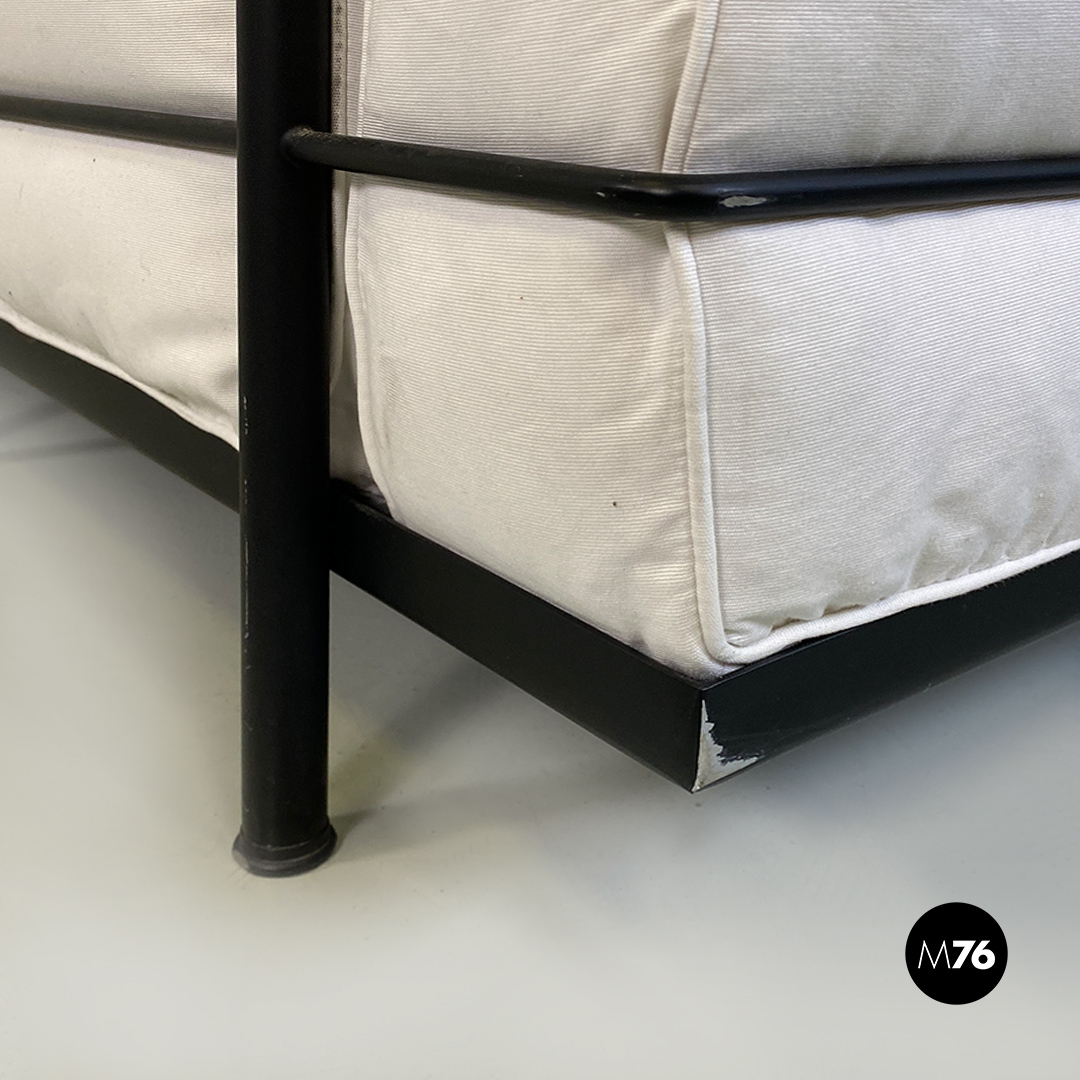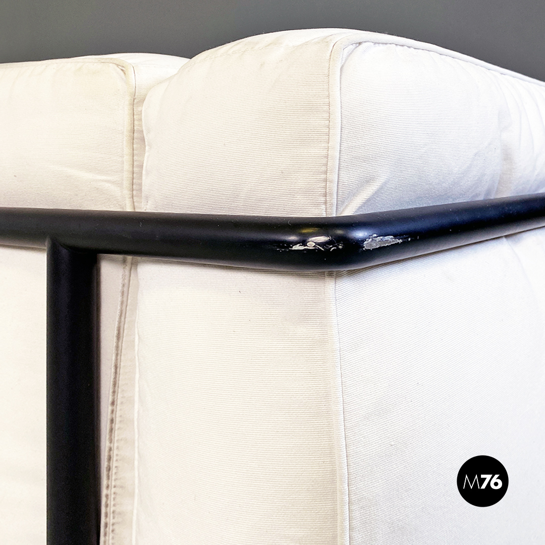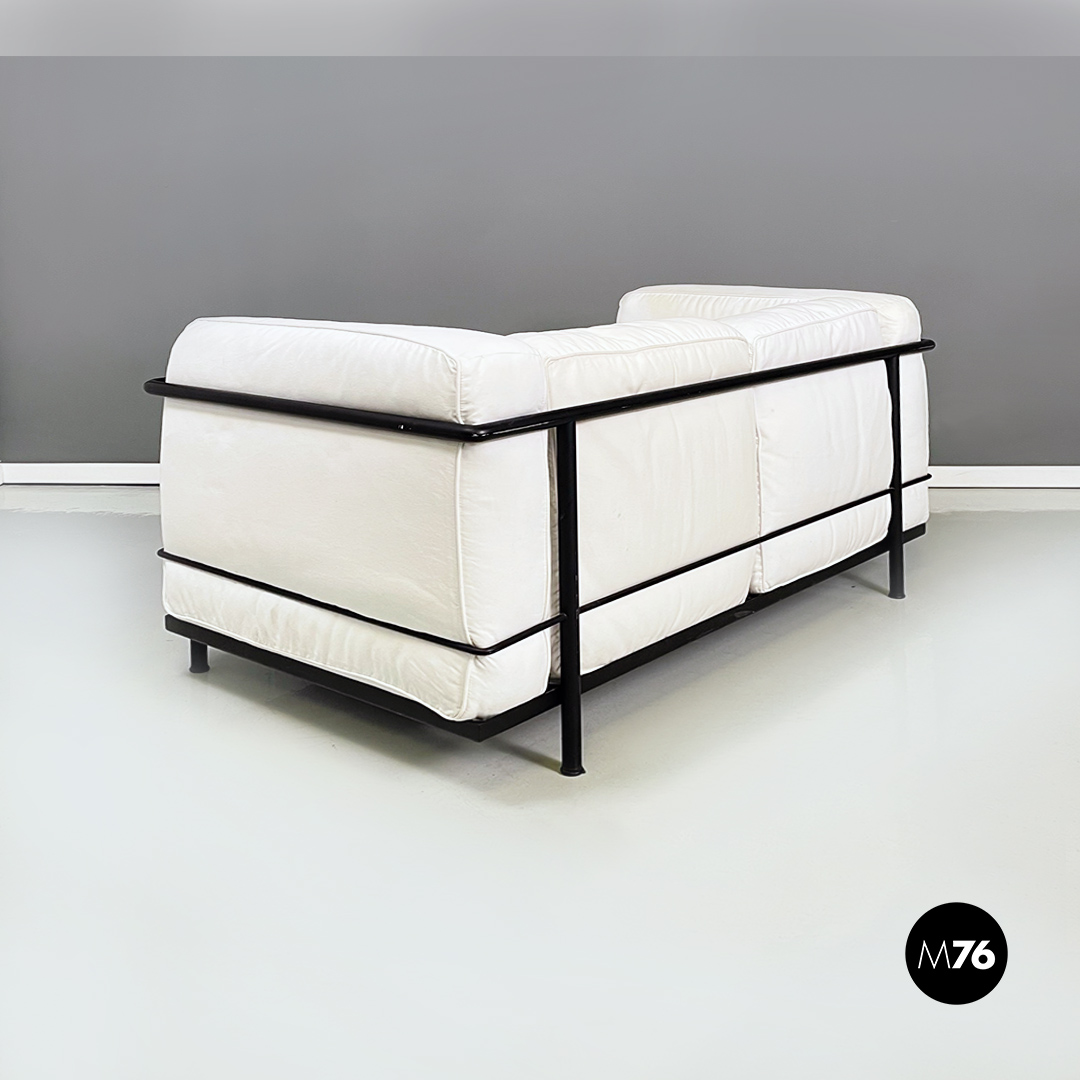 Coppia di divani modello LC2 da due e tre posti, con struttura in tubolare nero con finitura satinata e rivestimento interamente sfoderabile in tessuto di cotone bianco.