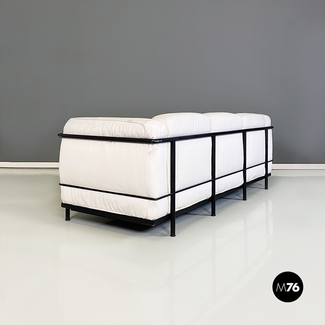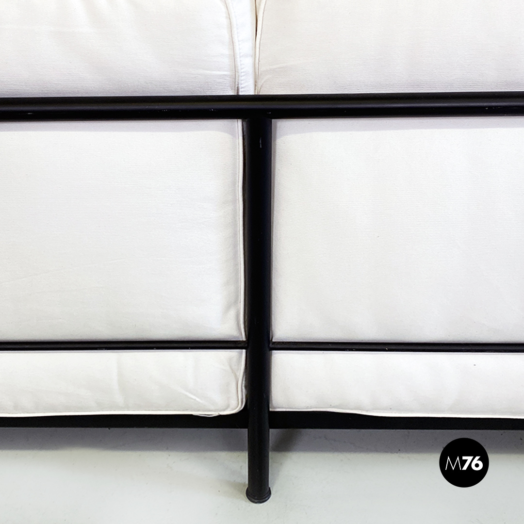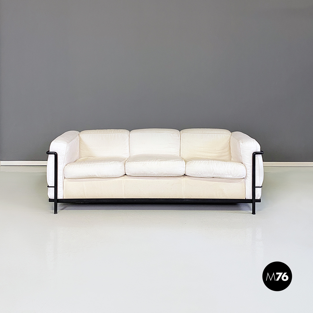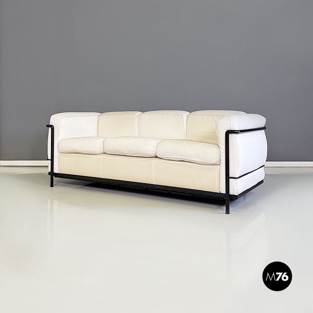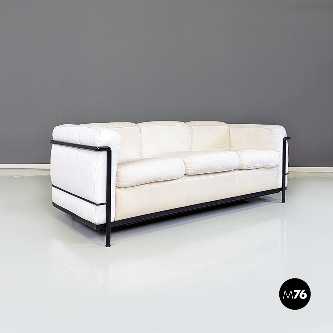 Coppia di divani modello LC2 da due e tre posti, con struttura in tubolare nero con finitura satinata e rivestimento interamente sfoderabile in tessuto di cotone bianco.