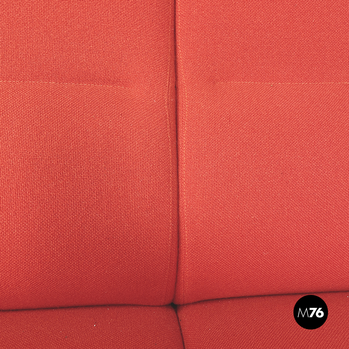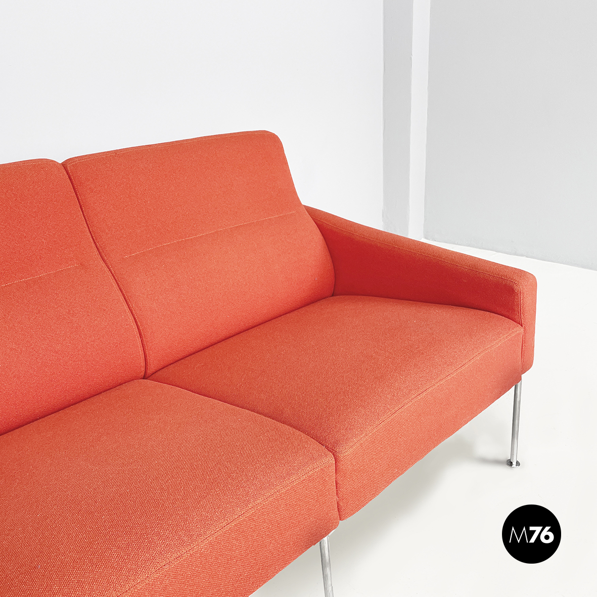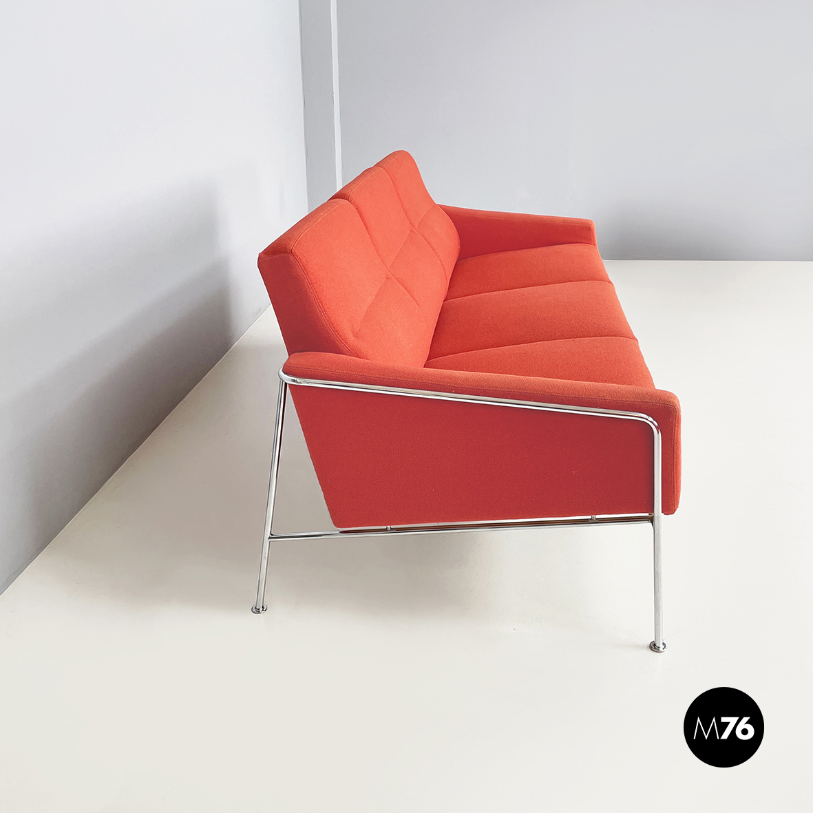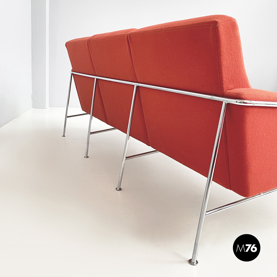 Divano a tre posti modello 3303 Airport con seduta e schienale squadrati imbottiti e rivestiti in tessuto rosso. Braccioli squadrati. La struttura è in tondino di metallo. Piedini tondi in metallo.