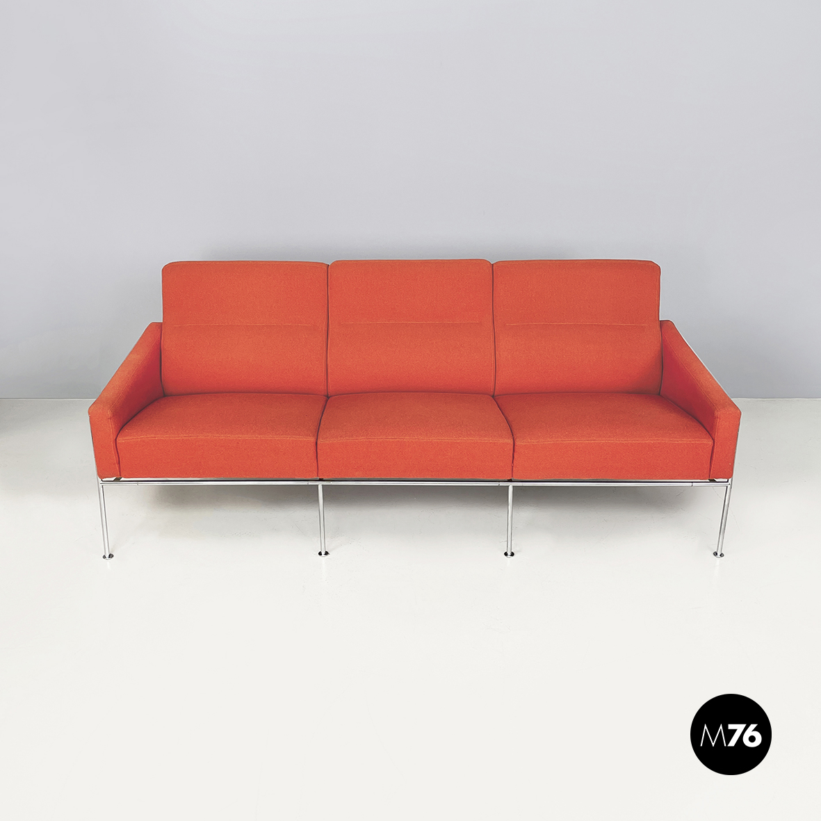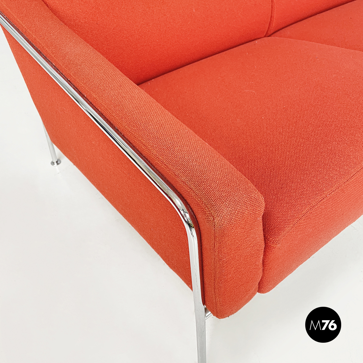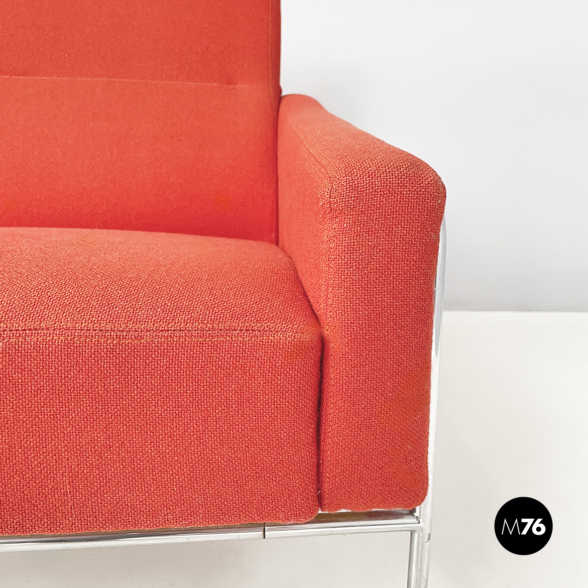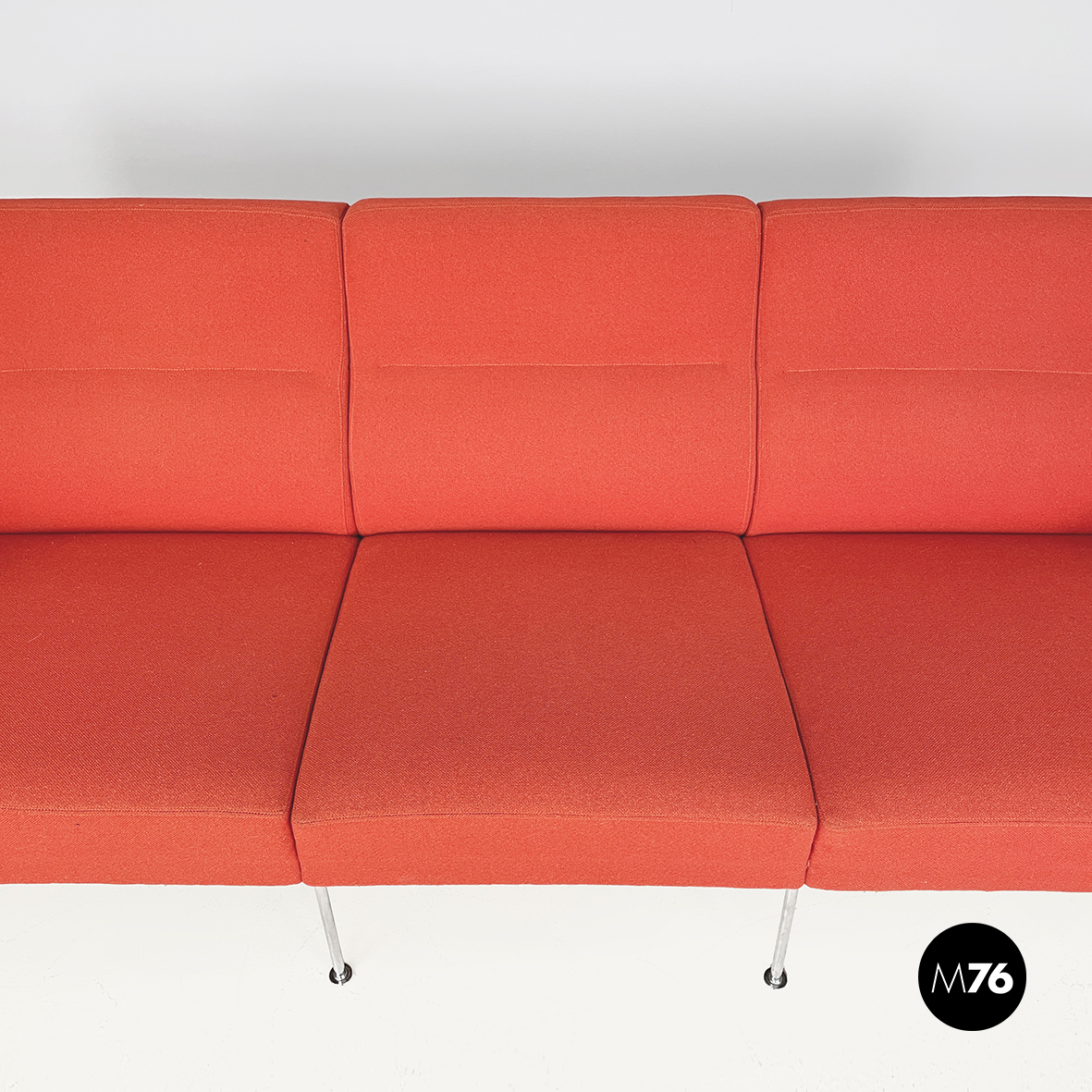 Divano a tre posti modello 3303 Airport con seduta e schienale squadrati imbottiti e rivestiti in tessuto rosso. Braccioli squadrati. La struttura è in tondino di metallo. Piedini tondi in metallo.