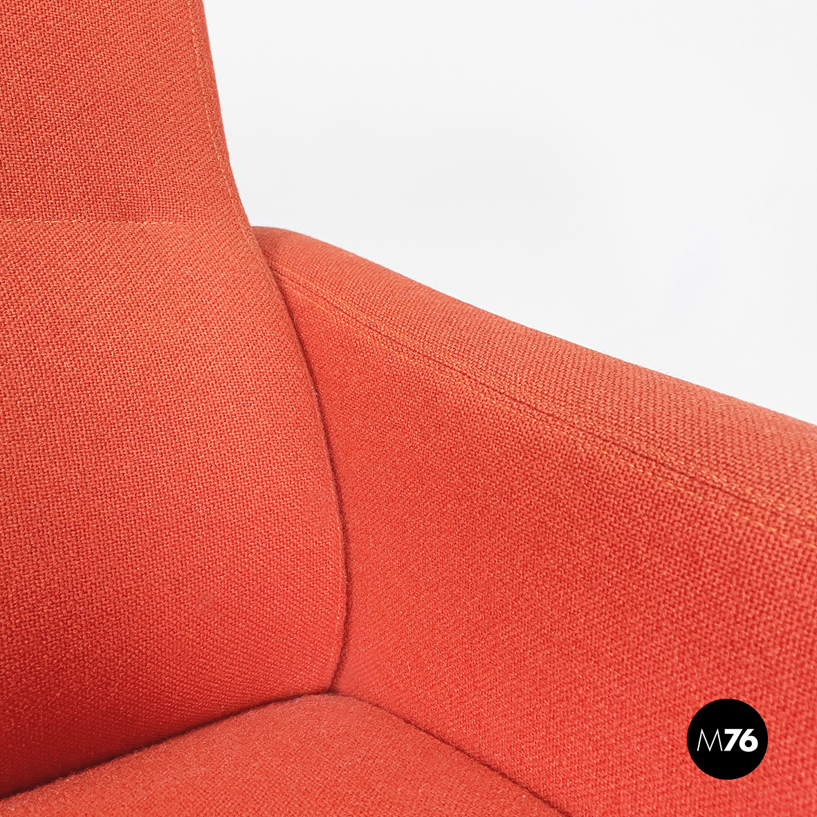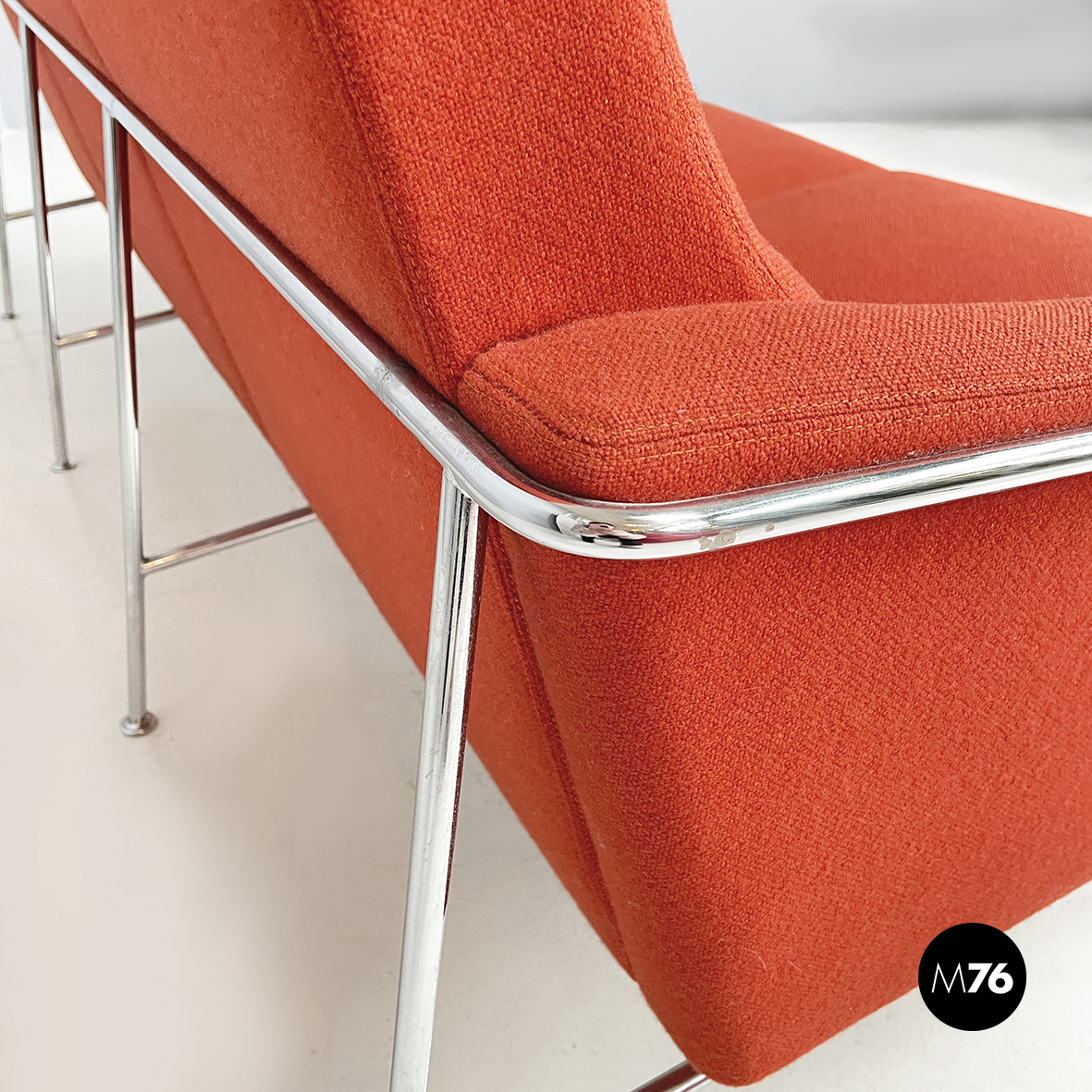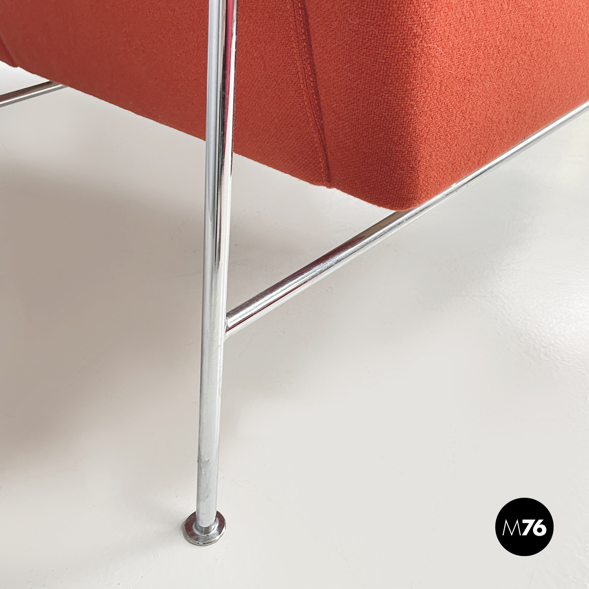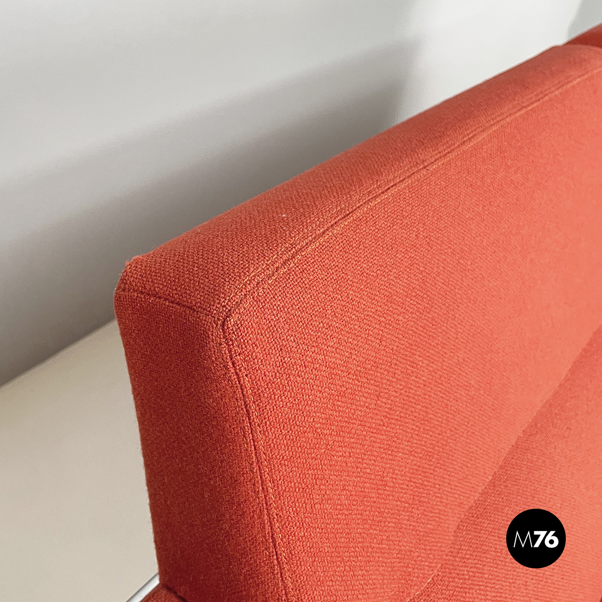 Divano a tre posti modello 3303 Airport con seduta e schienale squadrati imbottiti e rivestiti in tessuto rosso. Braccioli squadrati. La struttura è in tondino di metallo. Piedini tondi in metallo.
