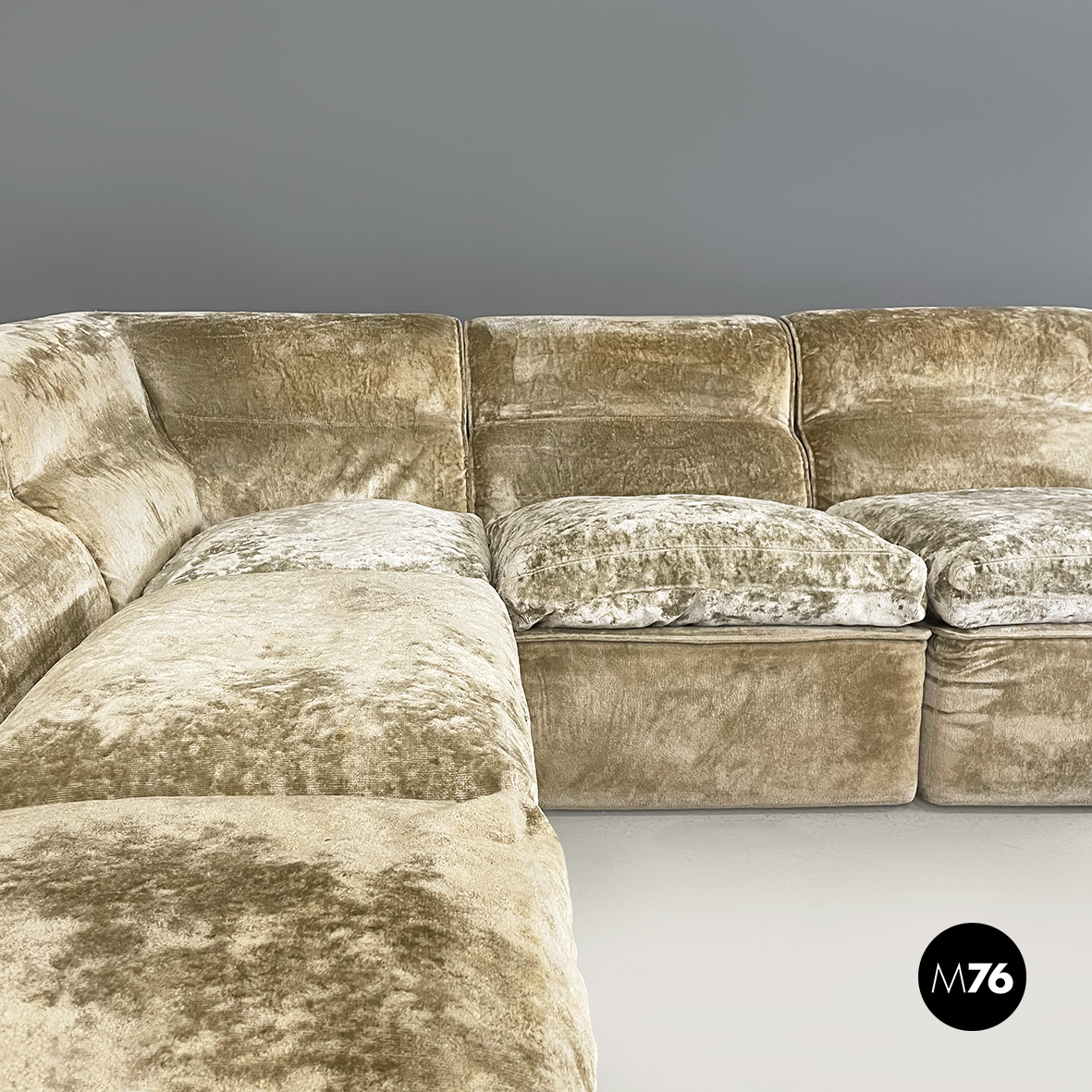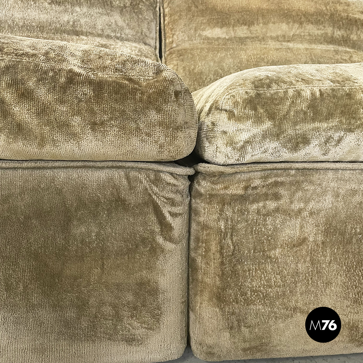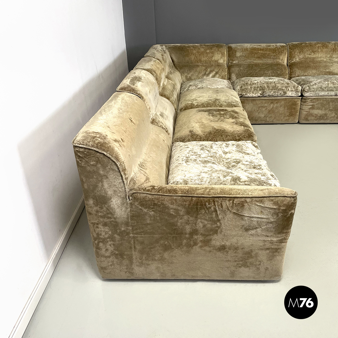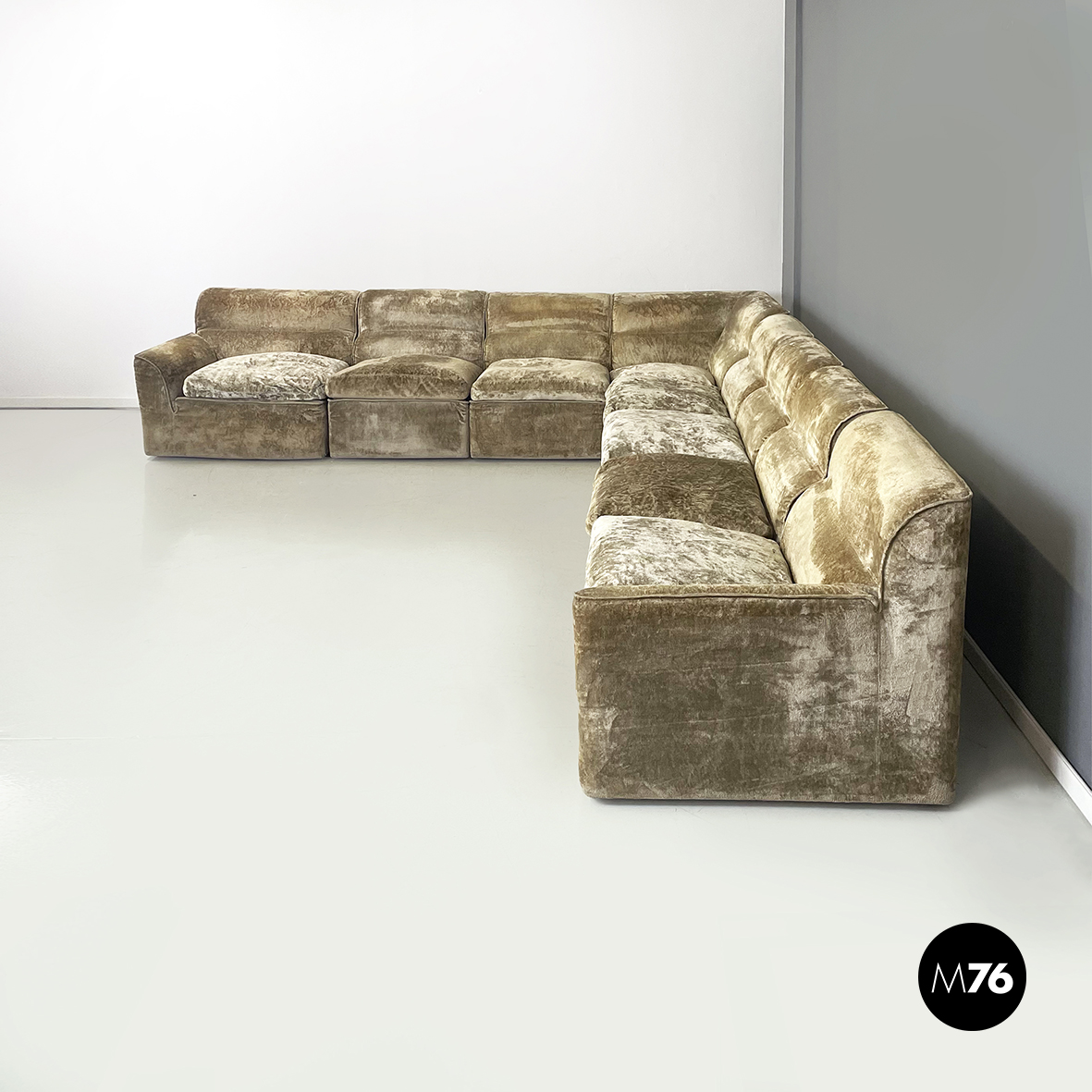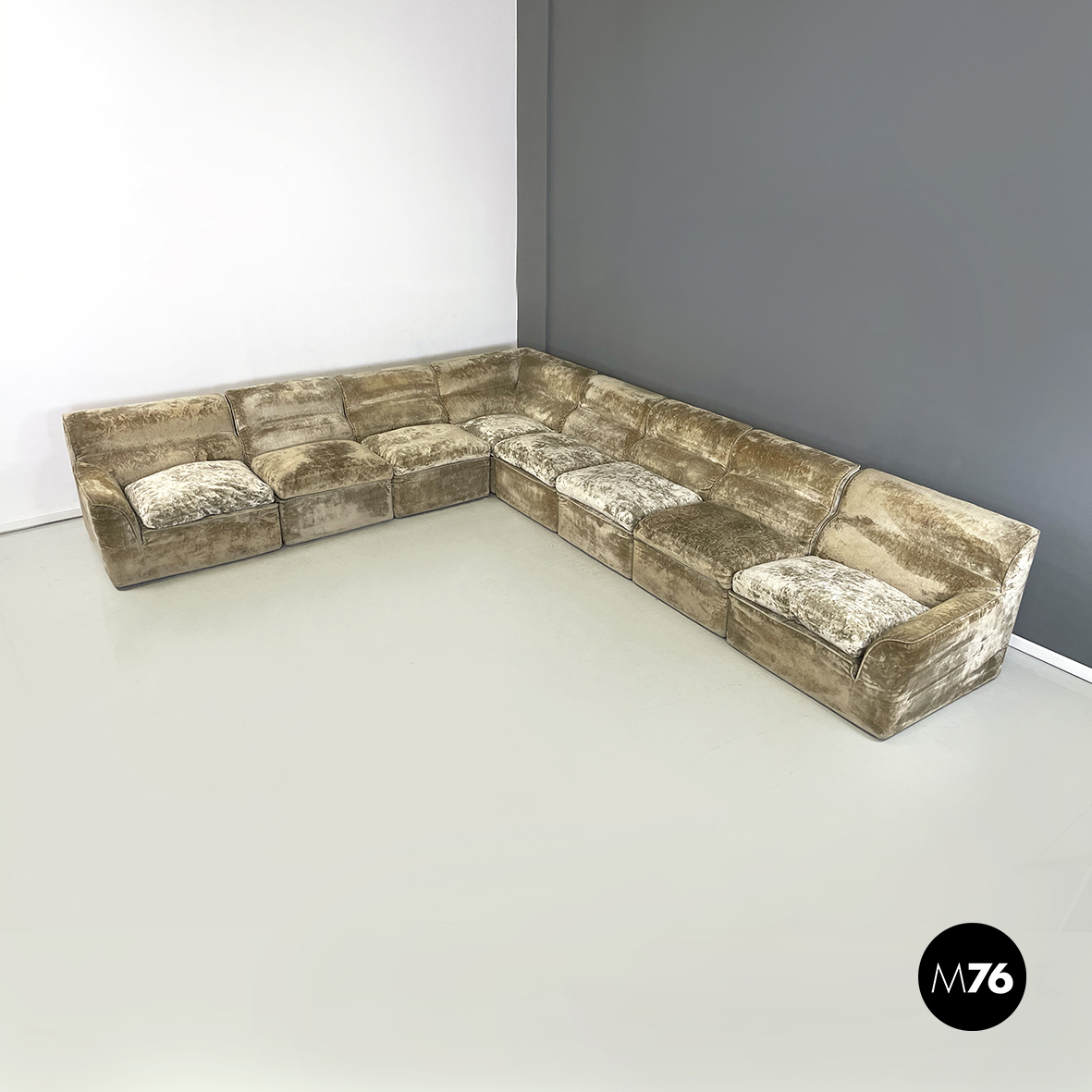 Divano modulare e angolare mod. Antelami dalle forme squadrate in tessuto cangiante nei toni del beige. Il divano è composto da un modulo angolare, due con i braccioli e cinque semplici. Il divano essendo modulare può essere composto a piacere.