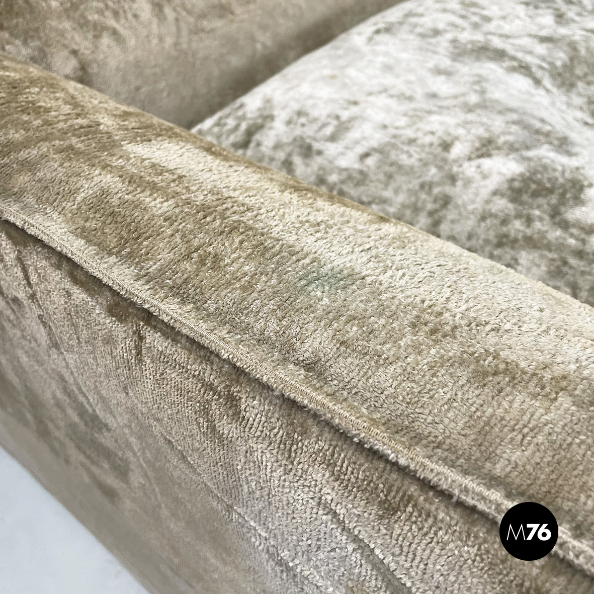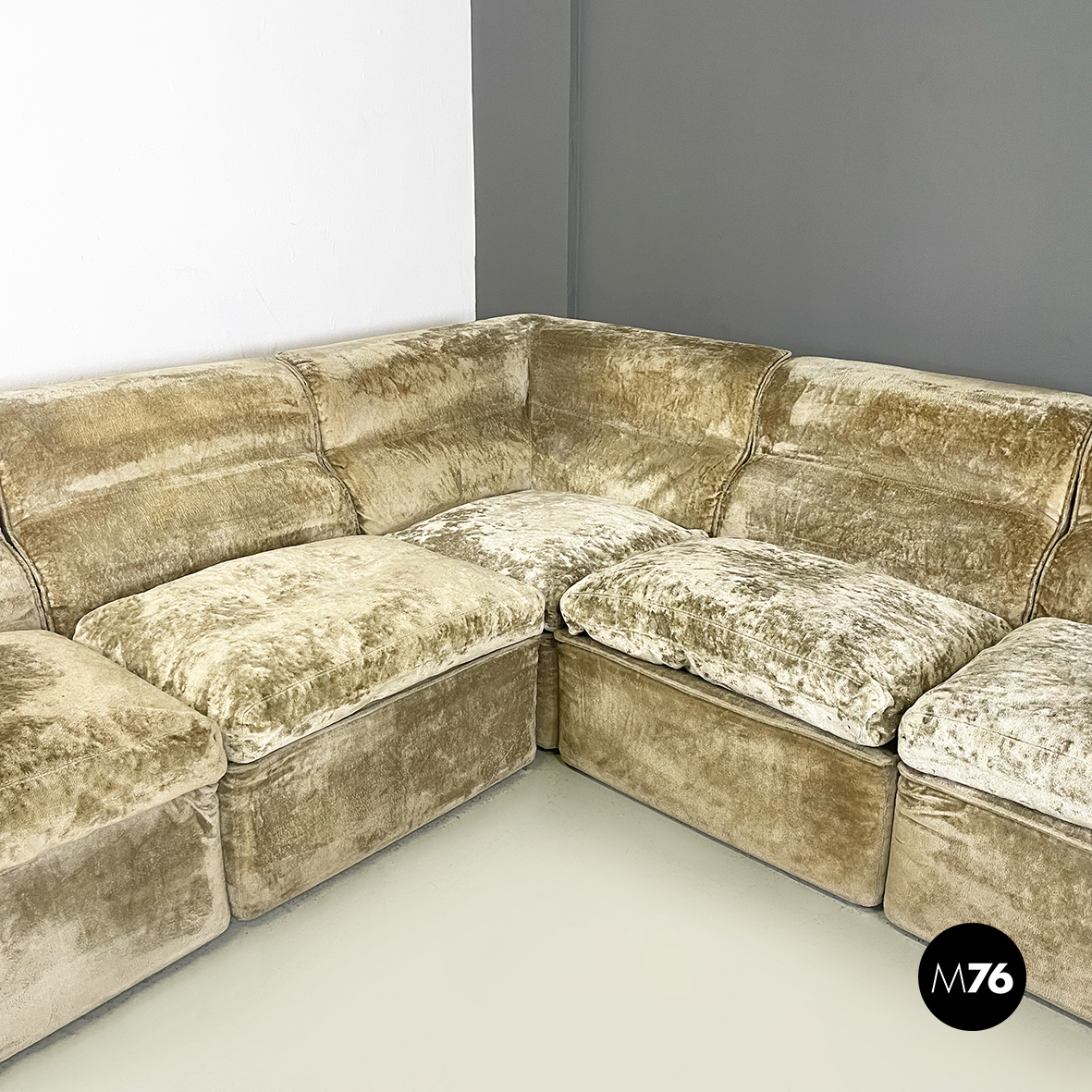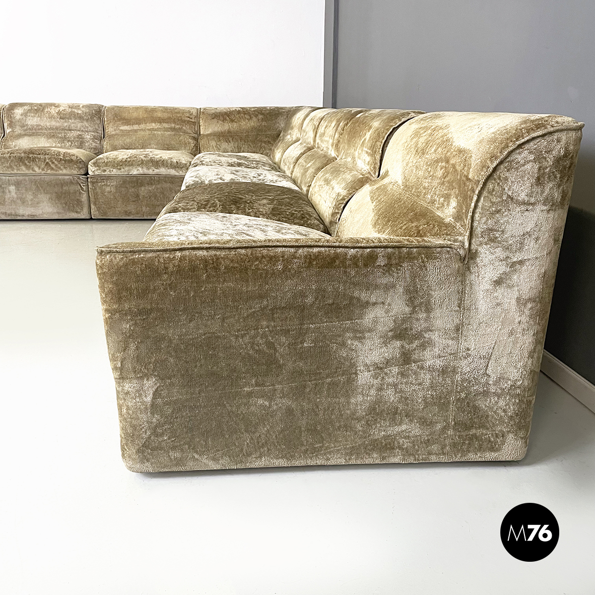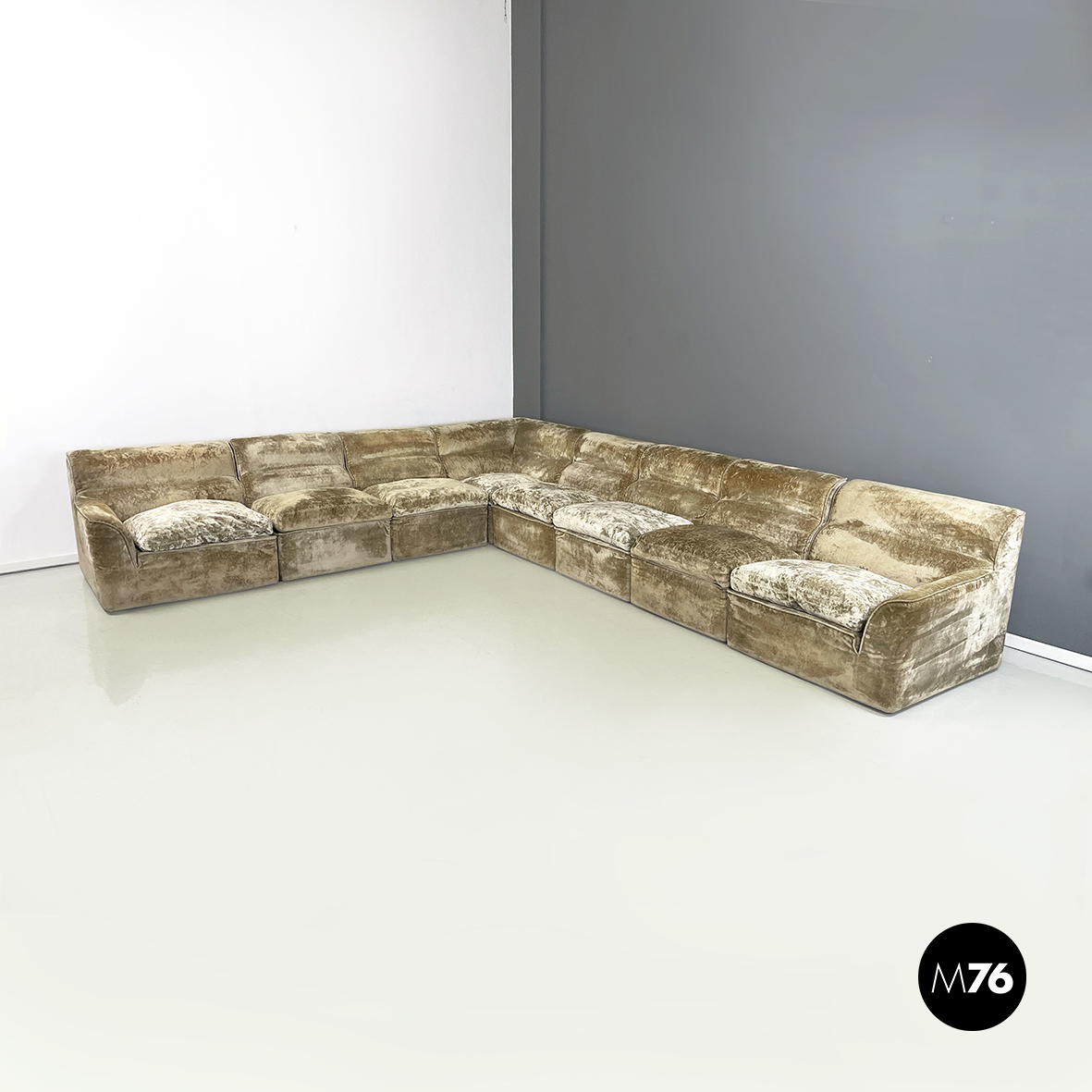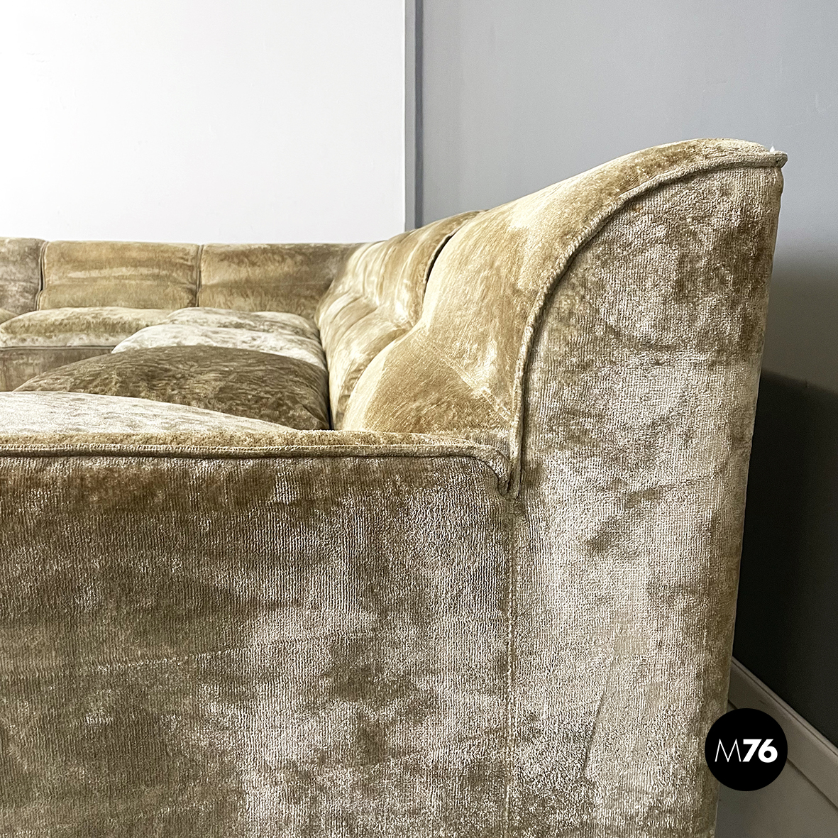 Divano modulare e angolare mod. Antelami dalle forme squadrate in tessuto cangiante nei toni del beige. Il divano è composto da un modulo angolare, due con i braccioli e cinque semplici. Il divano essendo modulare può essere composto a piacere.