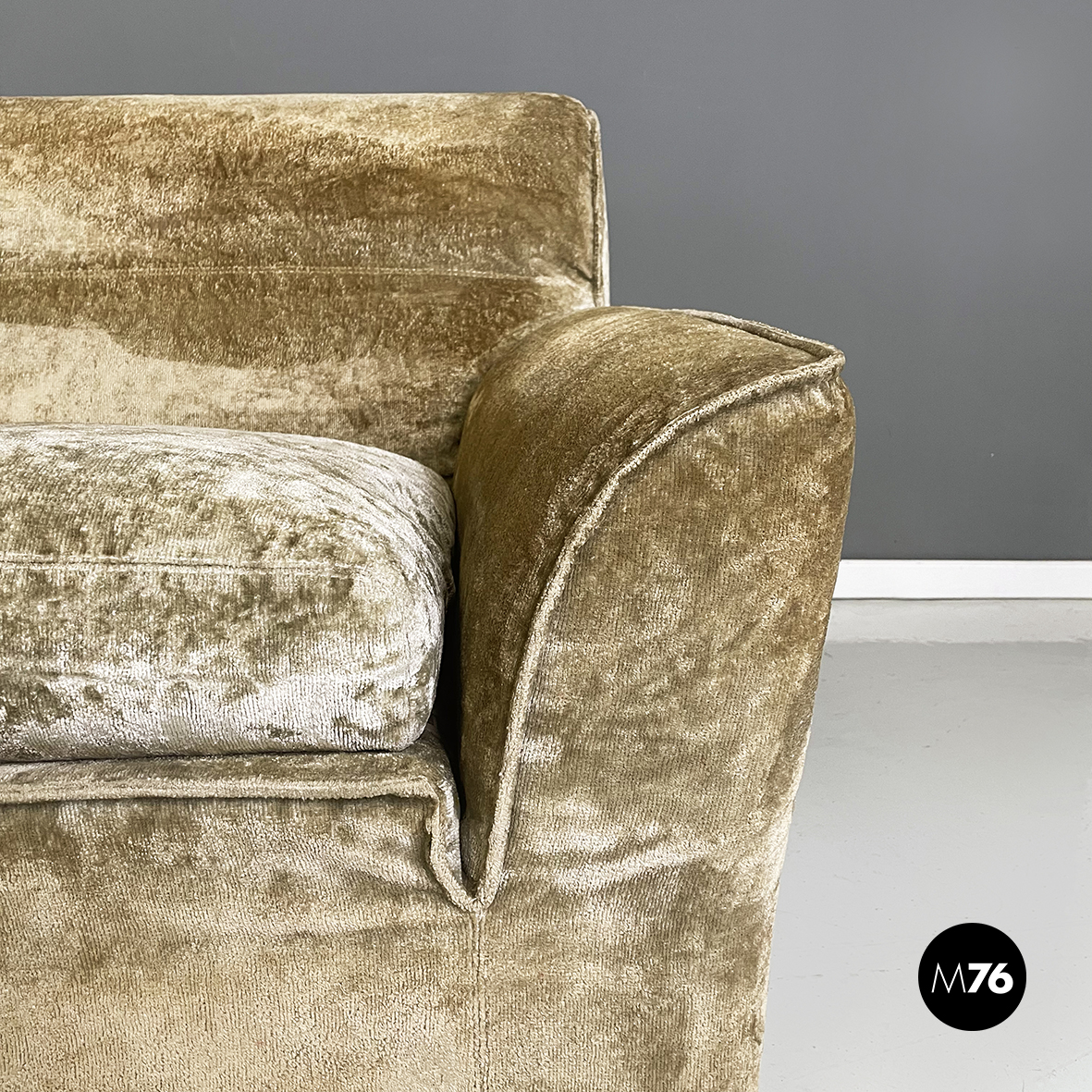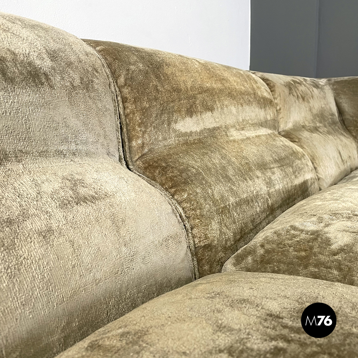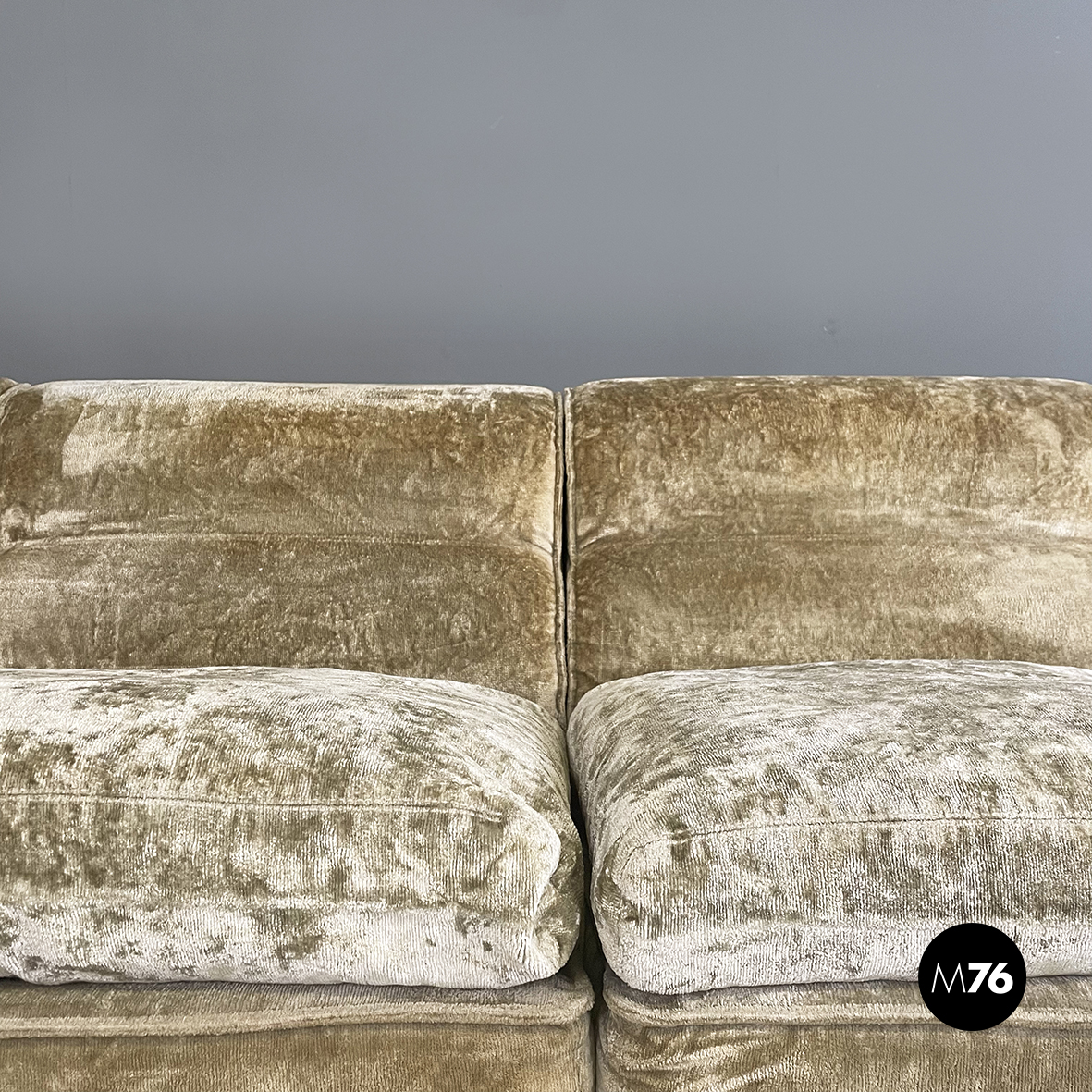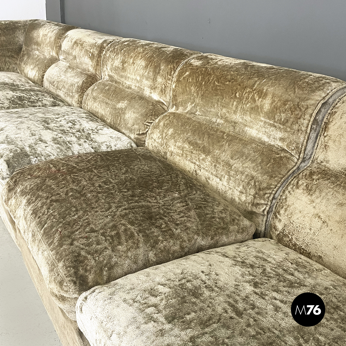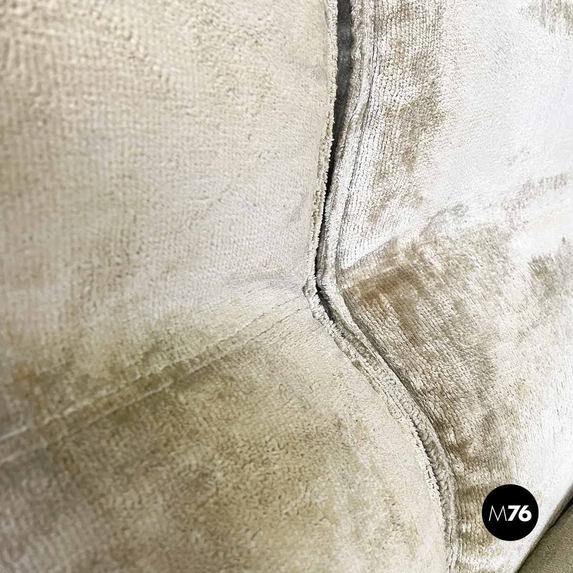 Divano modulare e angolare mod. Antelami dalle forme squadrate in tessuto cangiante nei toni del beige. Il divano è composto da un modulo angolare, due con i braccioli e cinque semplici. Il divano essendo modulare può essere composto a piacere.