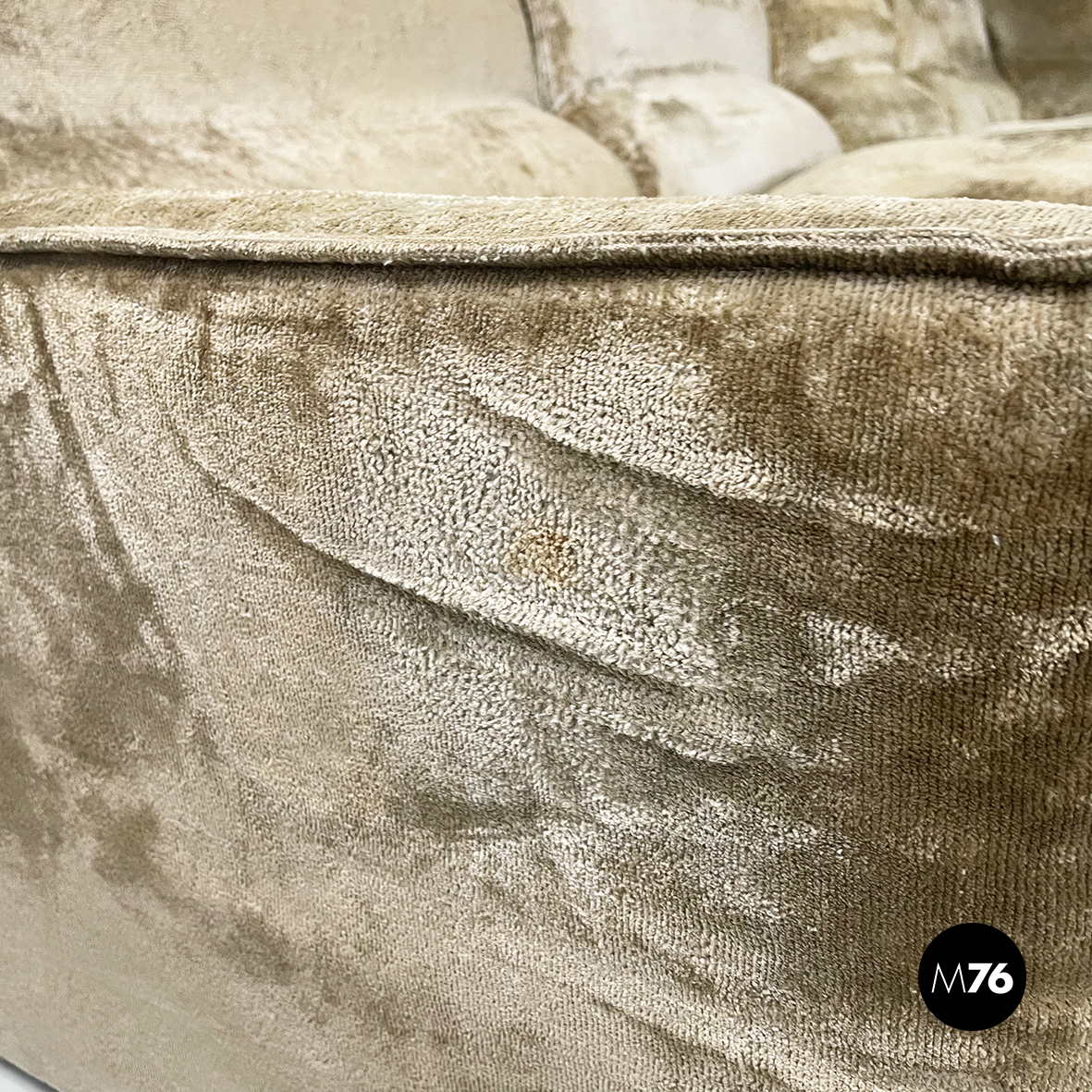 Condizioni vintage, il tessuto originale presenta alcune macchie su un bracciolo e su un cuscino della seduta. Segni di usura sparse date dall’utilizzo.