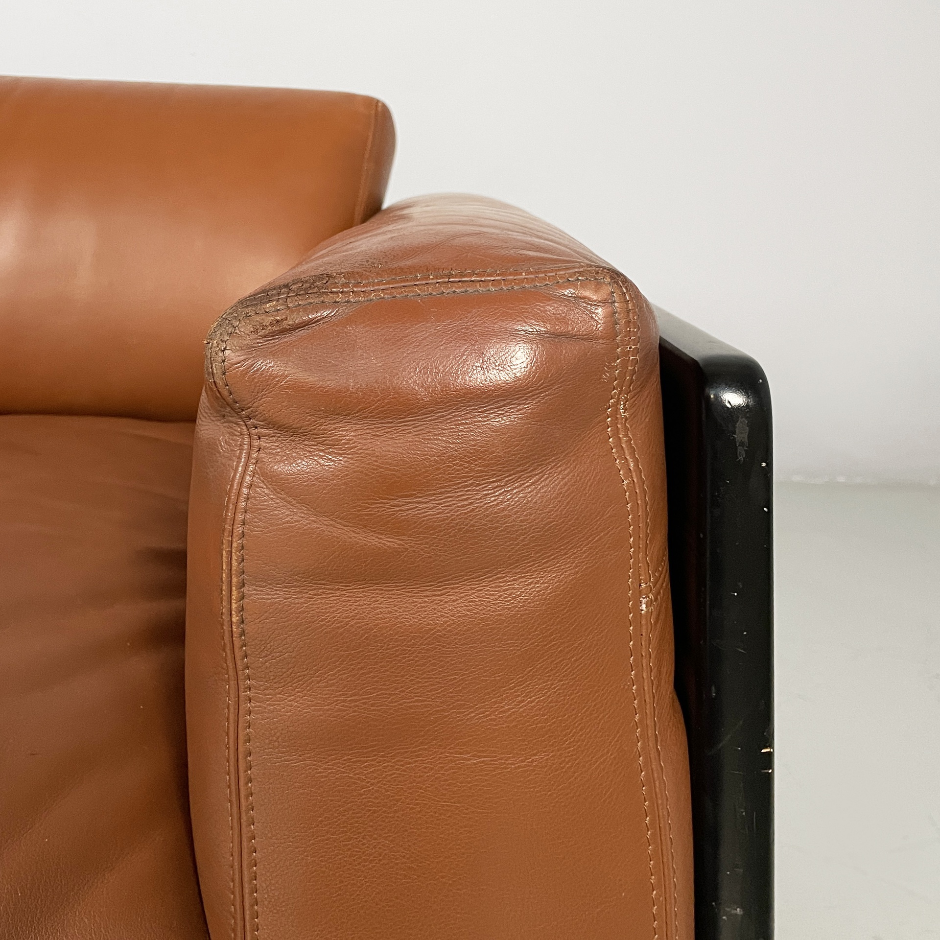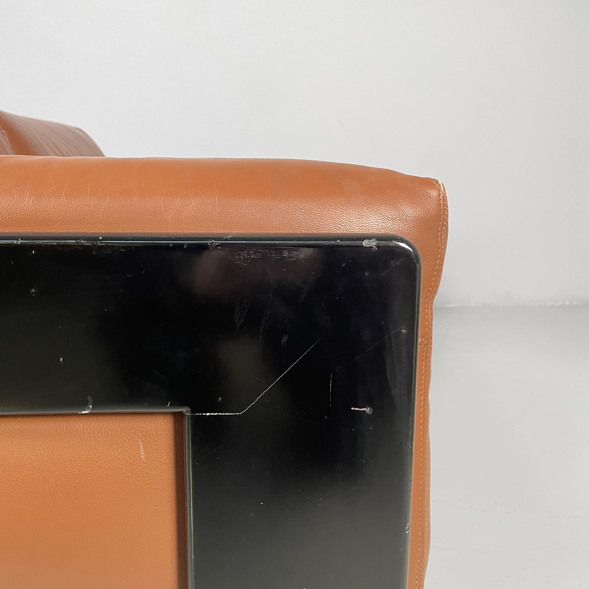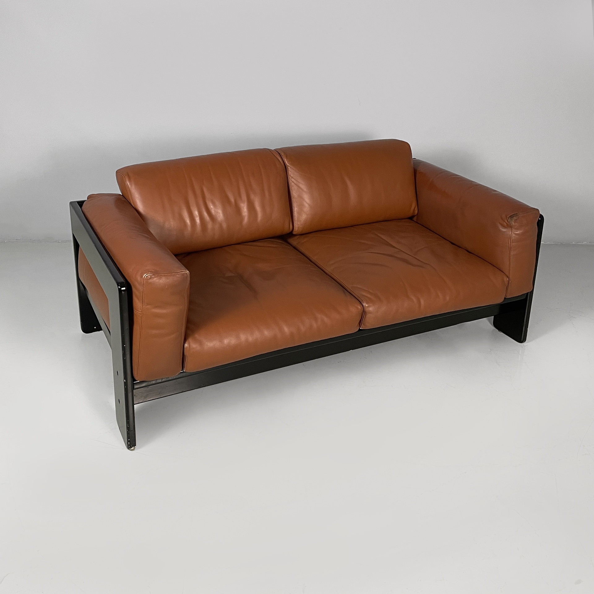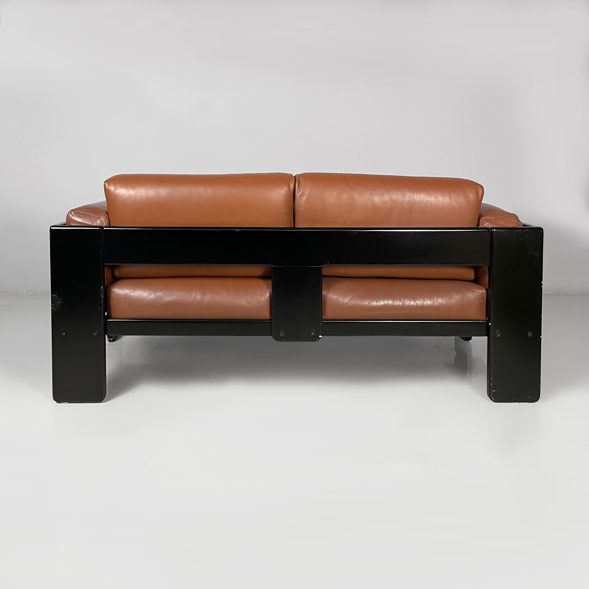Divano a due posti modello Bastiano con seduta, schienale e braccioli composti da cuscini squadrati imbottiti e rivestiti in pelle marrone. La struttura è composta da listelli di legno laccato nero.