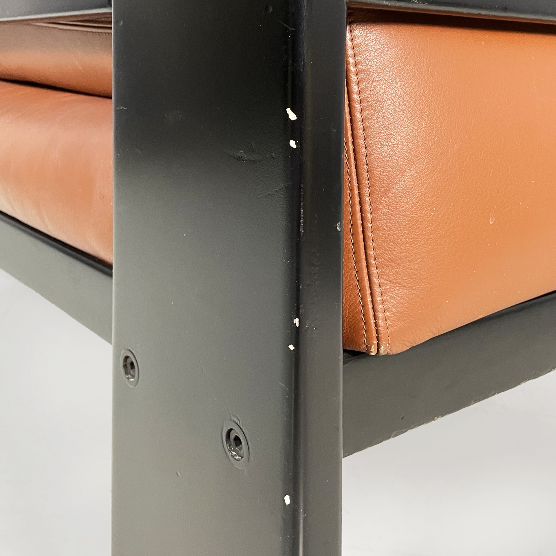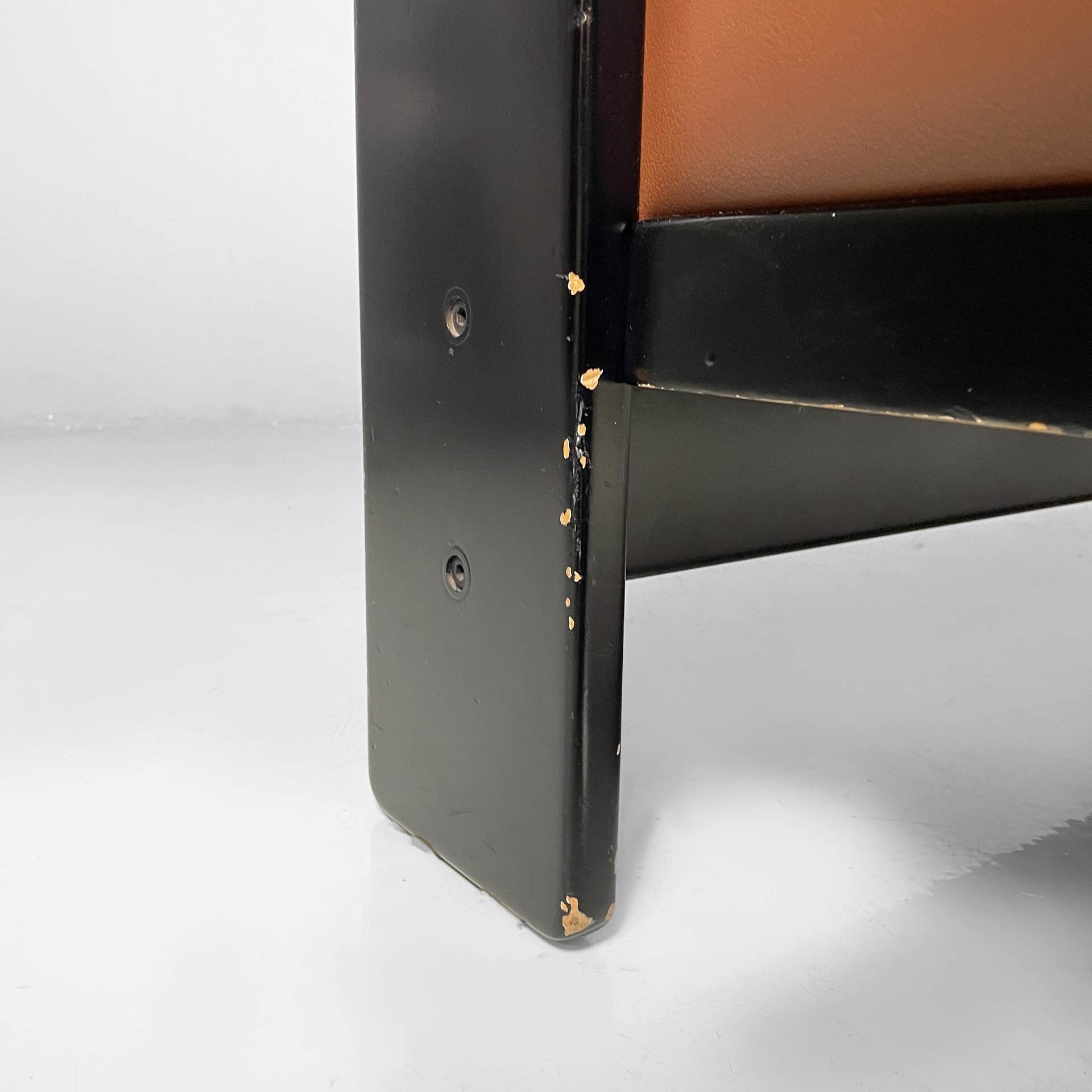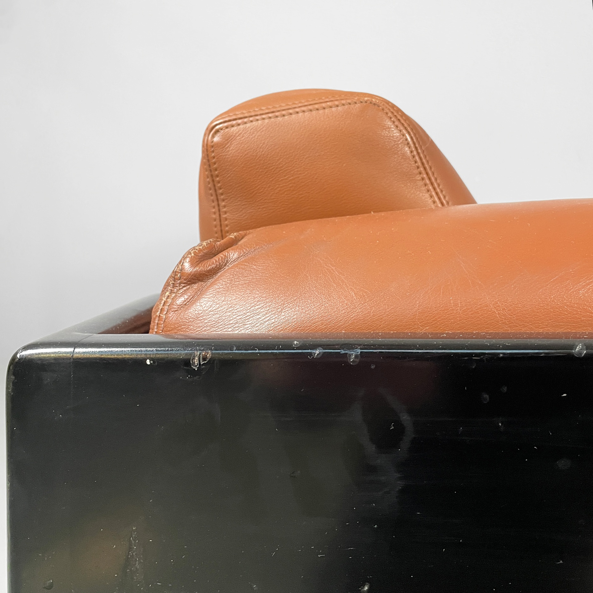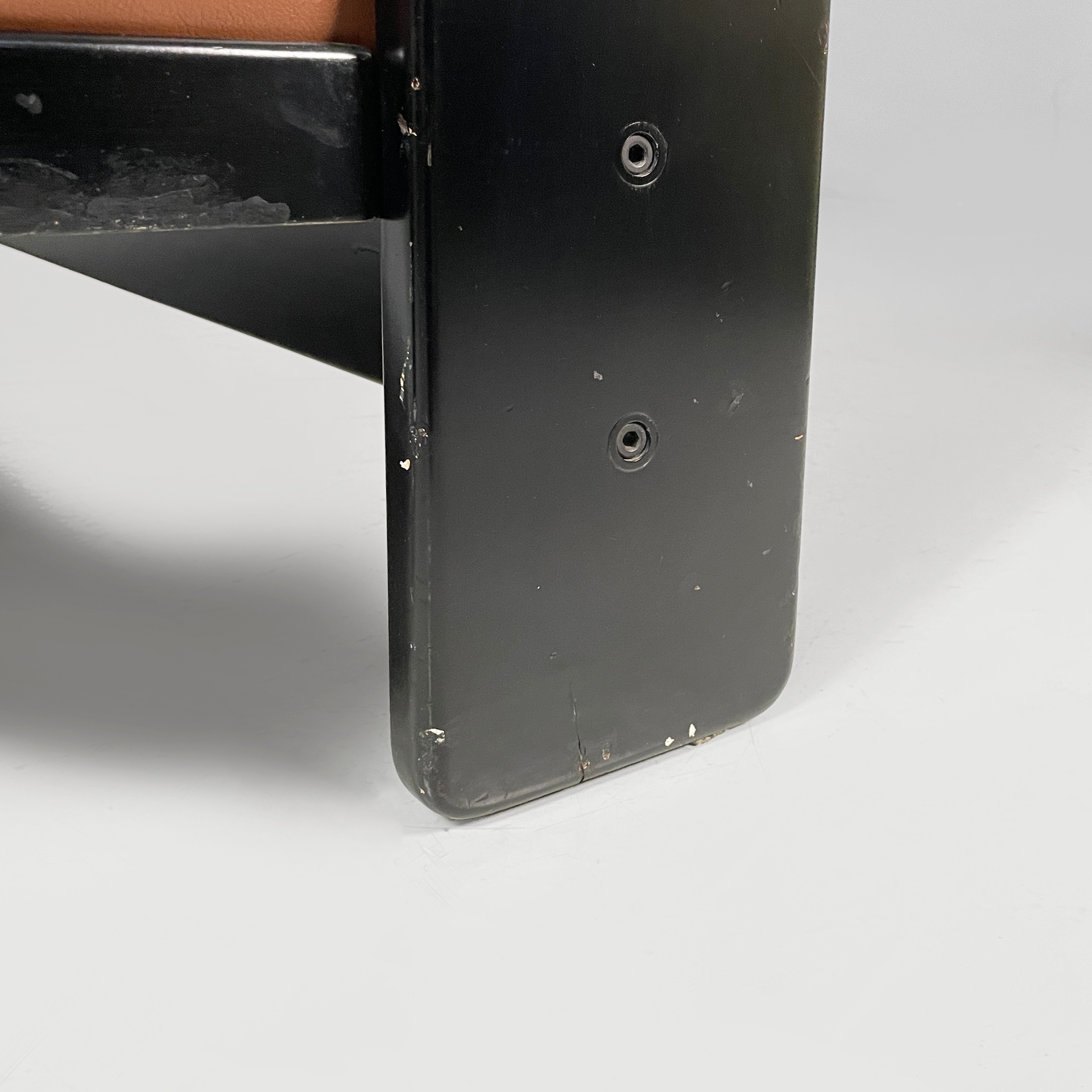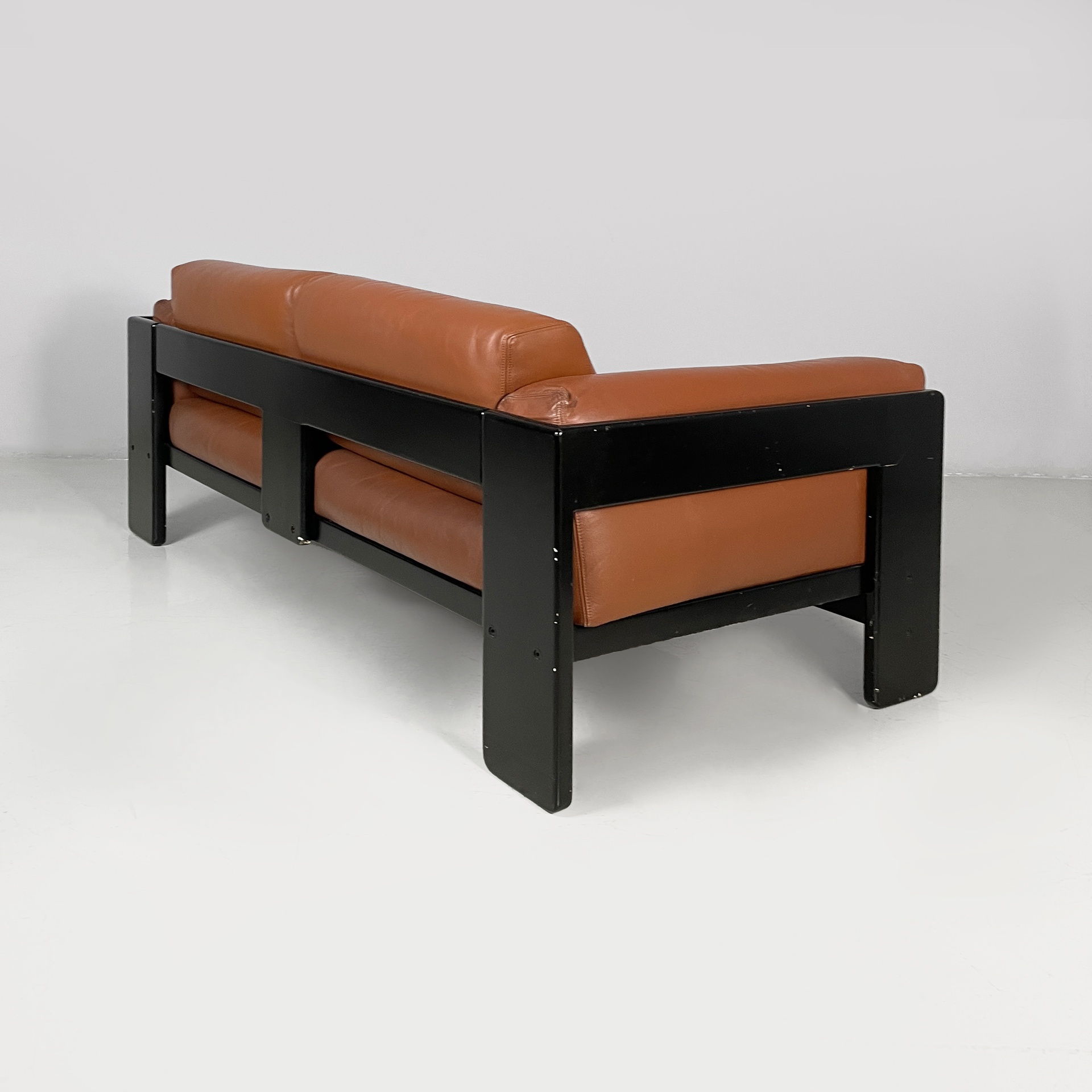 Divano a due posti modello Bastiano con seduta, schienale e braccioli composti da cuscini squadrati imbottiti e rivestiti in pelle marrone. La struttura è composta da listelli di legno laccato nero.