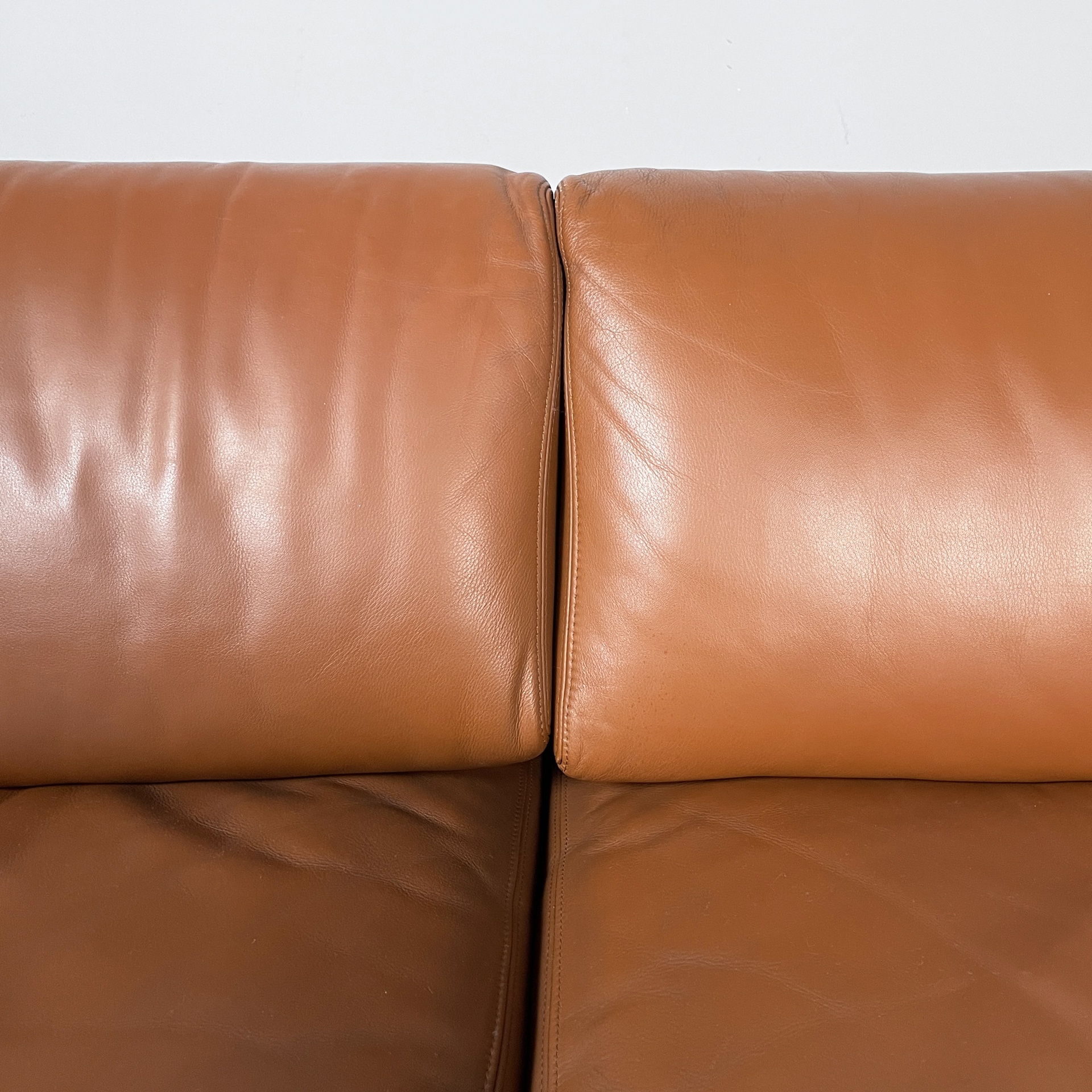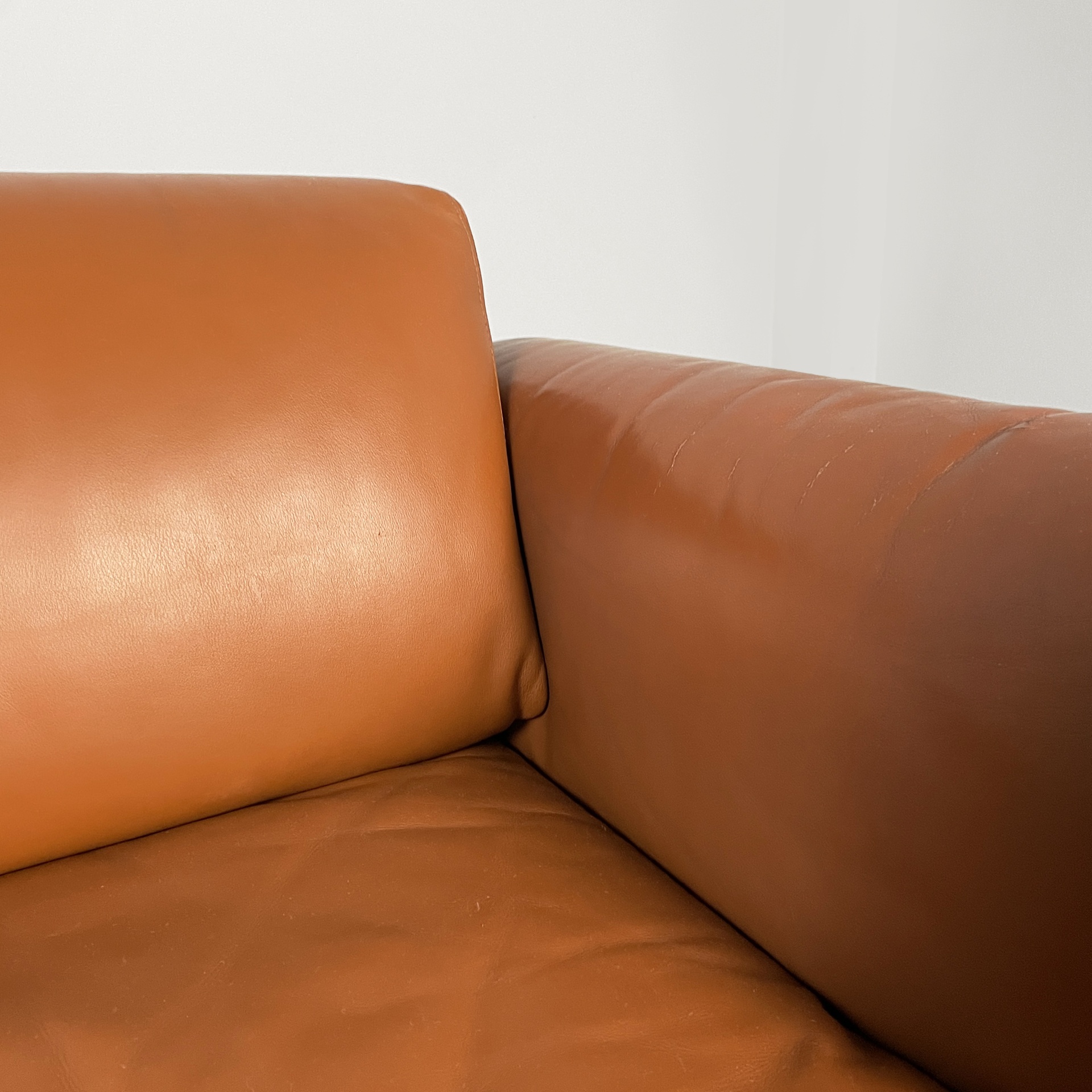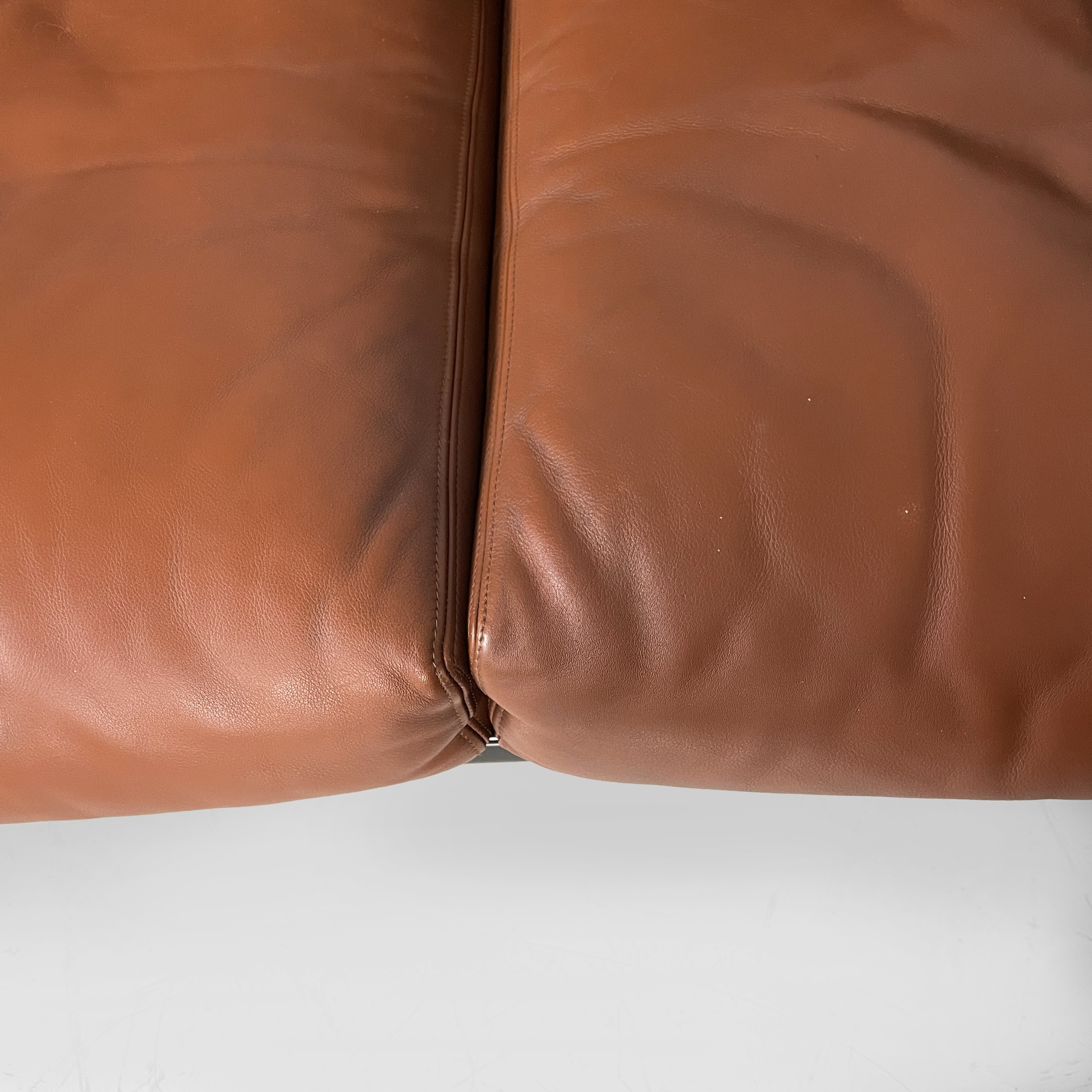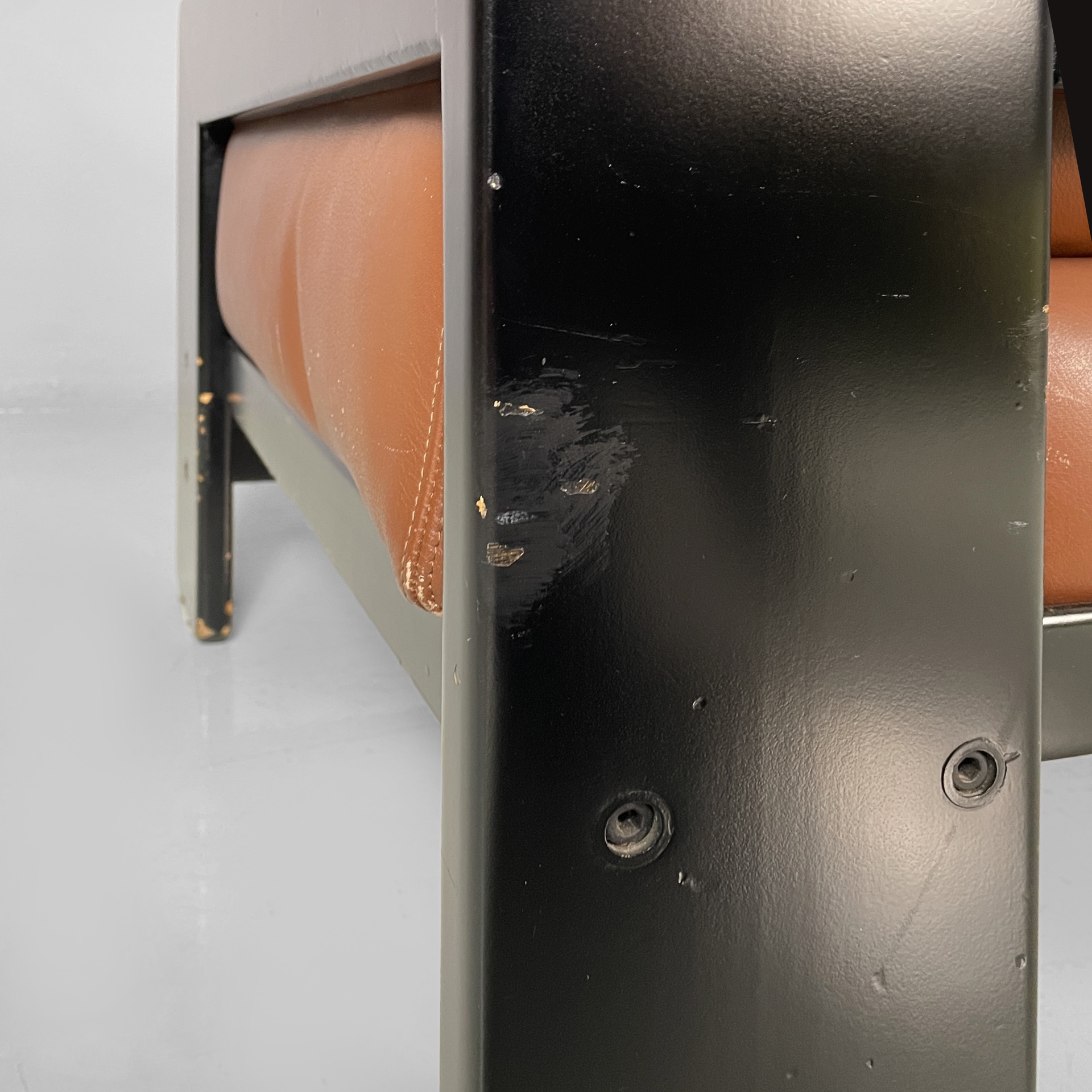 Divano a due posti modello Bastiano con seduta, schienale e braccioli composti da cuscini squadrati imbottiti e rivestiti in pelle marrone. La struttura è composta da listelli di legno laccato nero.