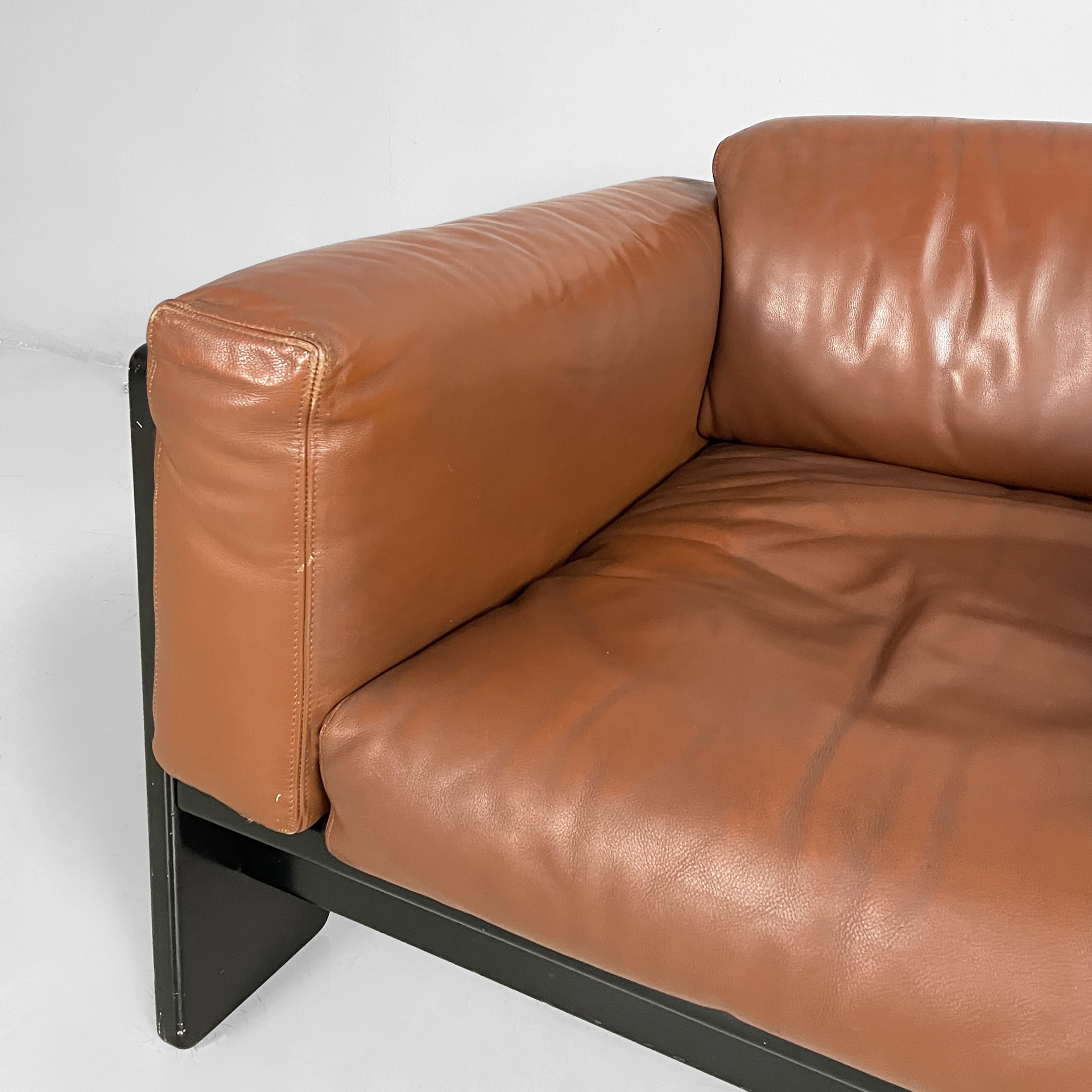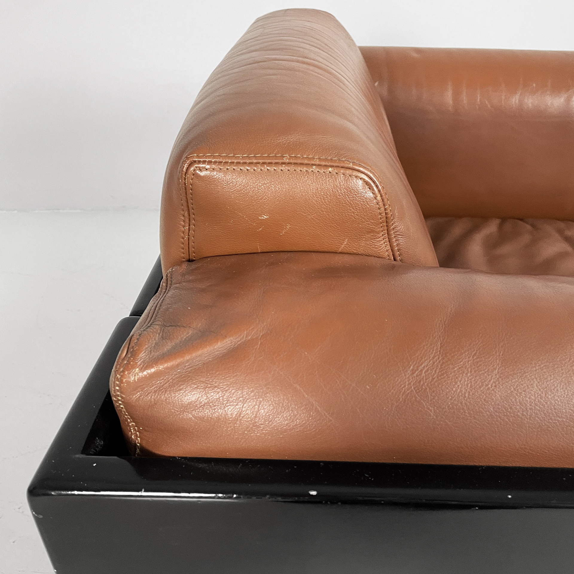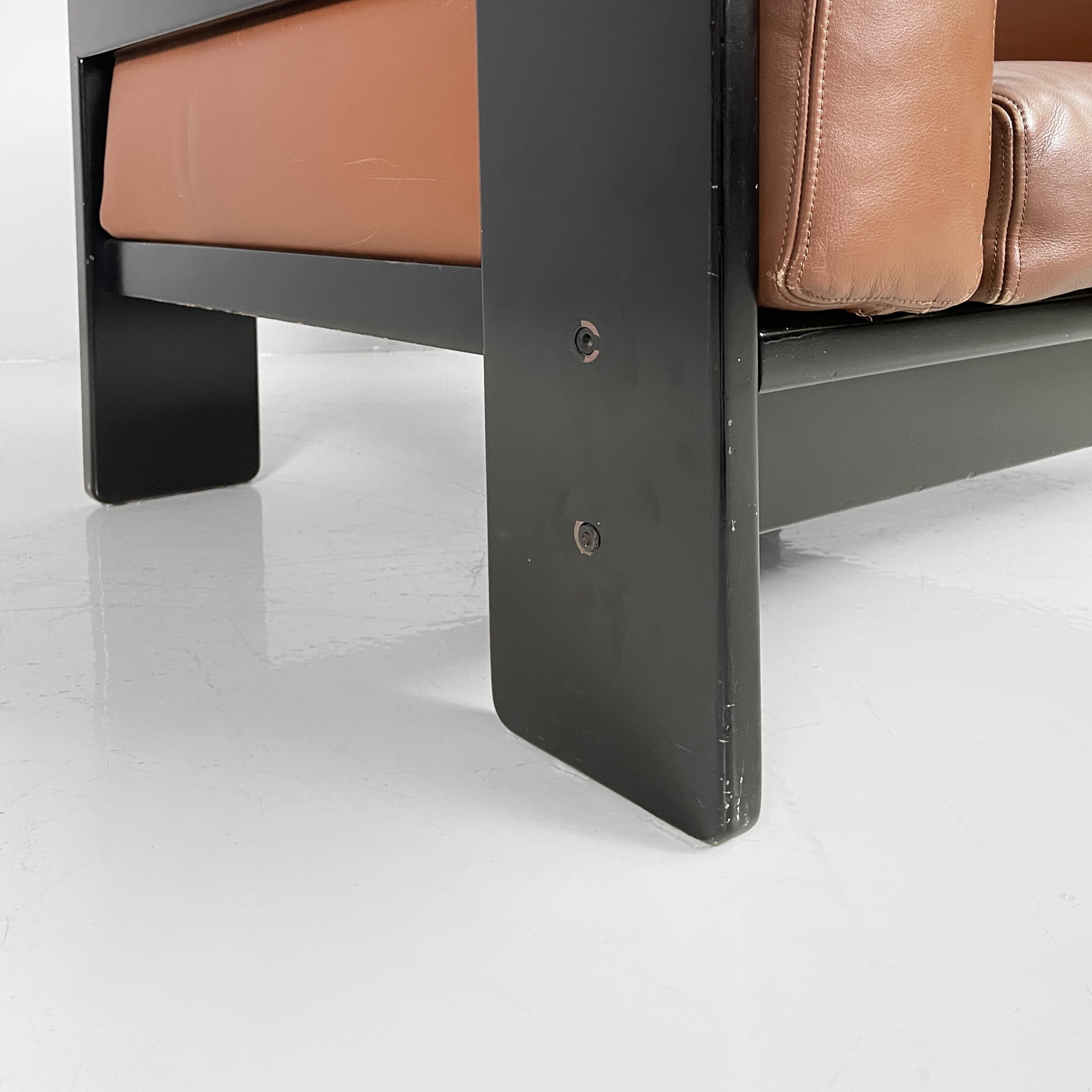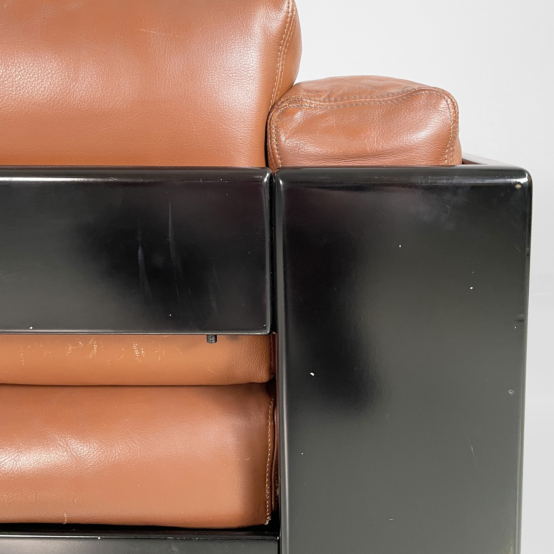 Divano a due posti modello Bastiano con seduta, schienale e braccioli composti da cuscini squadrati imbottiti e rivestiti in pelle marrone. La struttura è composta da listelli di legno laccato nero.