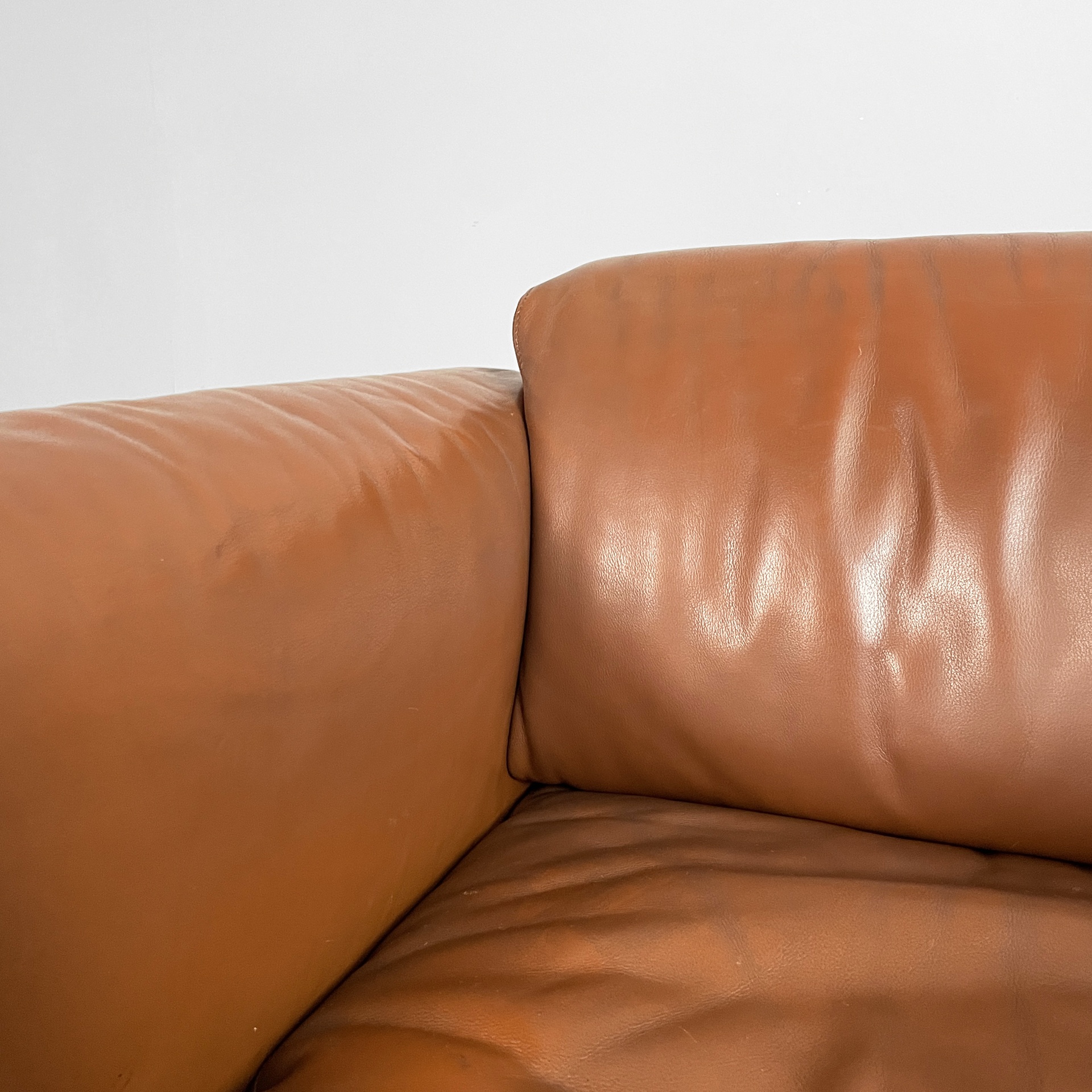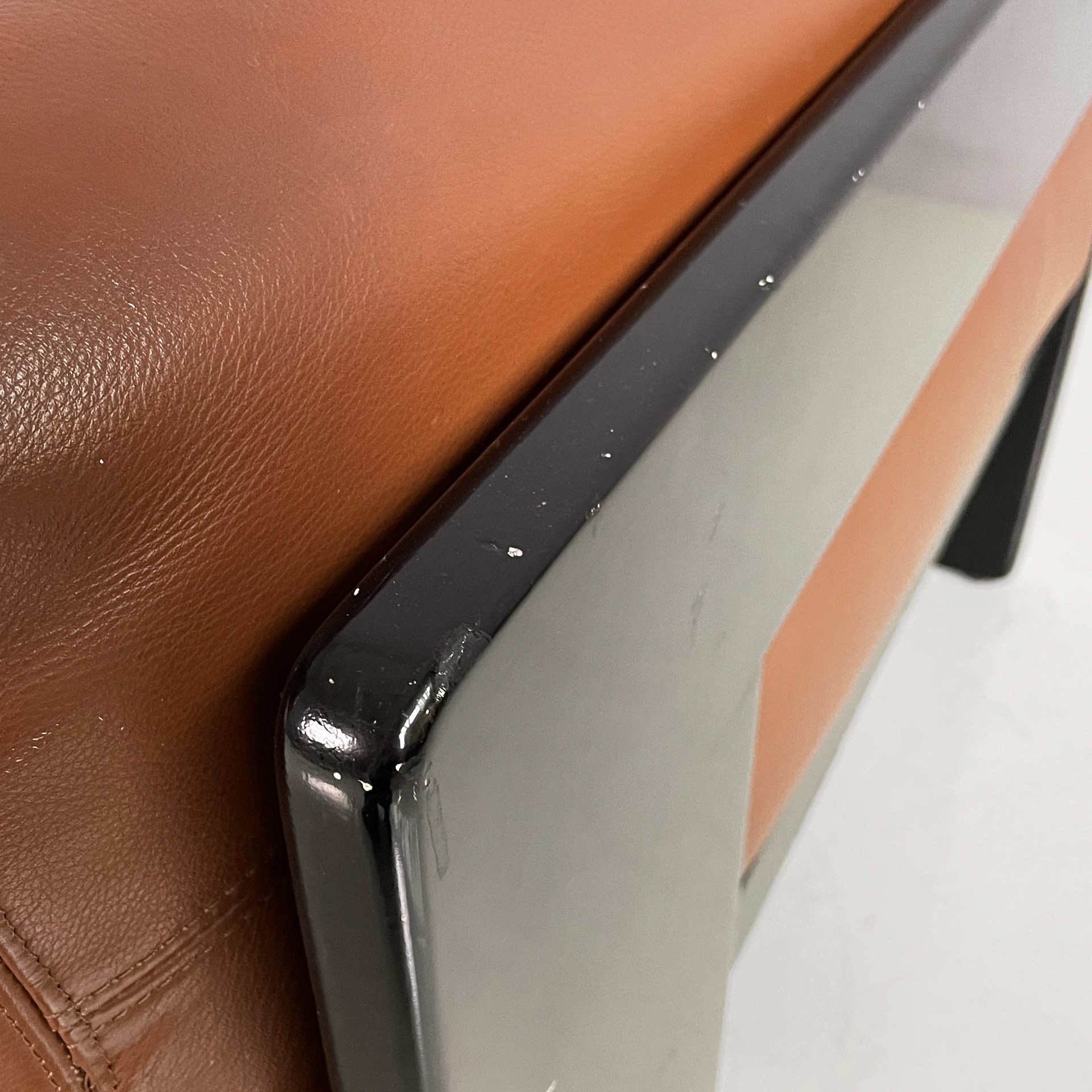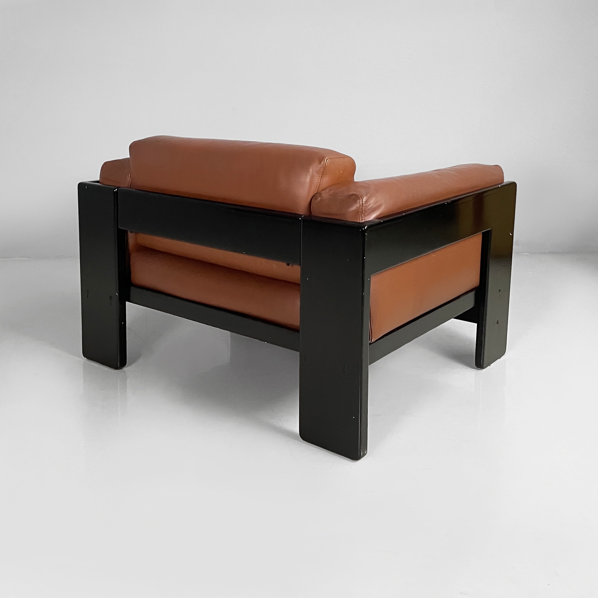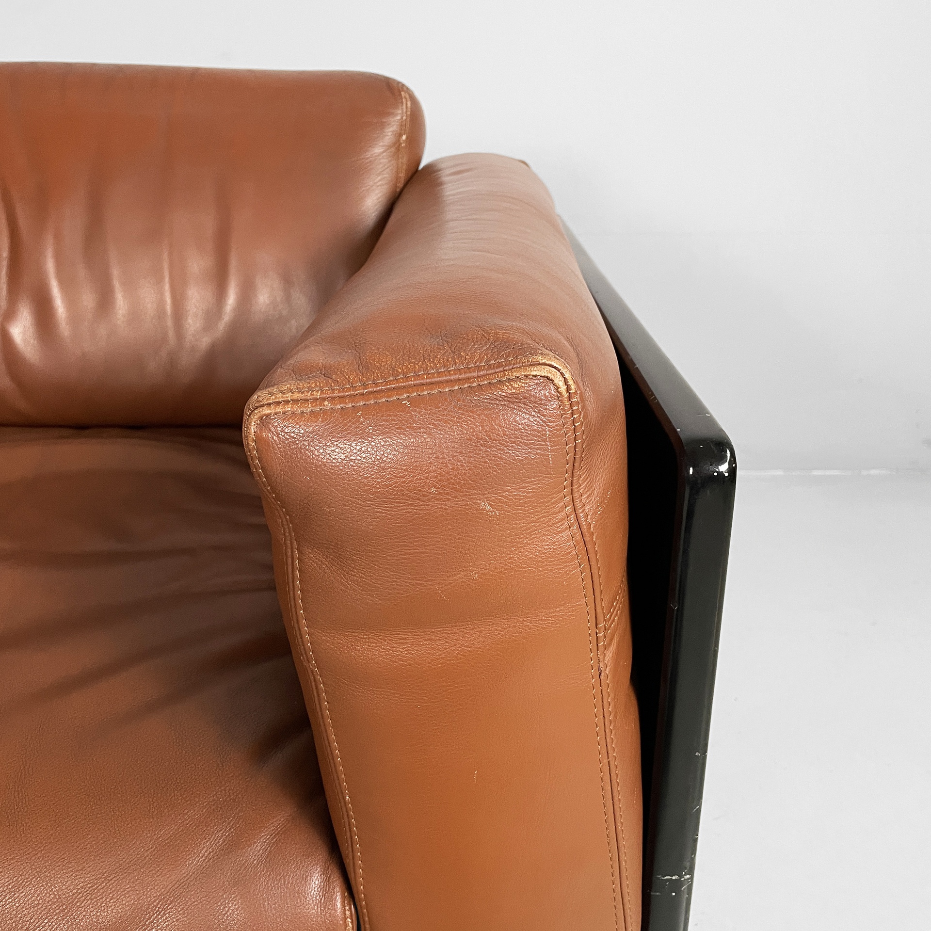 Divano a due posti modello Bastiano con seduta, schienale e braccioli composti da cuscini squadrati imbottiti e rivestiti in pelle marrone. La struttura è composta da listelli di legno laccato nero.