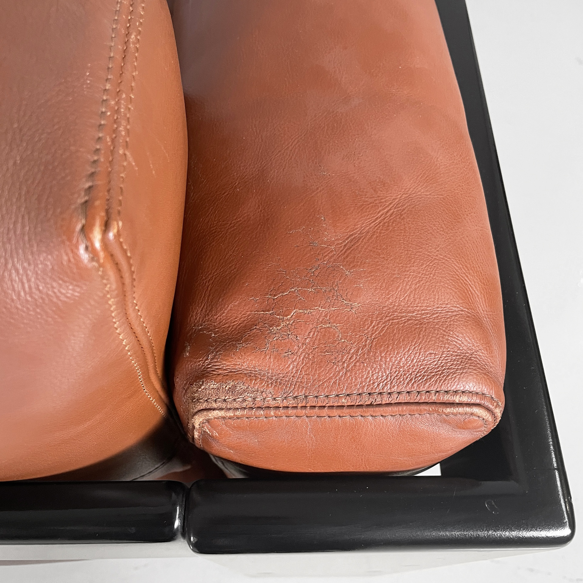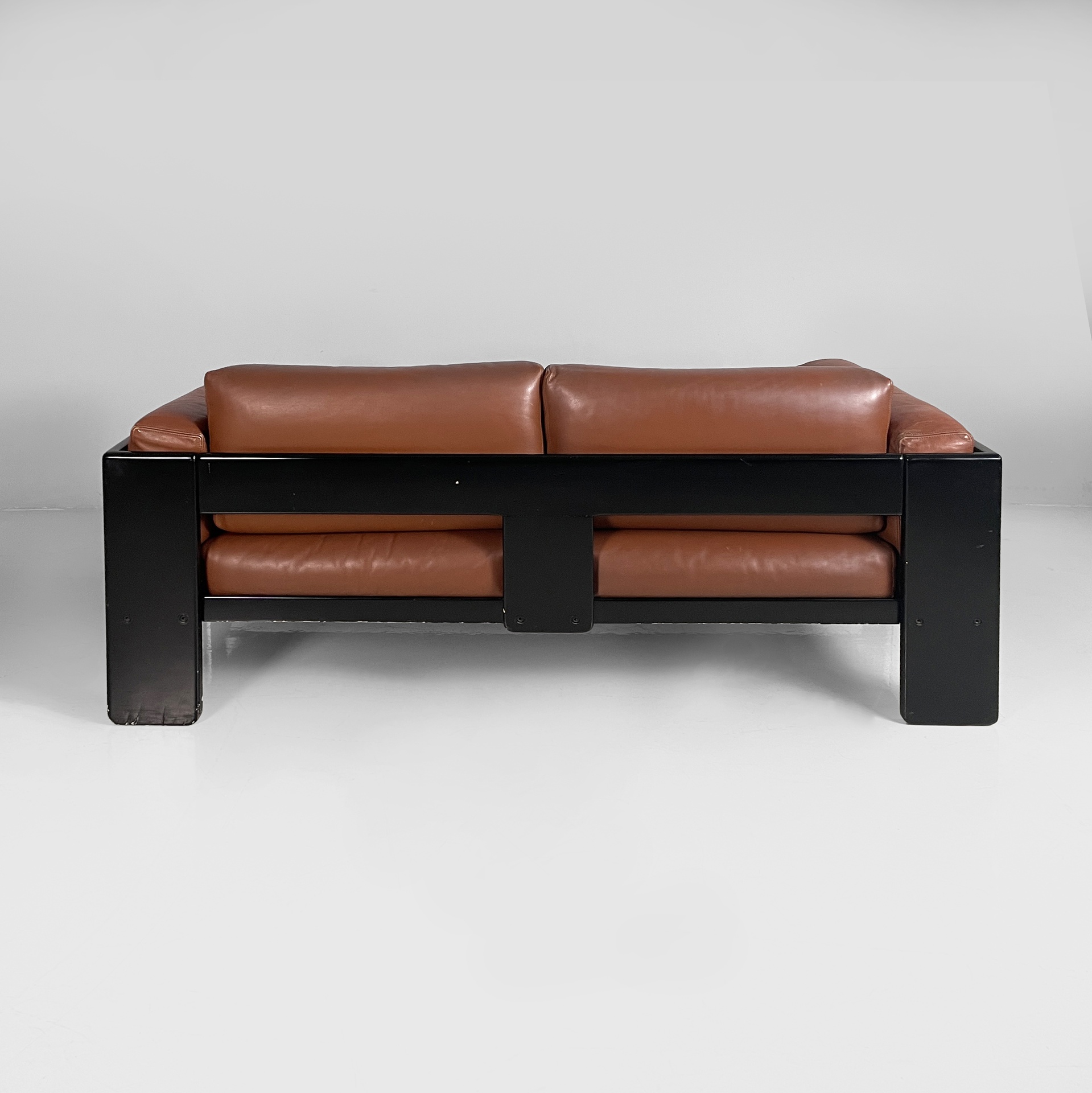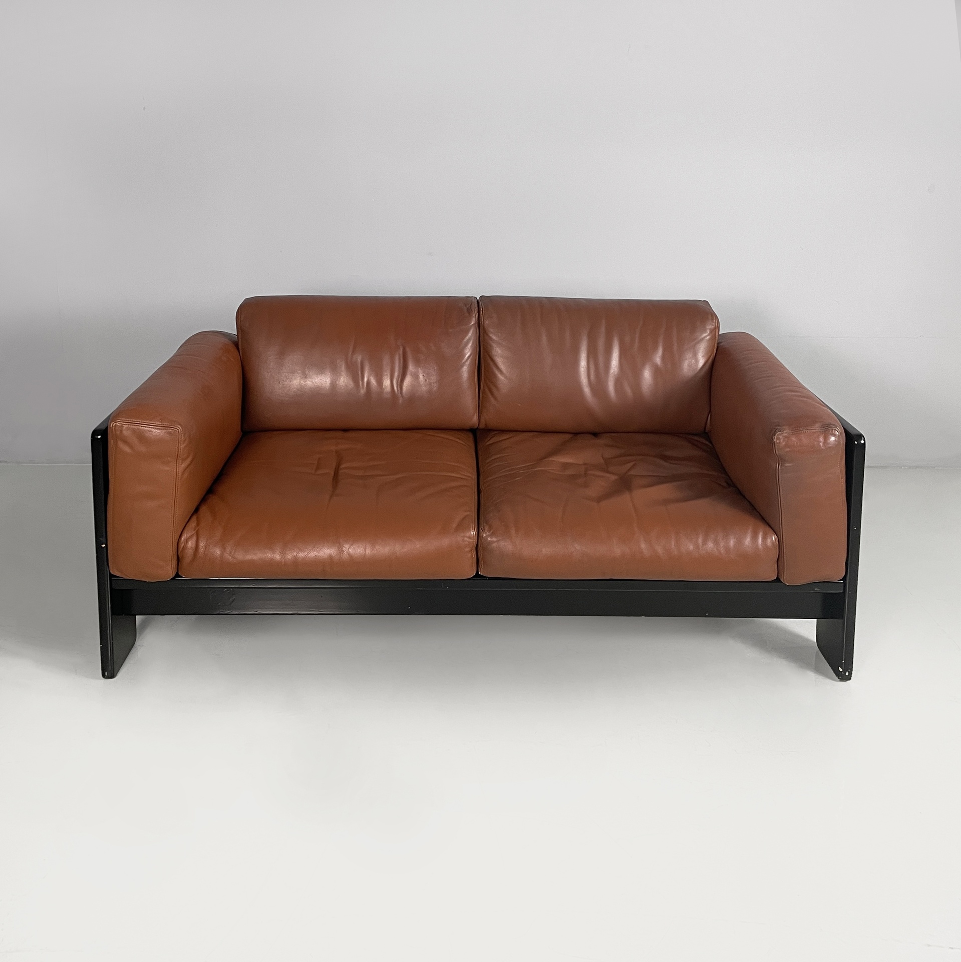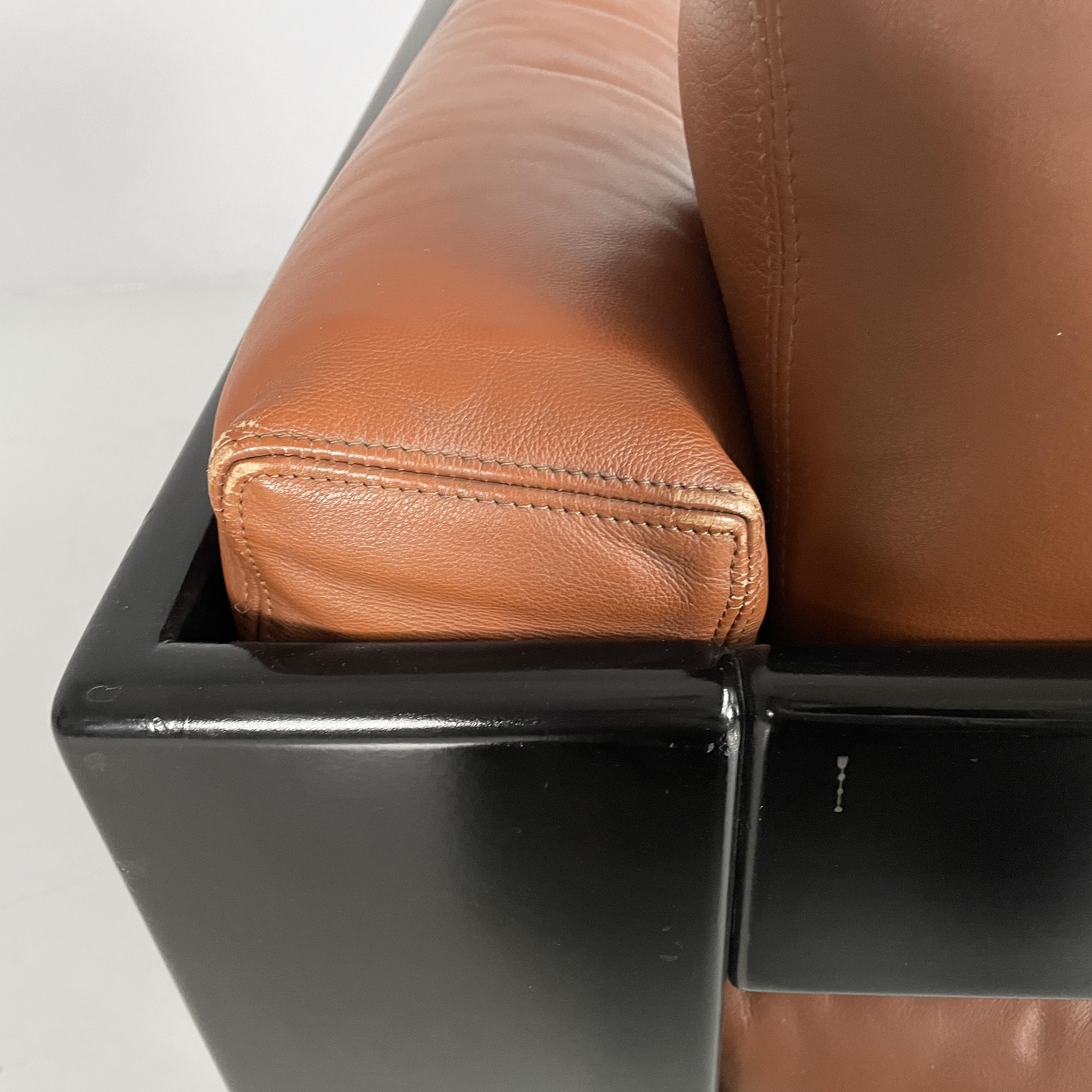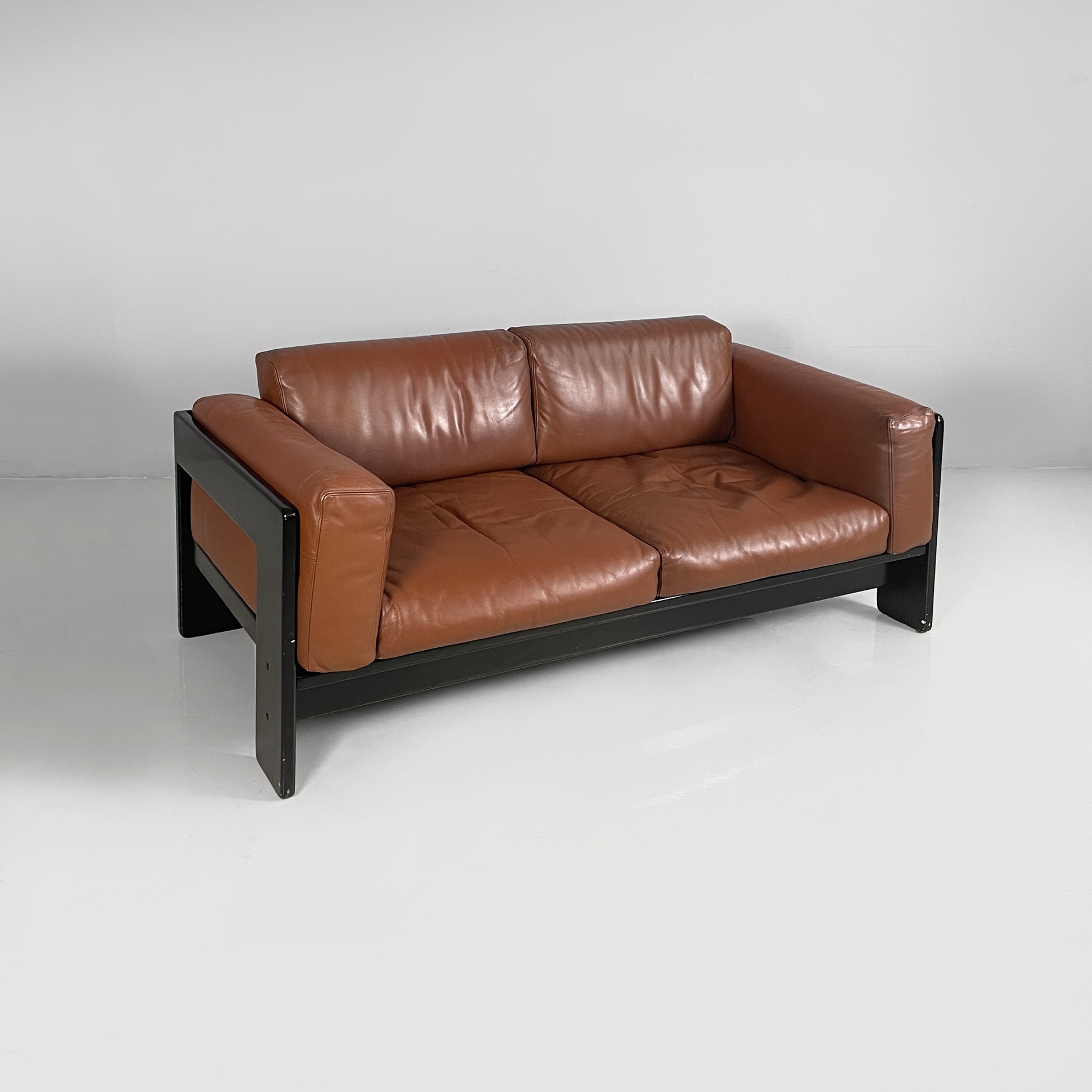Divano a due posti modello Bastiano con seduta, schienale e braccioli composti da cuscini squadrati imbottiti e rivestiti in pelle marrone. La struttura è composta da listelli di legno laccato nero.