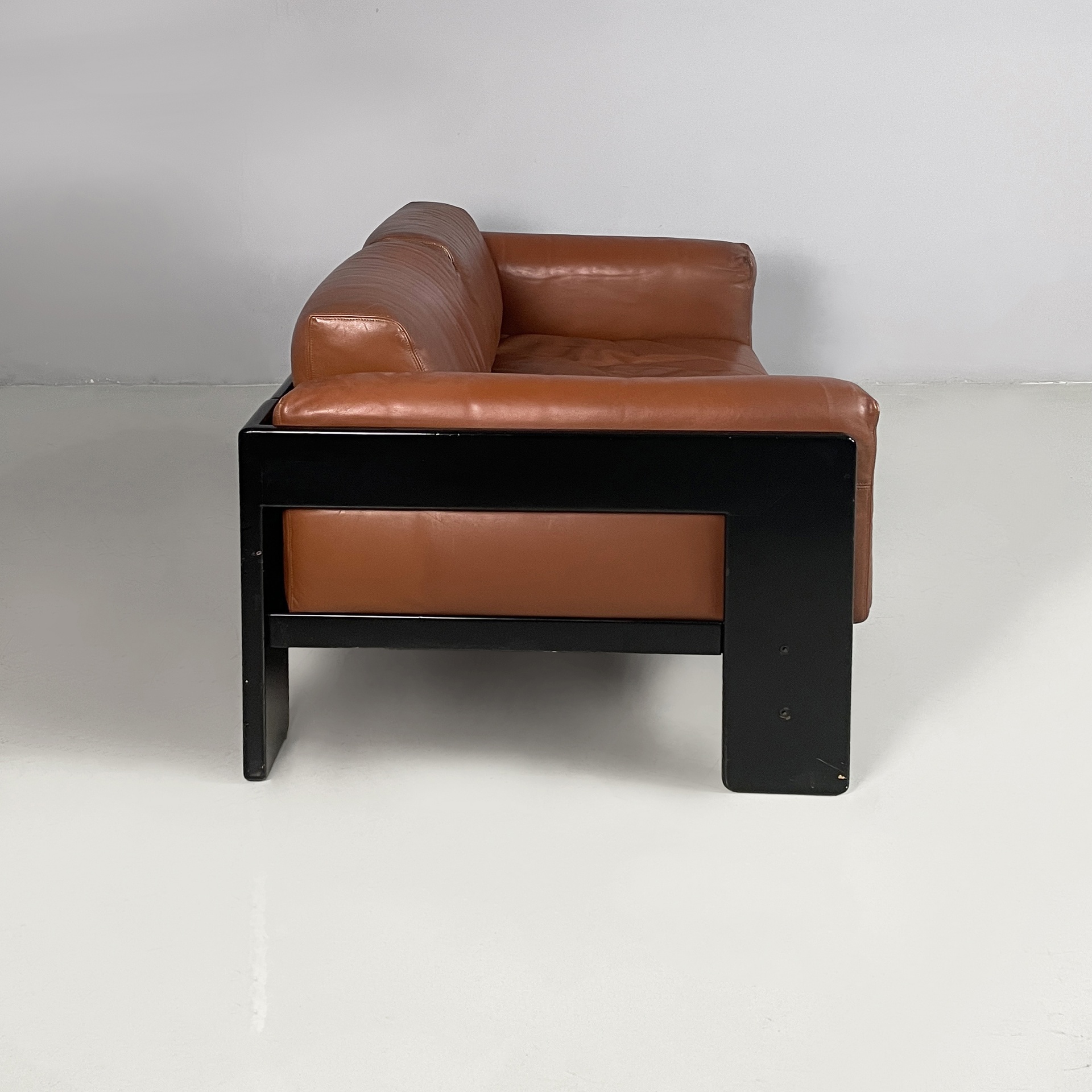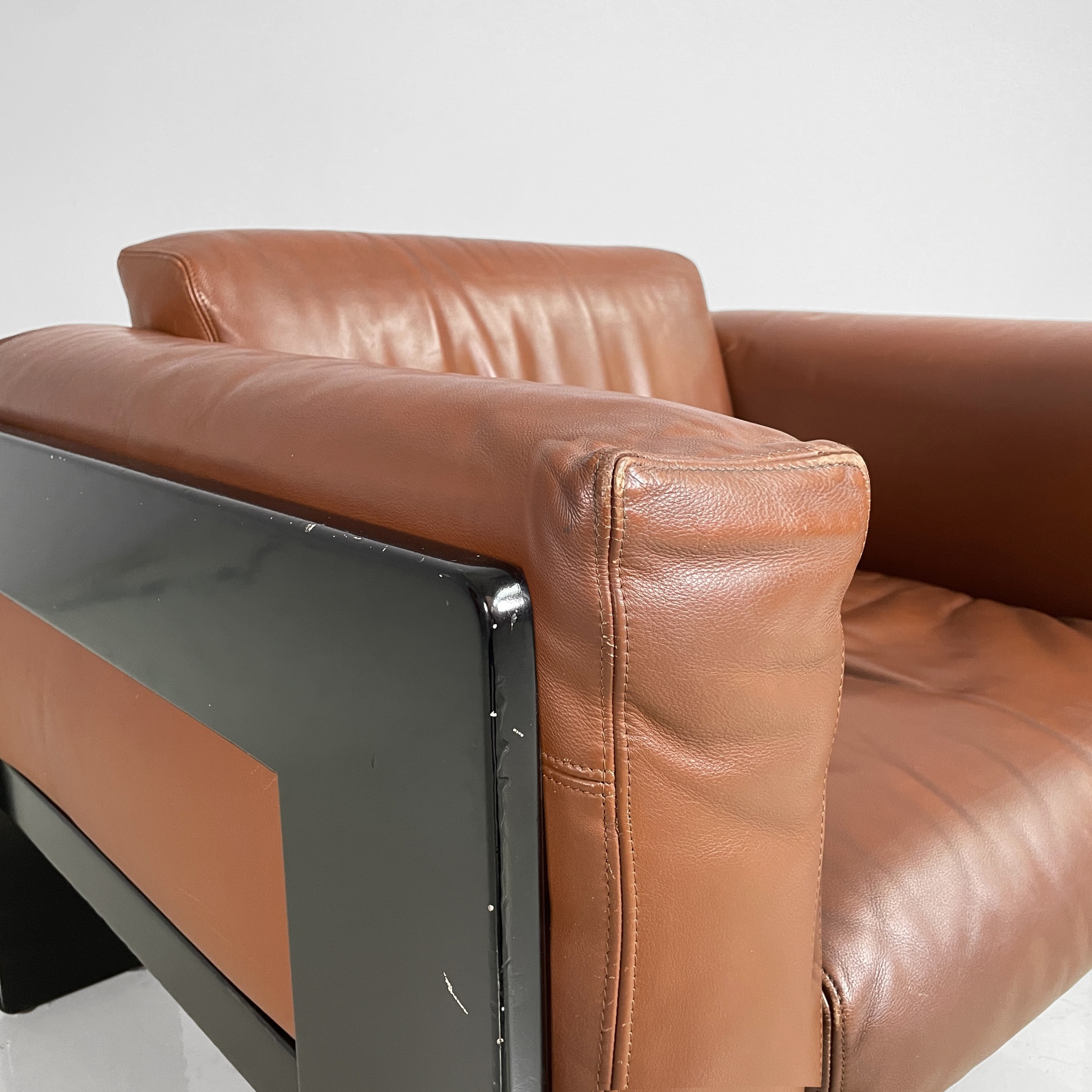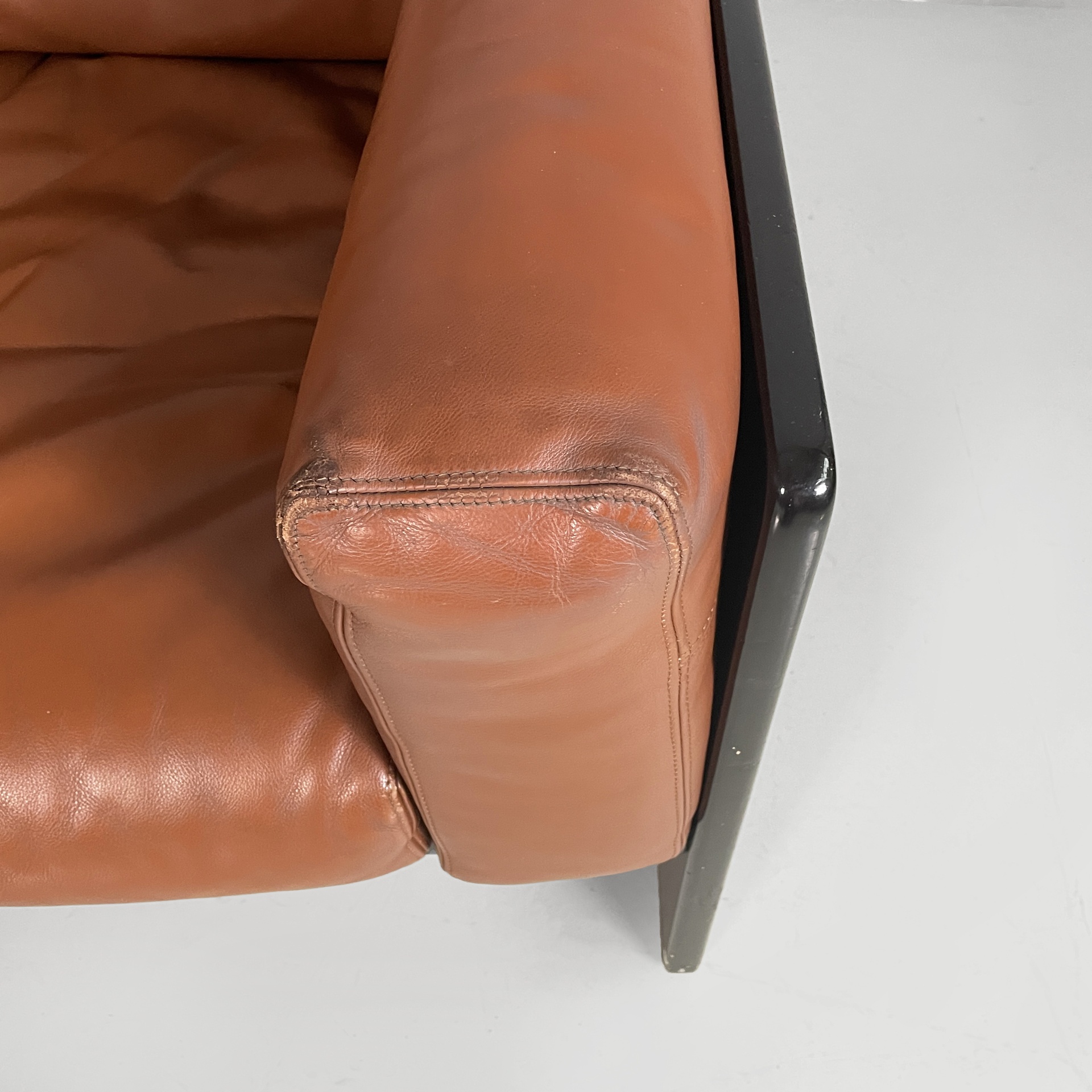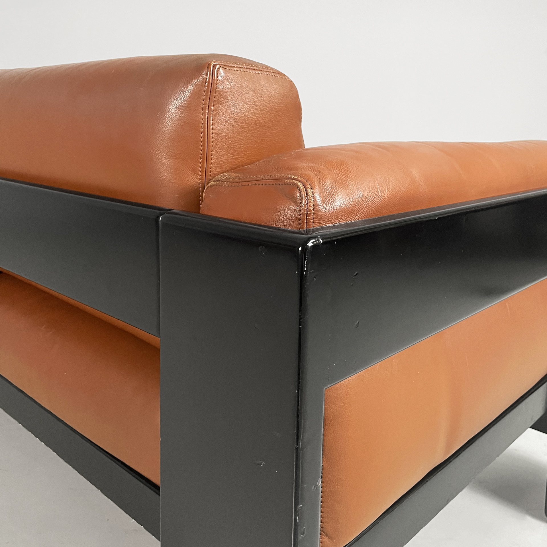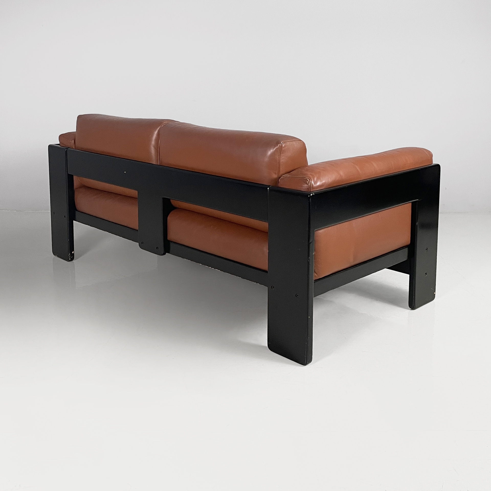 Divano a due posti modello Bastiano con seduta, schienale e braccioli composti da cuscini squadrati imbottiti e rivestiti in pelle marrone. La struttura è composta da listelli di legno laccato nero.