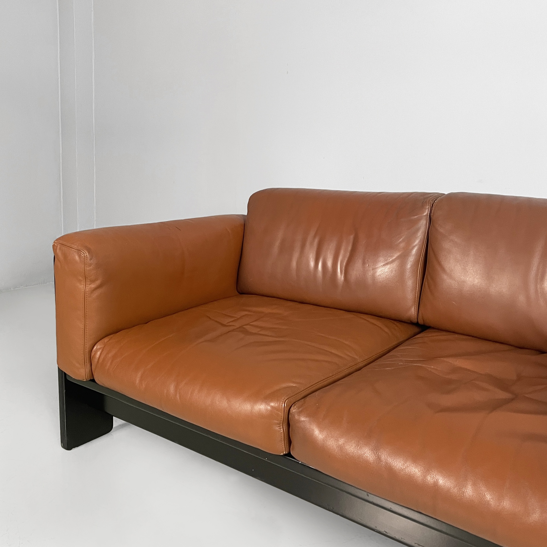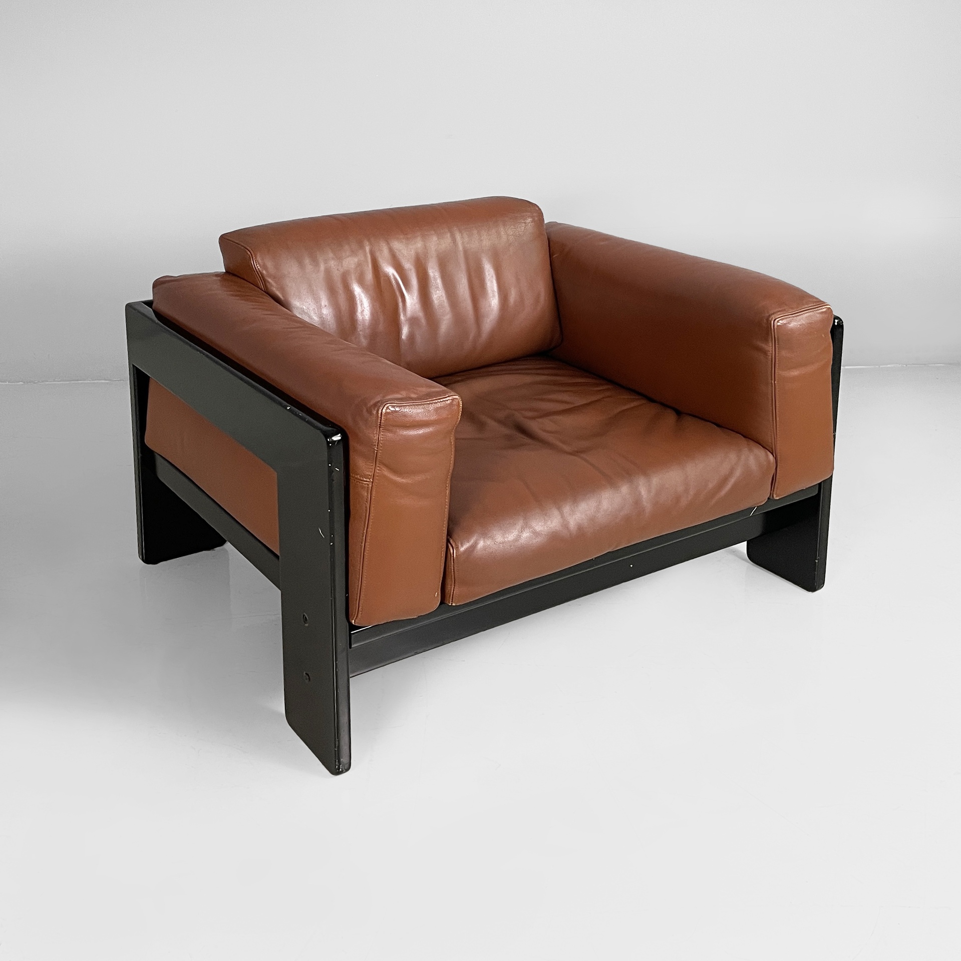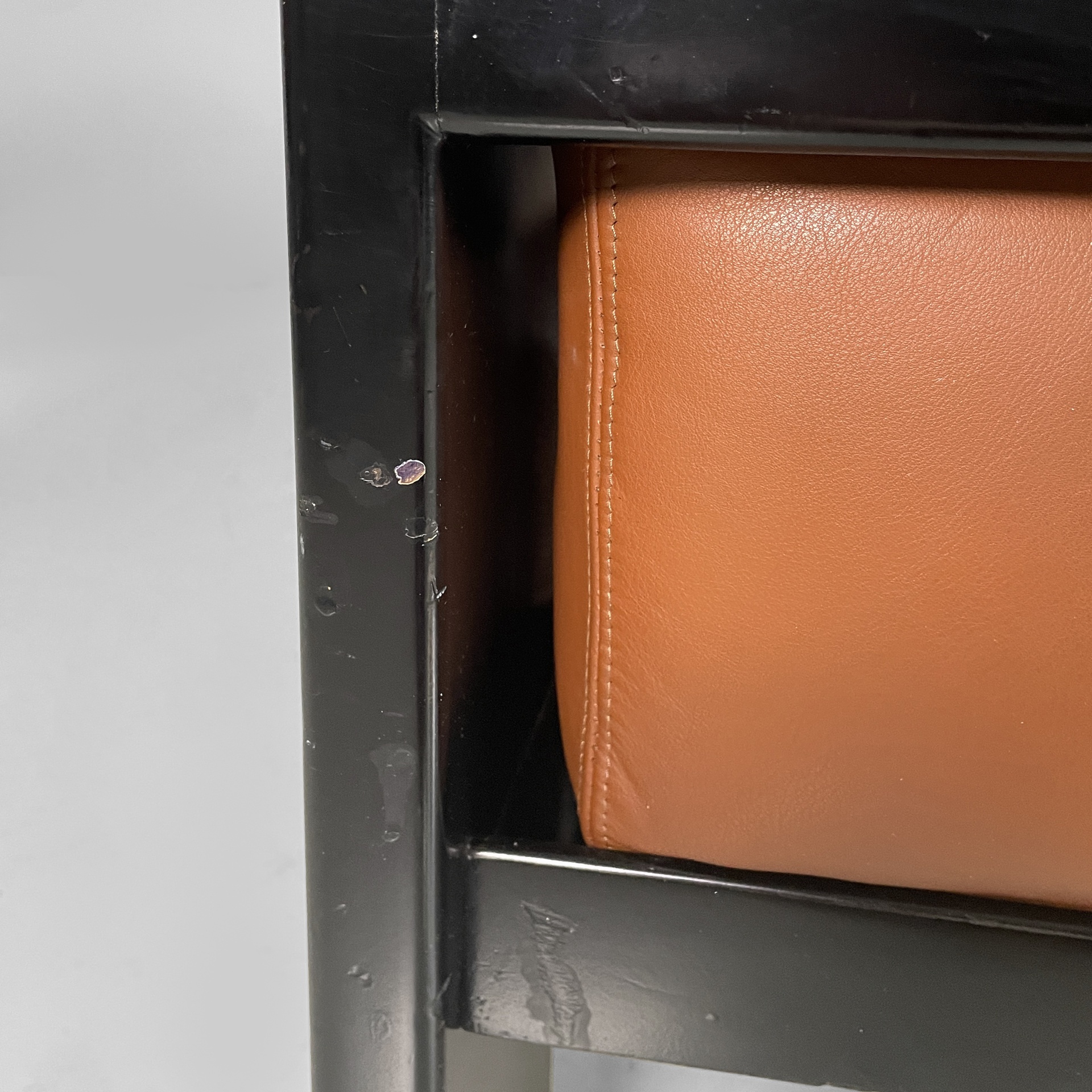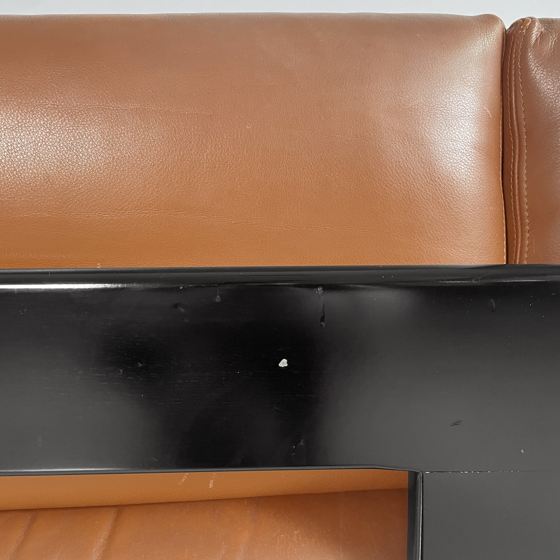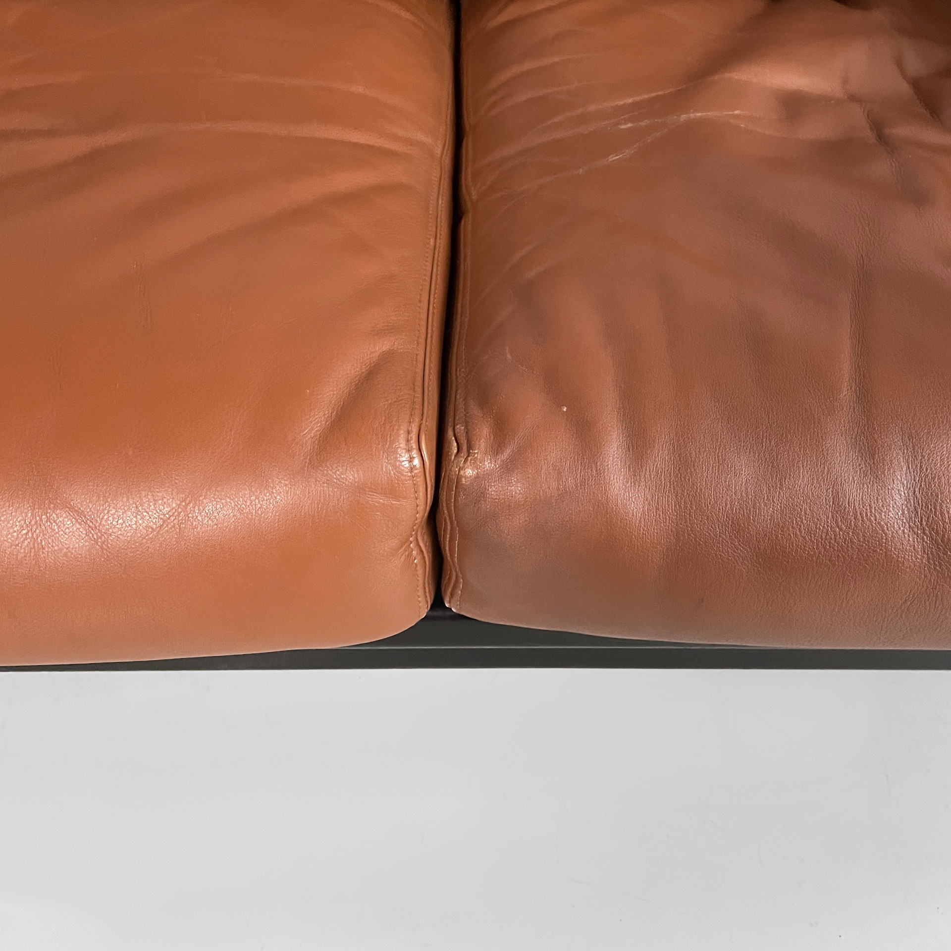 Divano a due posti modello Bastiano con seduta, schienale e braccioli composti da cuscini squadrati imbottiti e rivestiti in pelle marrone. La struttura è composta da listelli di legno laccato nero.