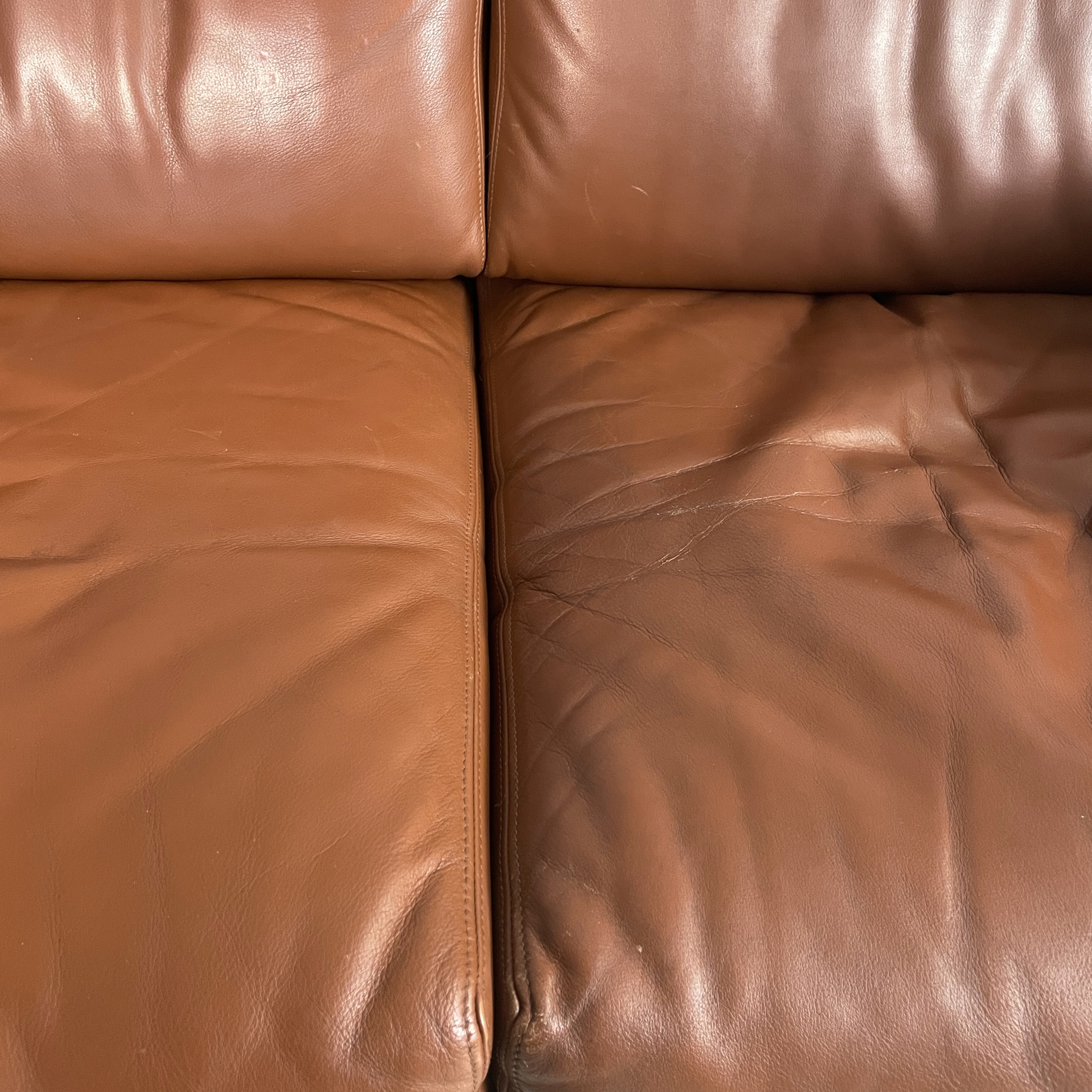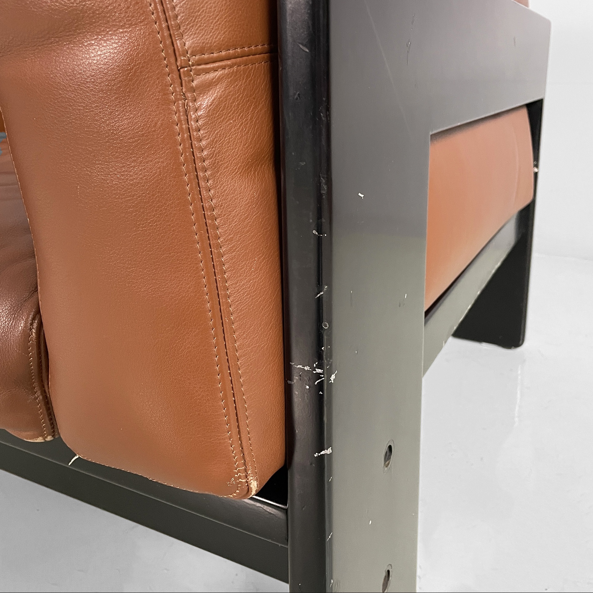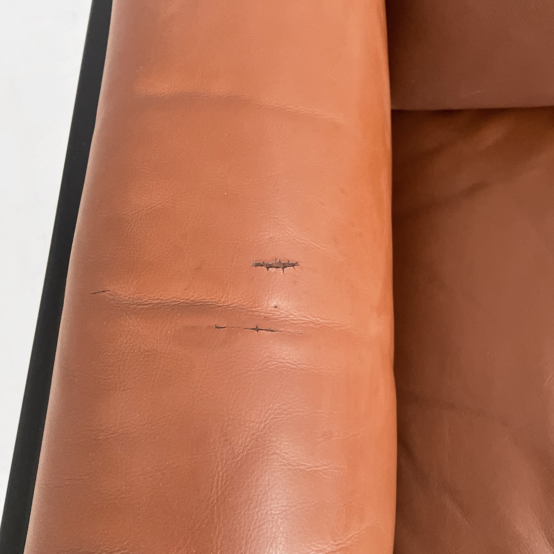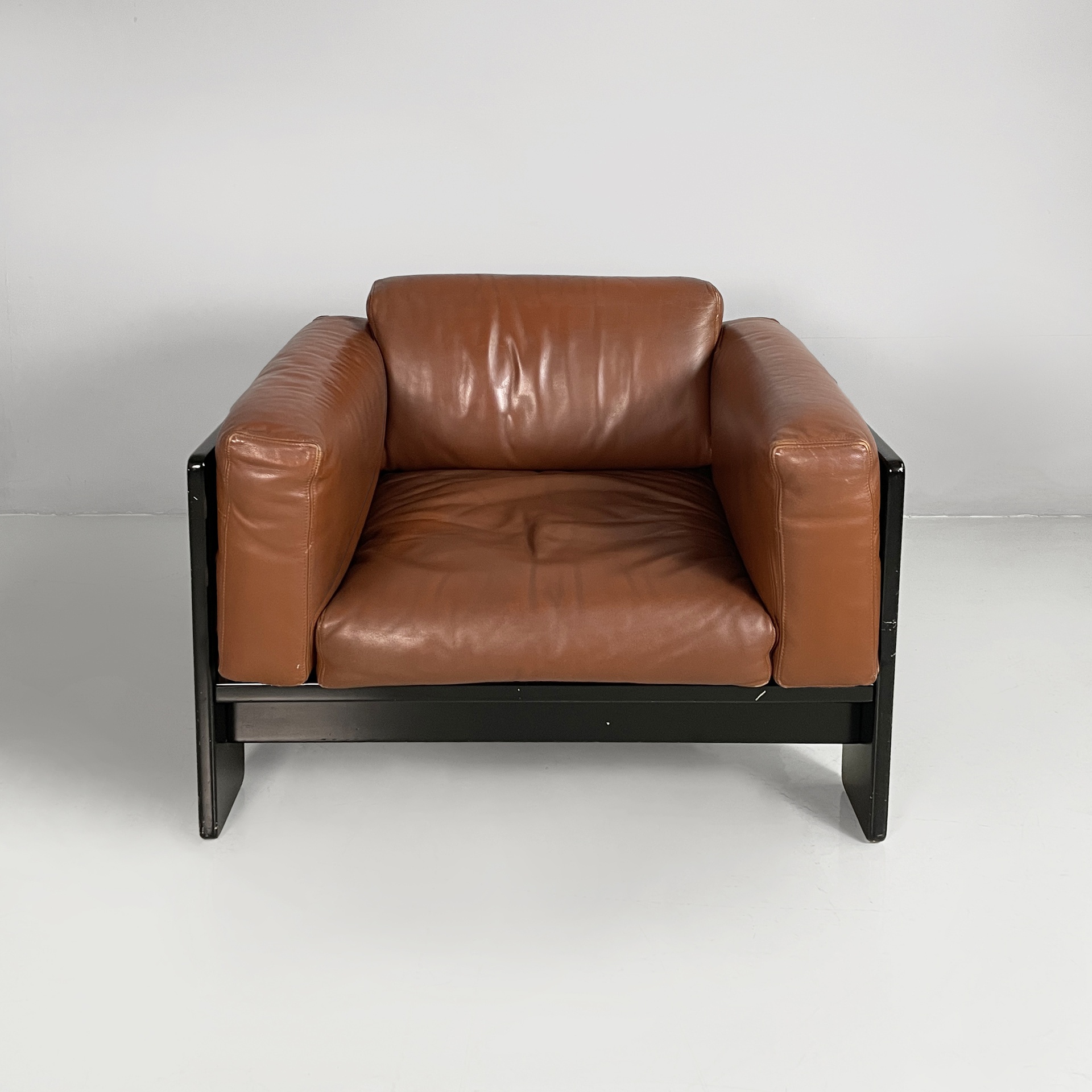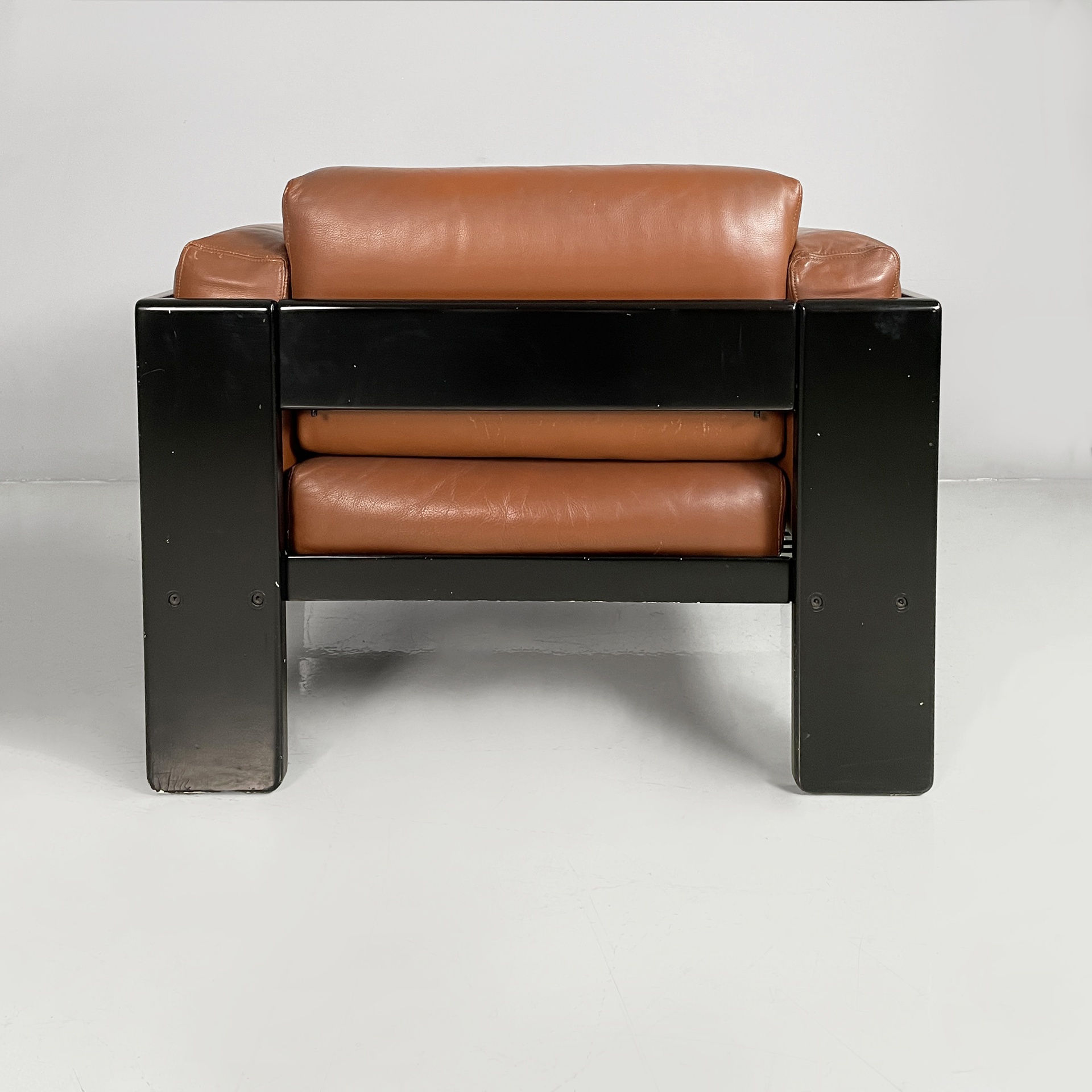 Divano a due posti modello Bastiano con seduta, schienale e braccioli composti da cuscini squadrati imbottiti e rivestiti in pelle marrone. La struttura è composta da listelli di legno laccato nero.