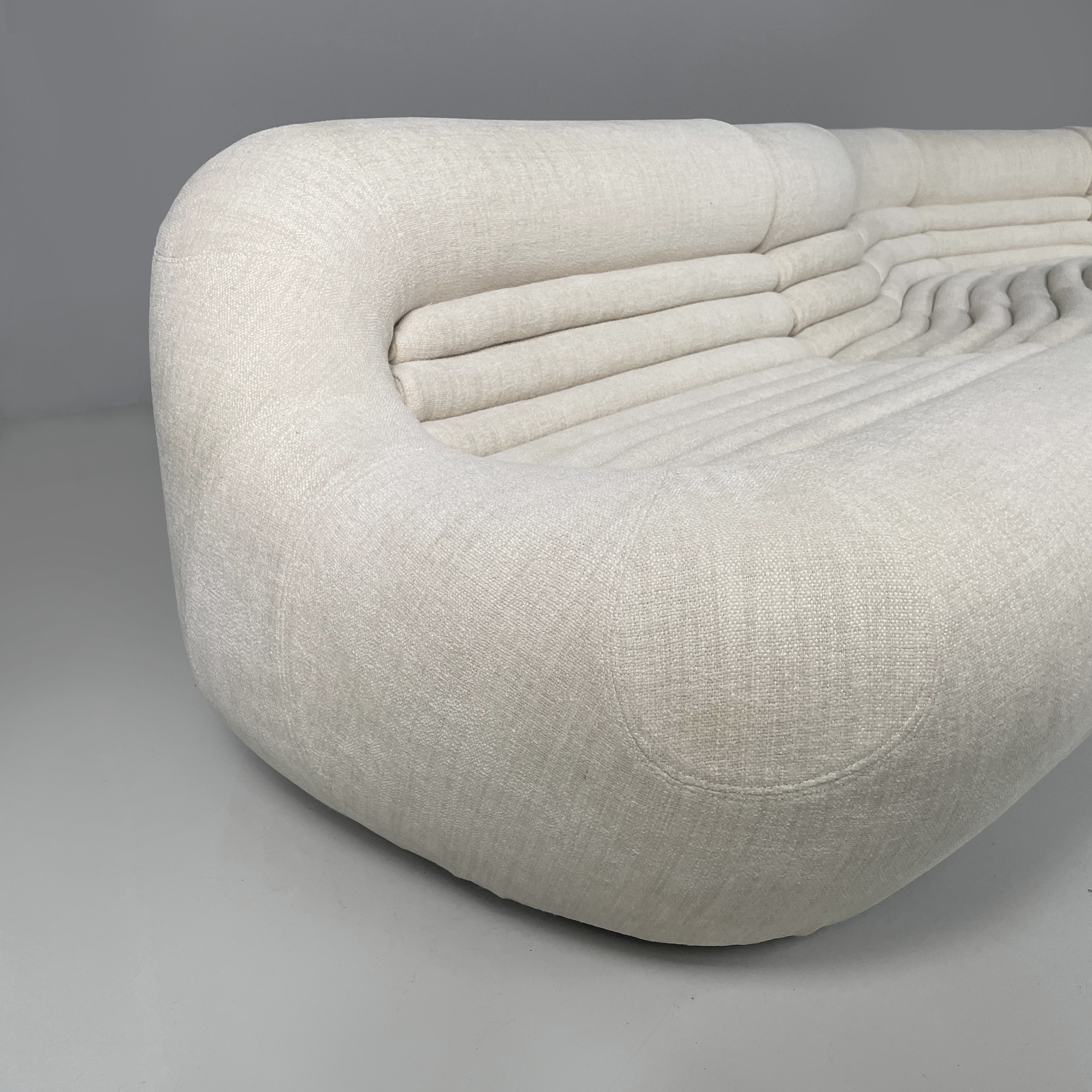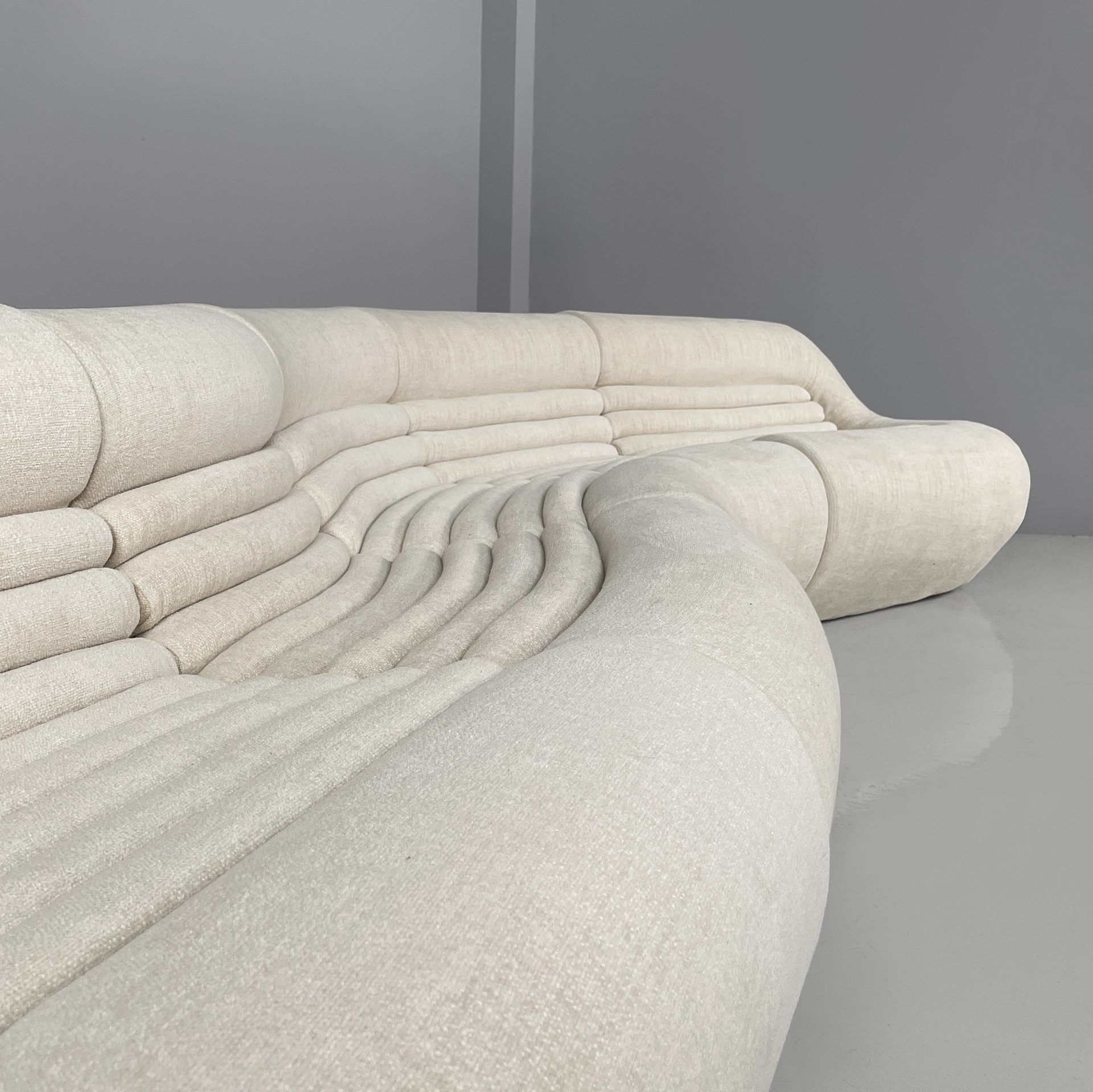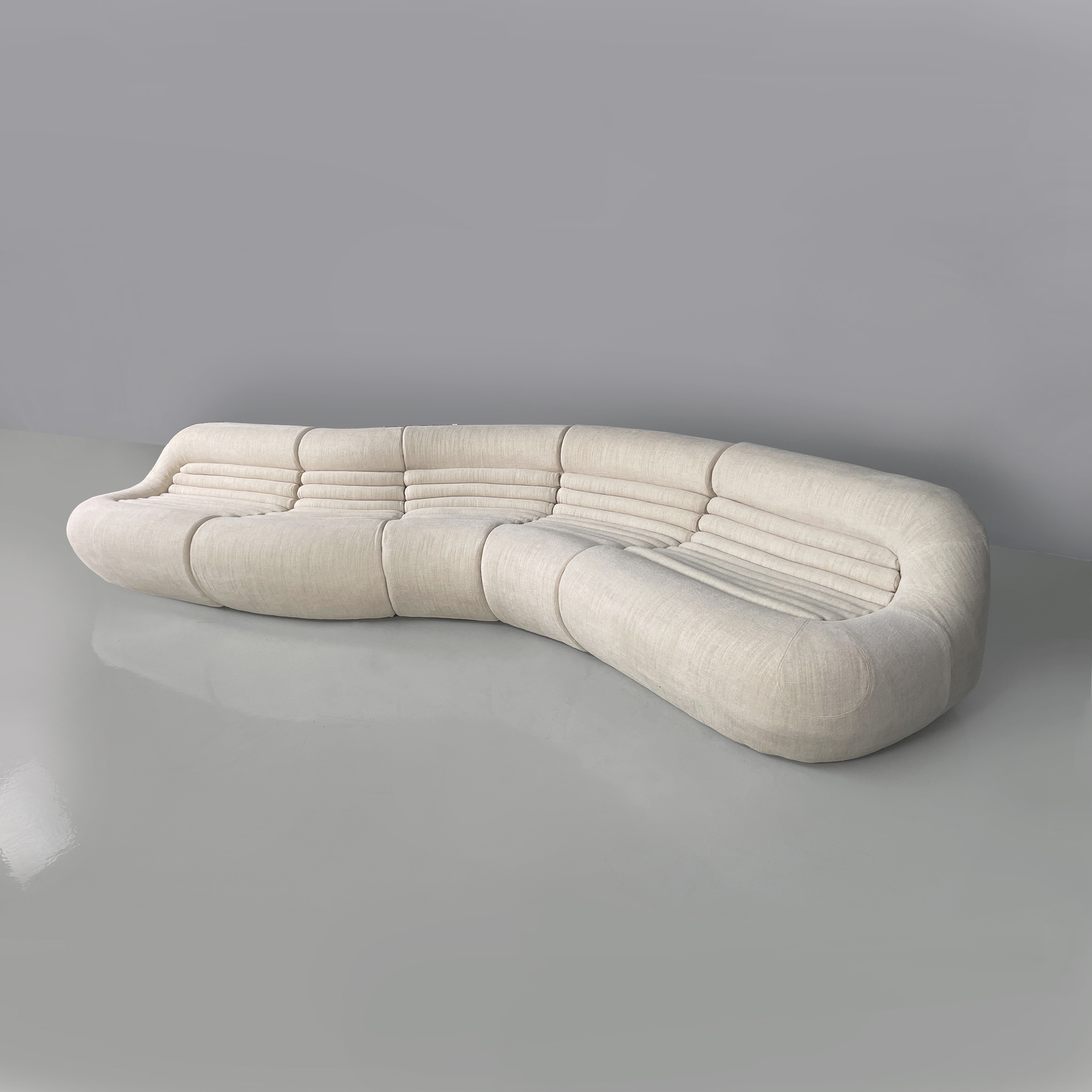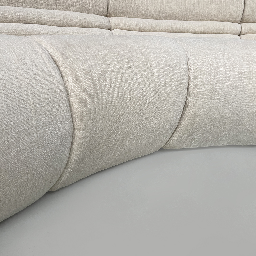 Divano modulare modello Carrera in tessuto bianco di Pierre Frey. Il divano, composto da cinque moduli, presenta una forma tondeggiante e sinuosa.