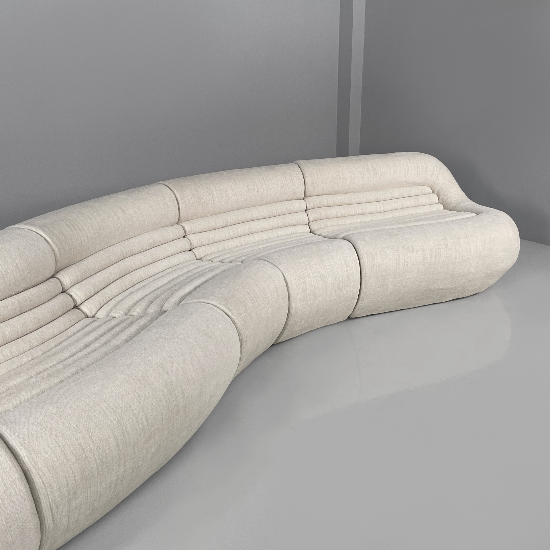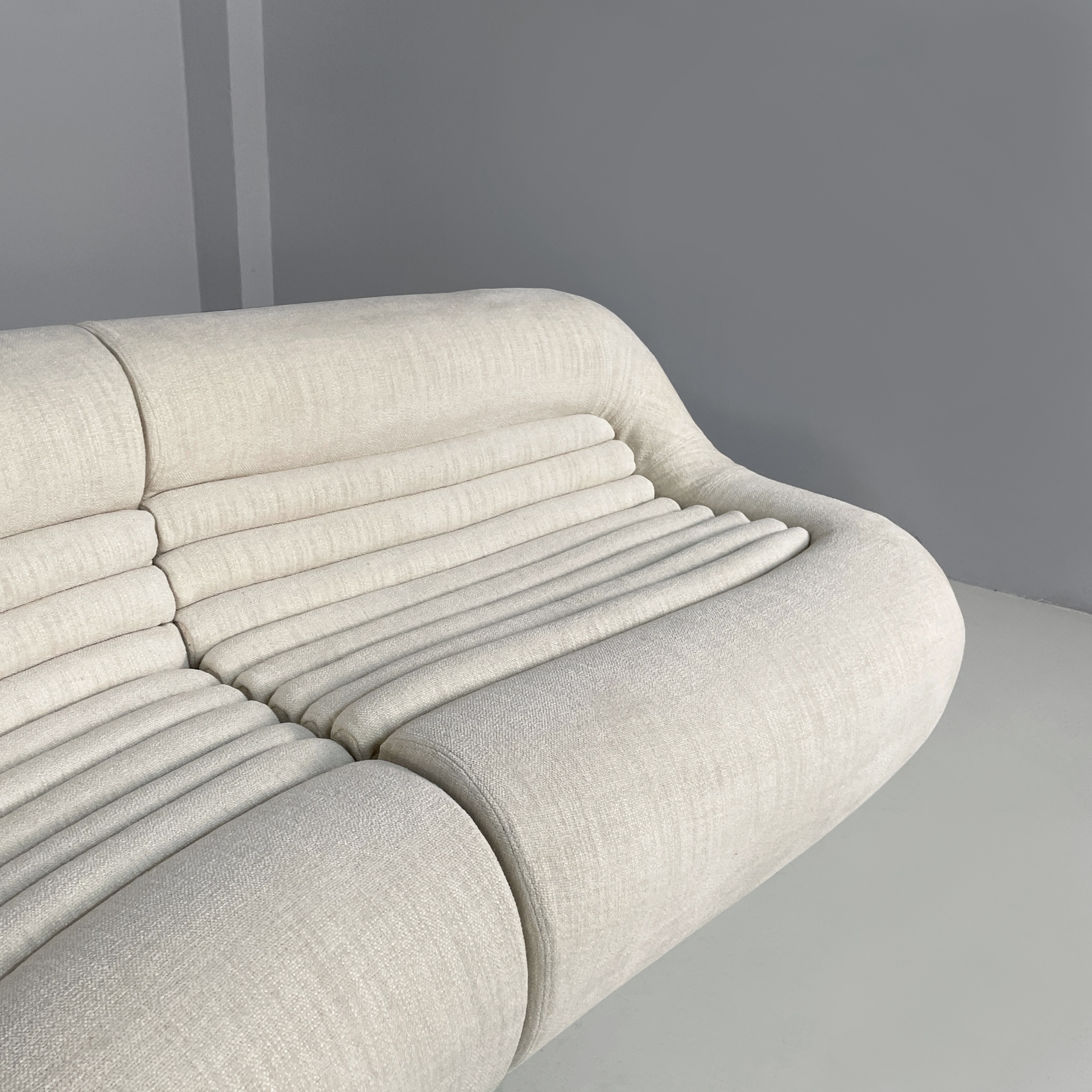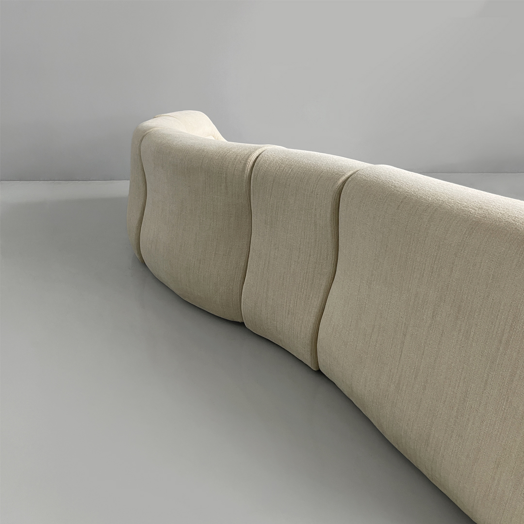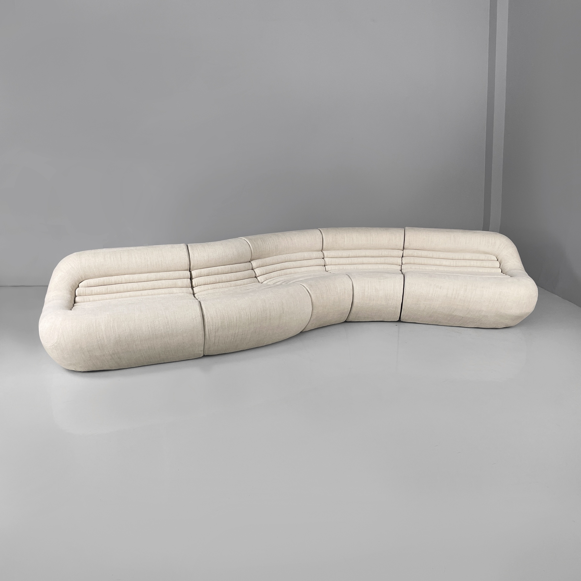 Divano modulare modello Carrera in tessuto bianco di Pierre Frey. Il divano, composto da cinque moduli, presenta una forma tondeggiante e sinuosa.