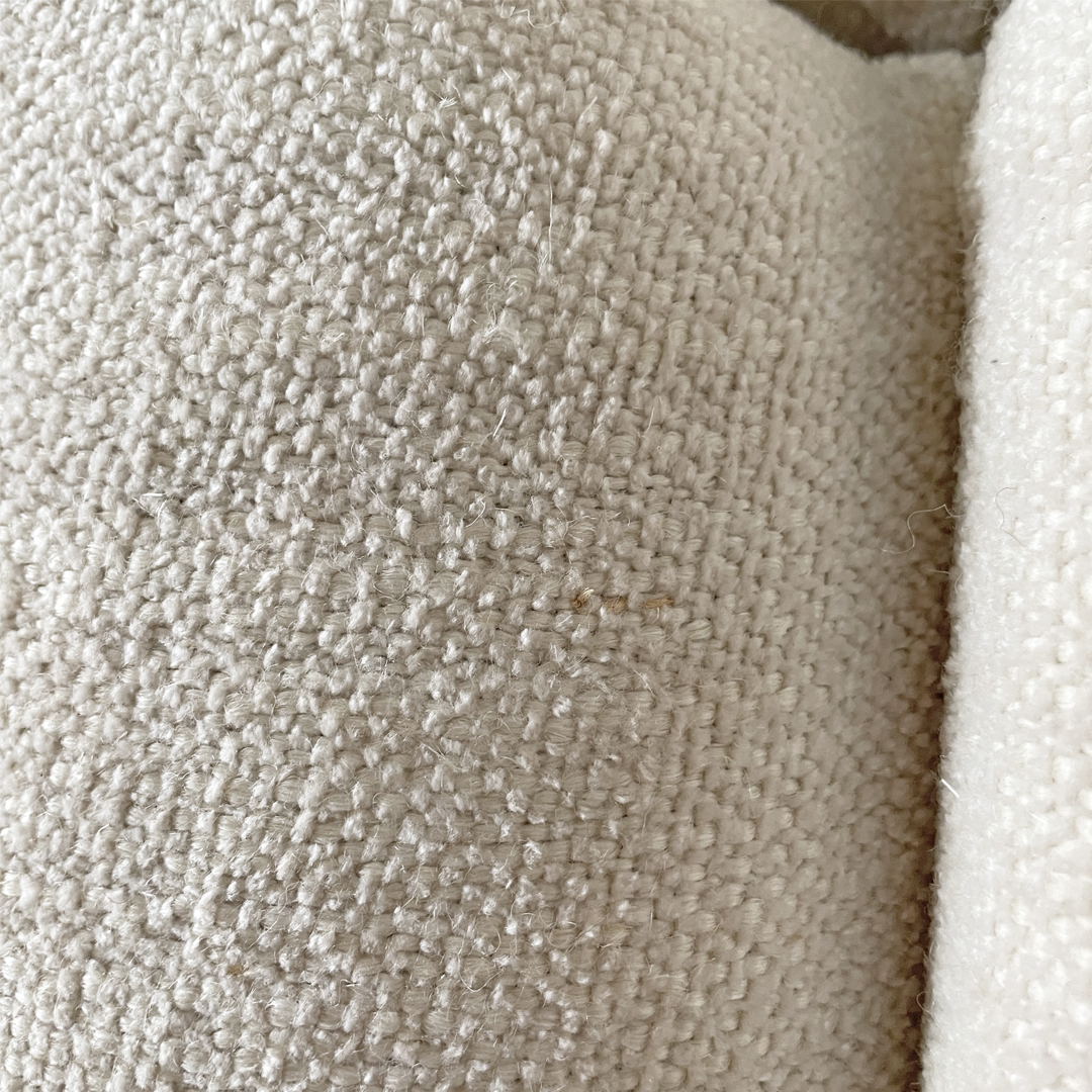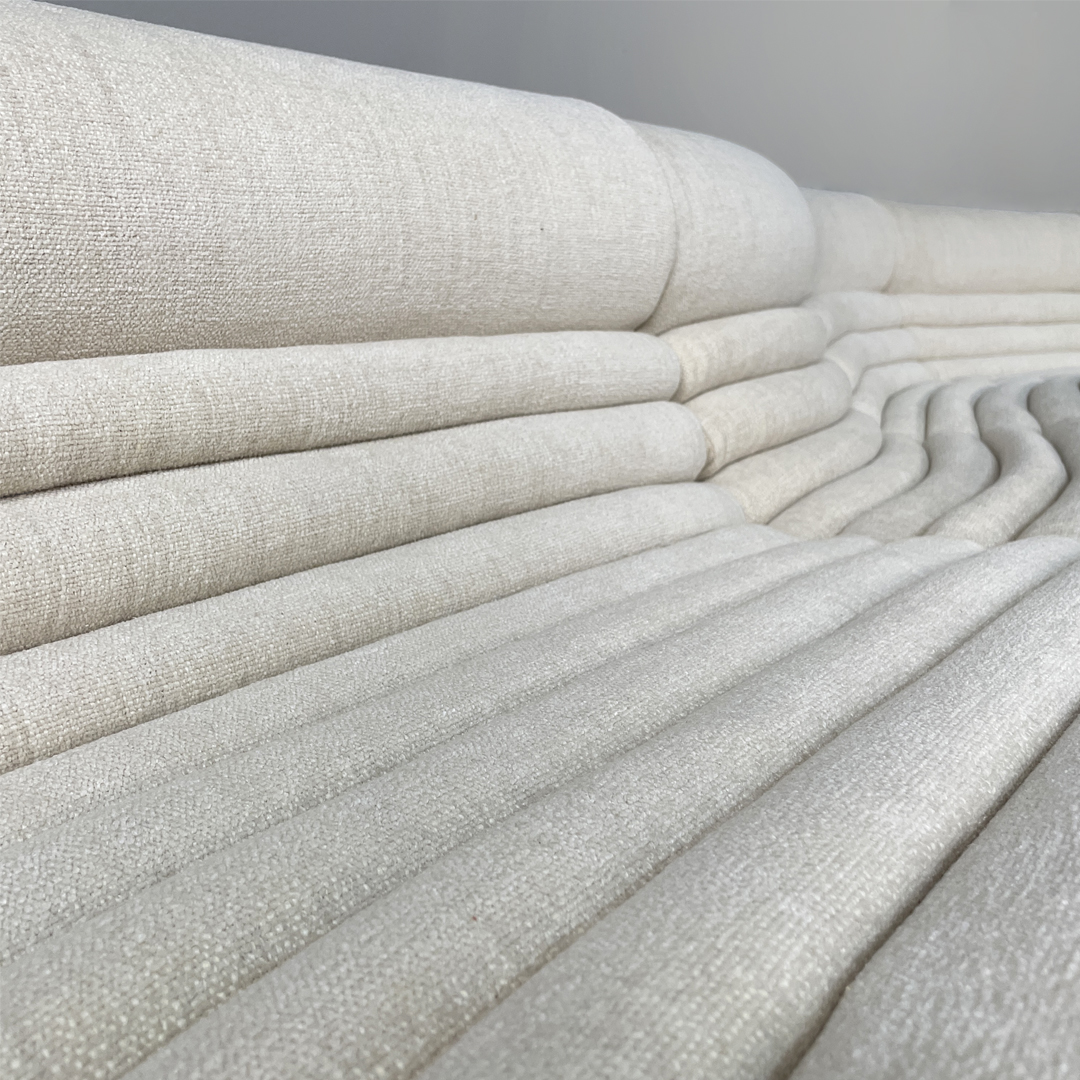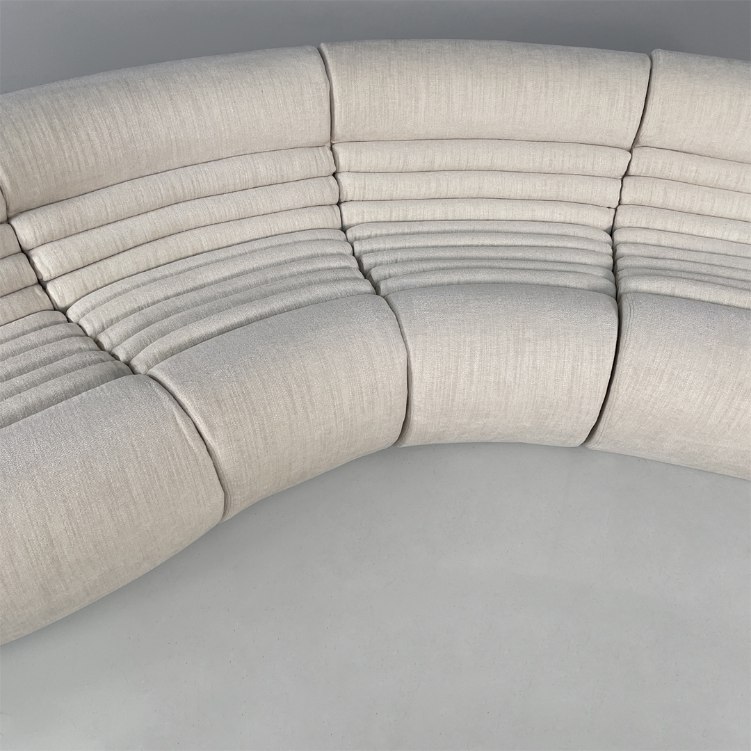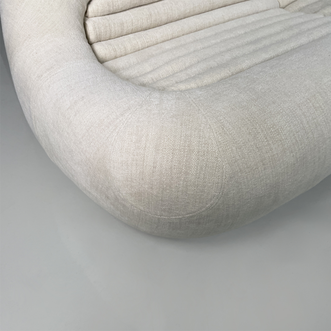 Divano modulare modello Carrera in tessuto bianco di Pierre Frey. Il divano, composto da cinque moduli, presenta una forma tondeggiante e sinuosa.