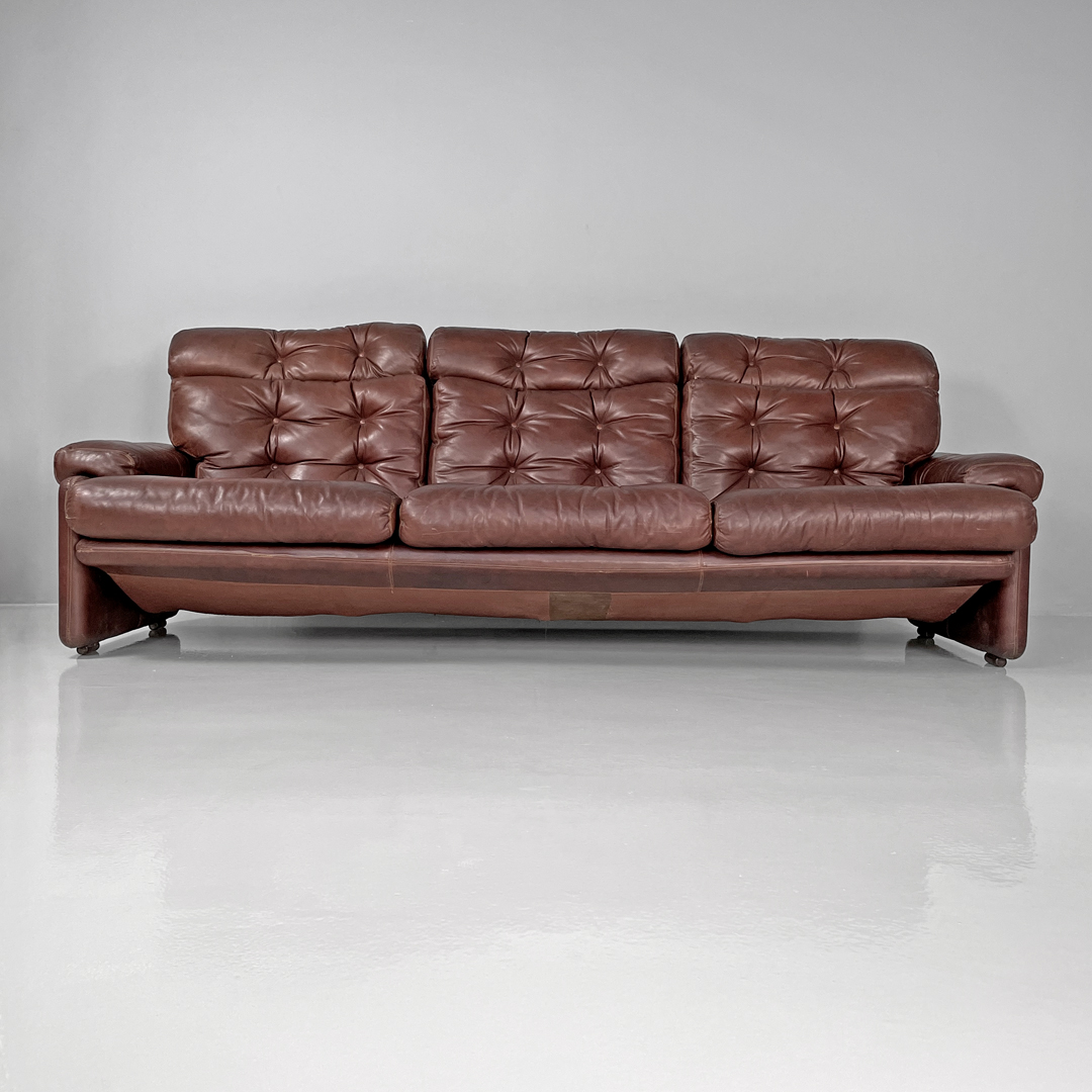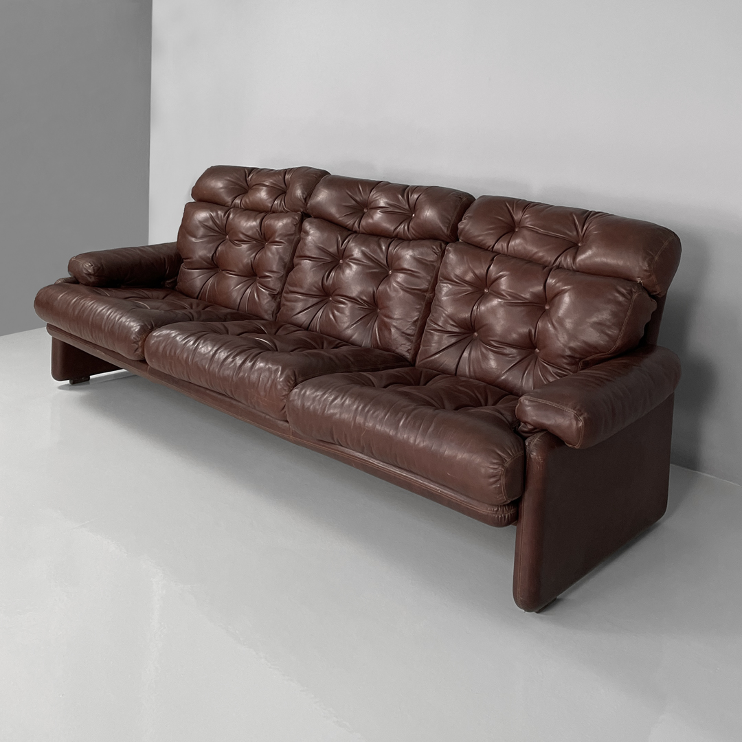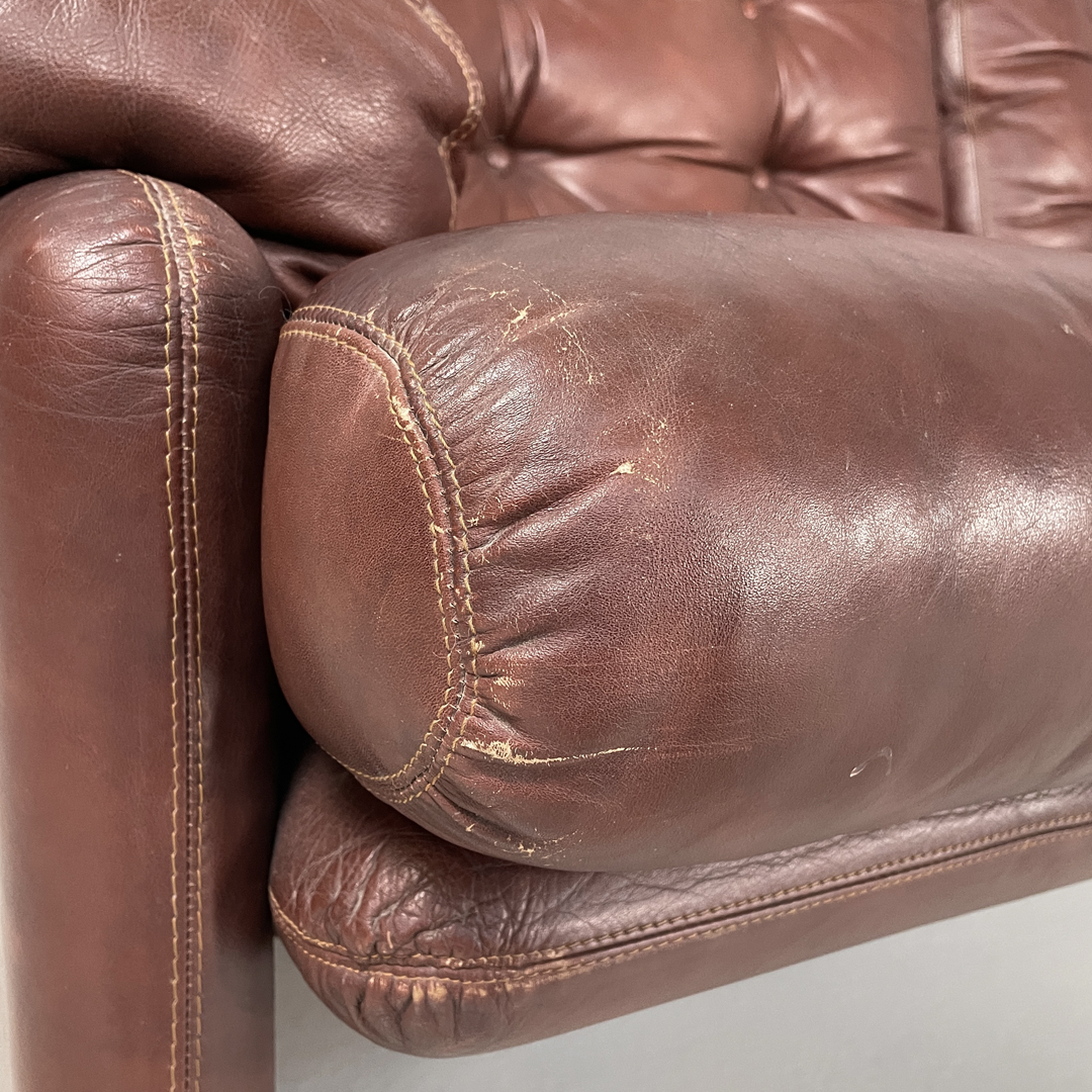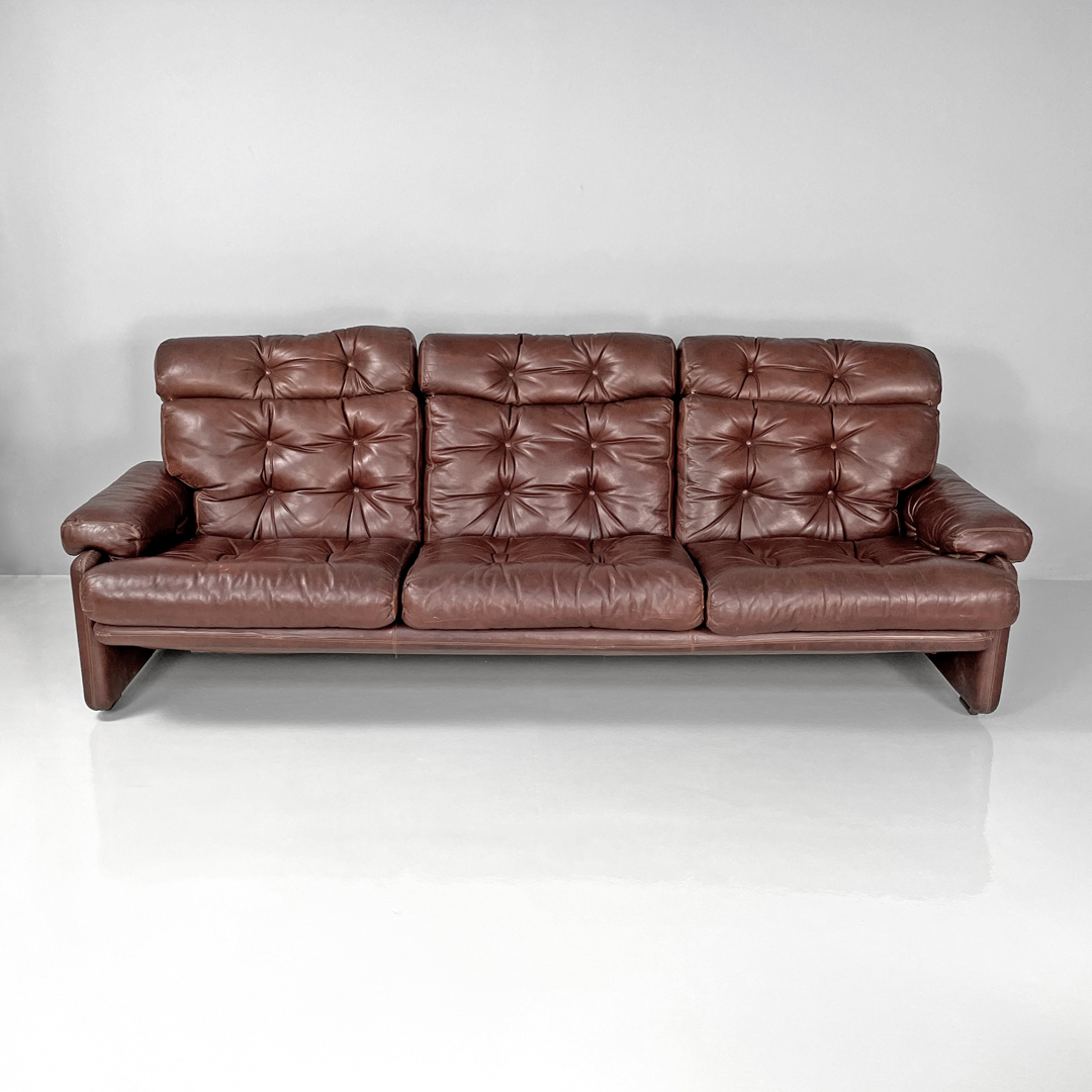 Divano modello Coronado in pelle marrone con schienale alto. Le sedute, i braccioli e lo schienale hanno linee curve e morbide, con bottoni. La struttura esterna del divano è rigida e anch’essa rivestita in pelle. Presenta quattro piedini cilindrici in plastica marrone.