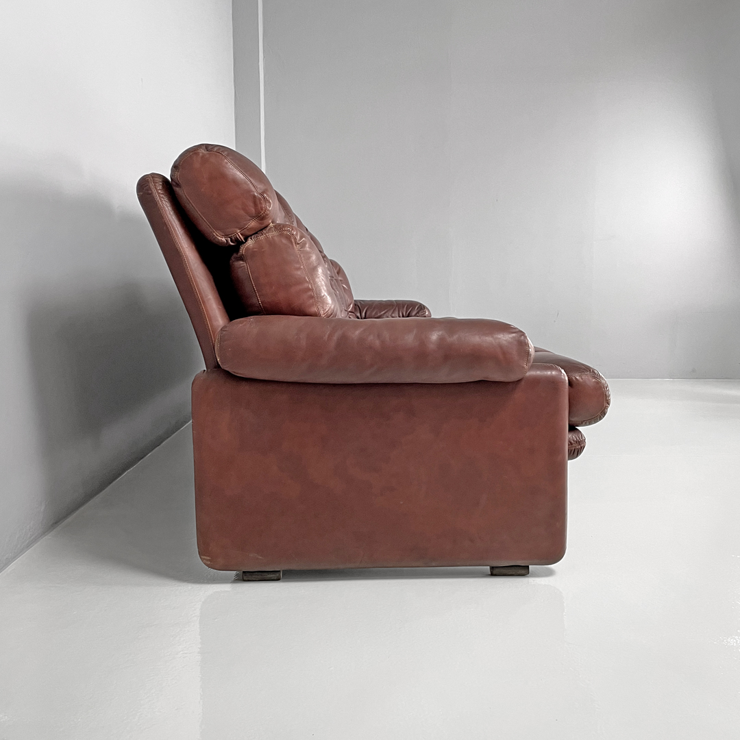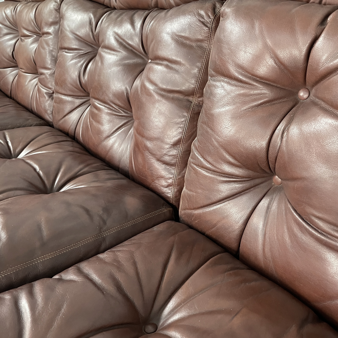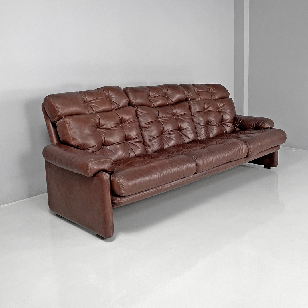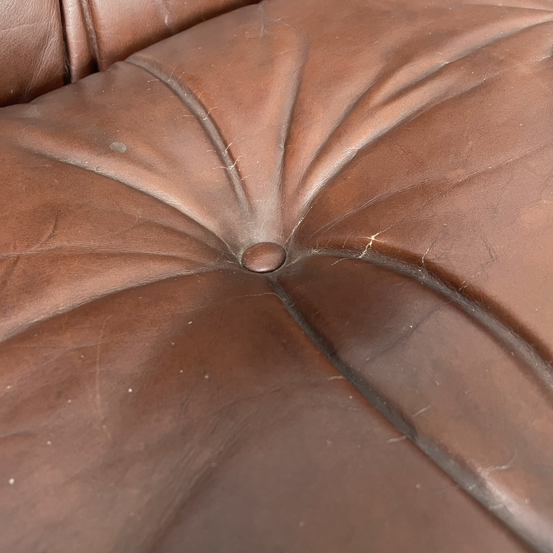 Divano modello Coronado in pelle marrone con schienale alto. Le sedute, i braccioli e lo schienale hanno linee curve e morbide, con bottoni. La struttura esterna del divano è rigida e anch’essa rivestita in pelle. Presenta quattro piedini cilindrici in plastica marrone.