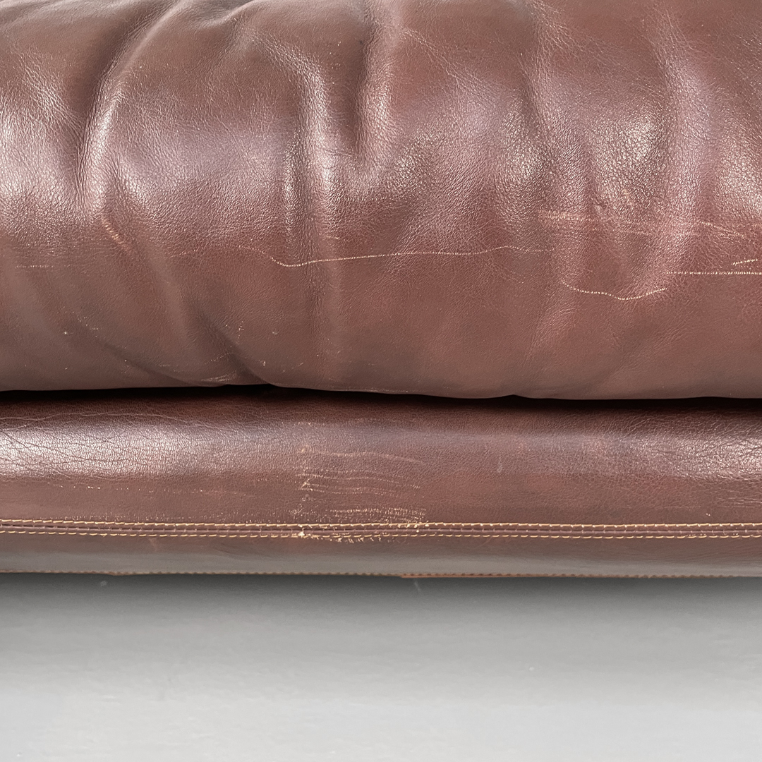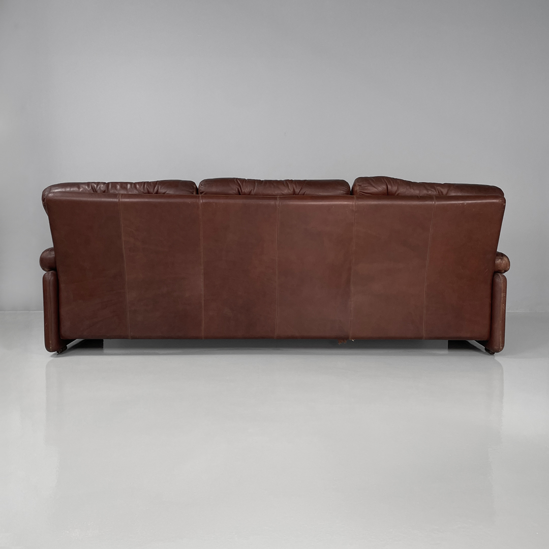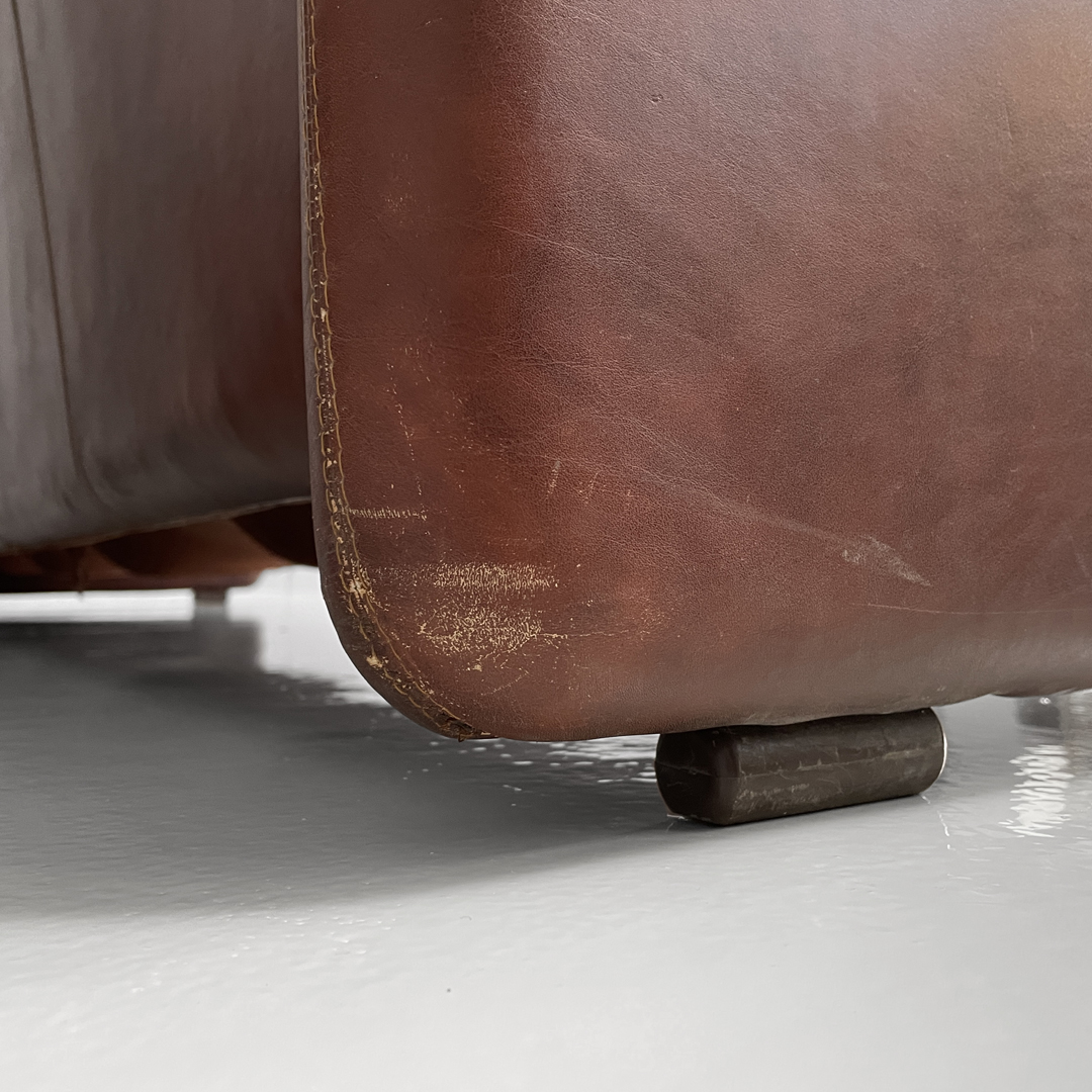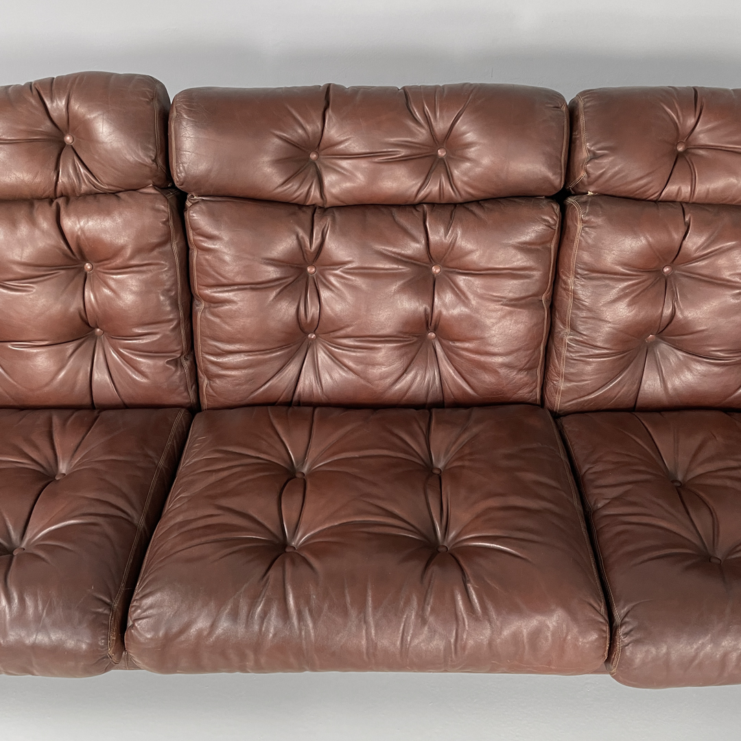 Divano modello Coronado in pelle marrone con schienale alto. Le sedute, i braccioli e lo schienale hanno linee curve e morbide, con bottoni. La struttura esterna del divano è rigida e anch’essa rivestita in pelle. Presenta quattro piedini cilindrici in plastica marrone.
