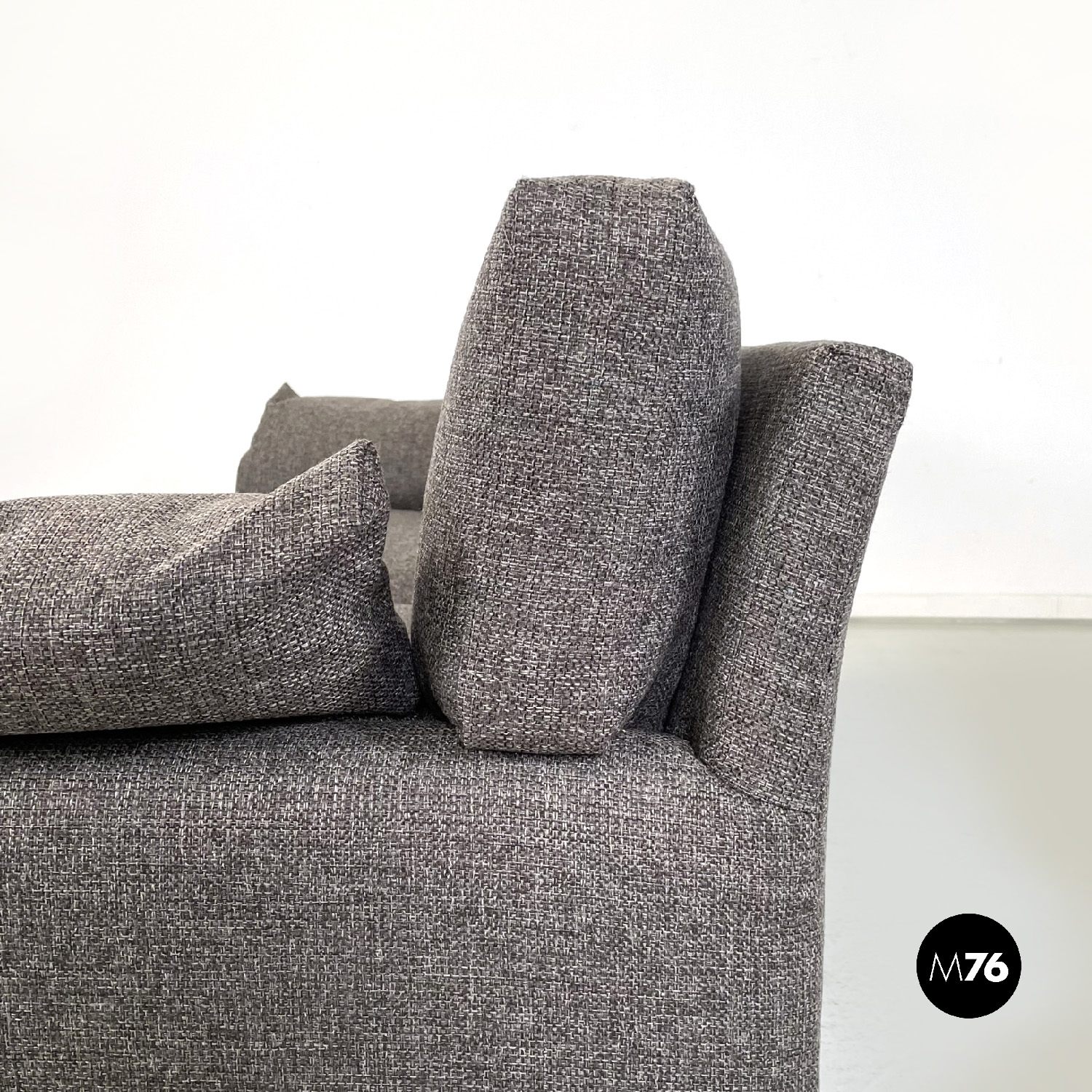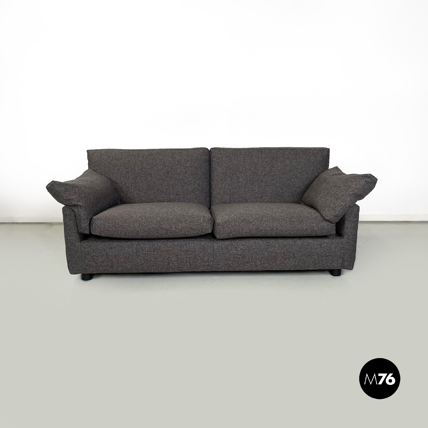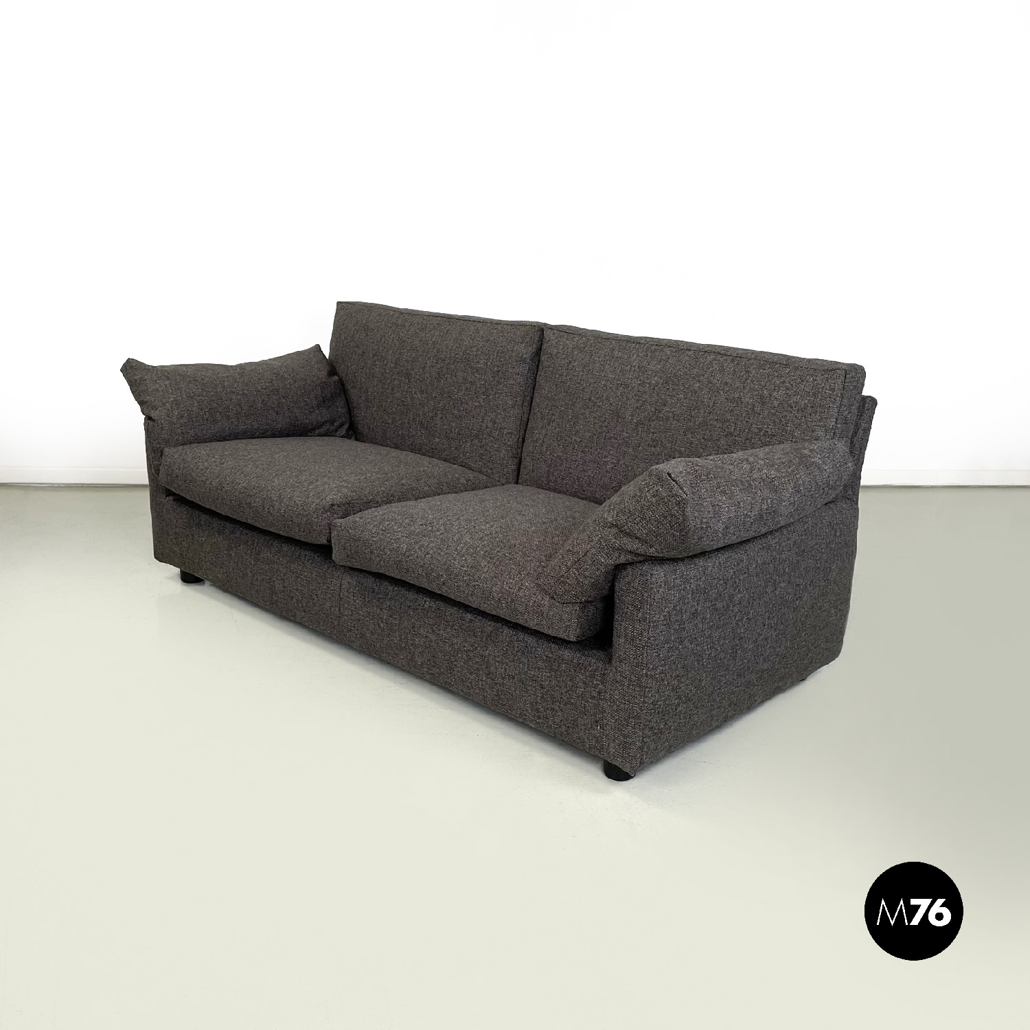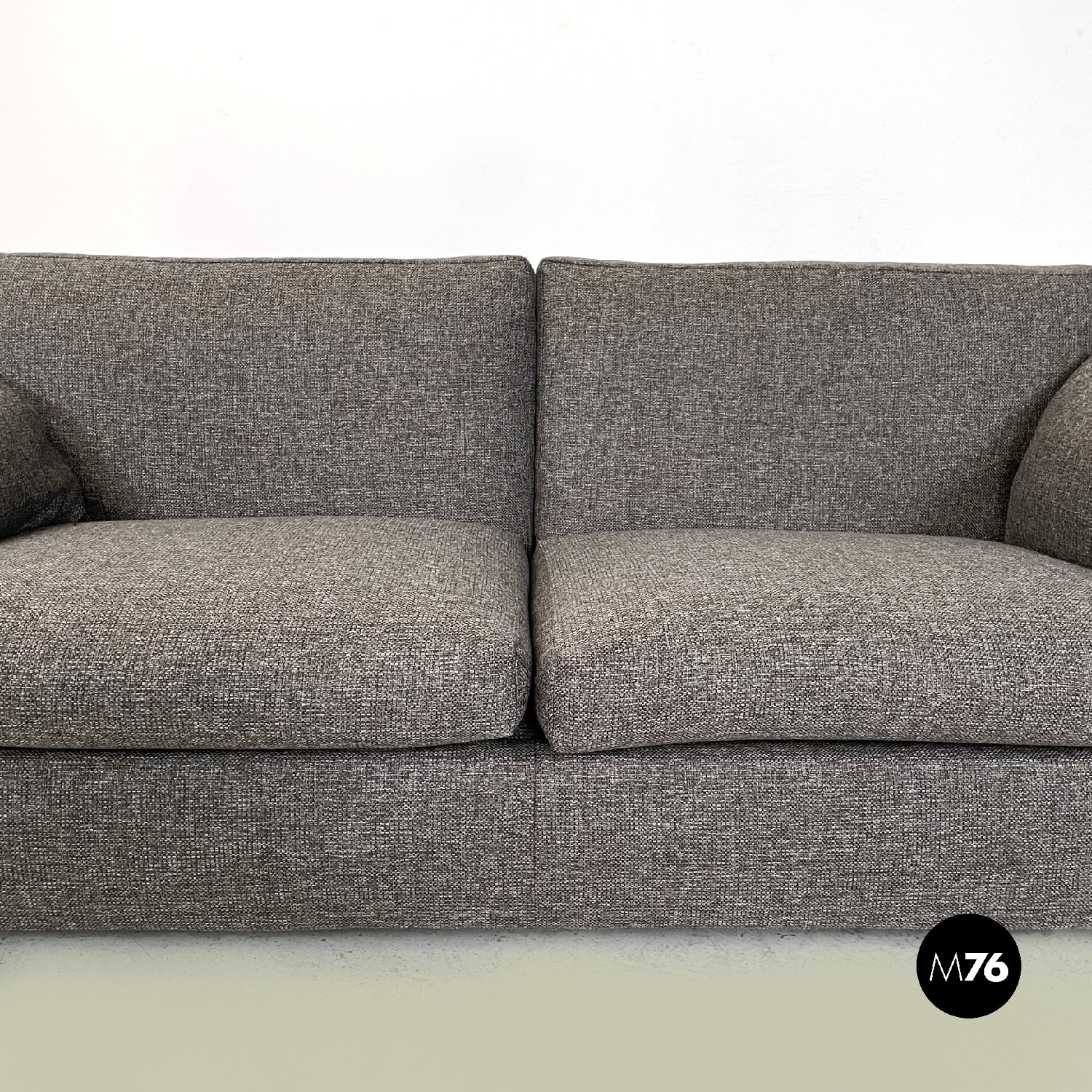 Divano a due posti rettangolare. La seduta è composta da due cuscini a cui corrispondono altri due cuscini a comporre lo schienale. I braccioli sono composti a loro volta da due cuscini che partono dalla seduta e allungandosi curvano per creare un appoggio. La struttura è interamente rivestita di un tessuto grigio-marrone a trama spessa. I quattro piedini sono dei cilindri in plastica nera.
