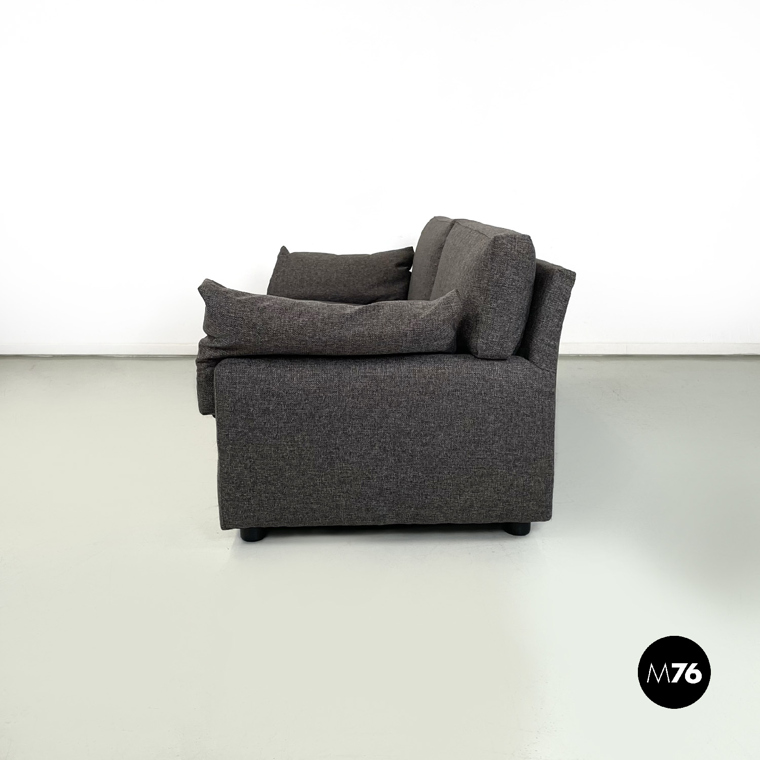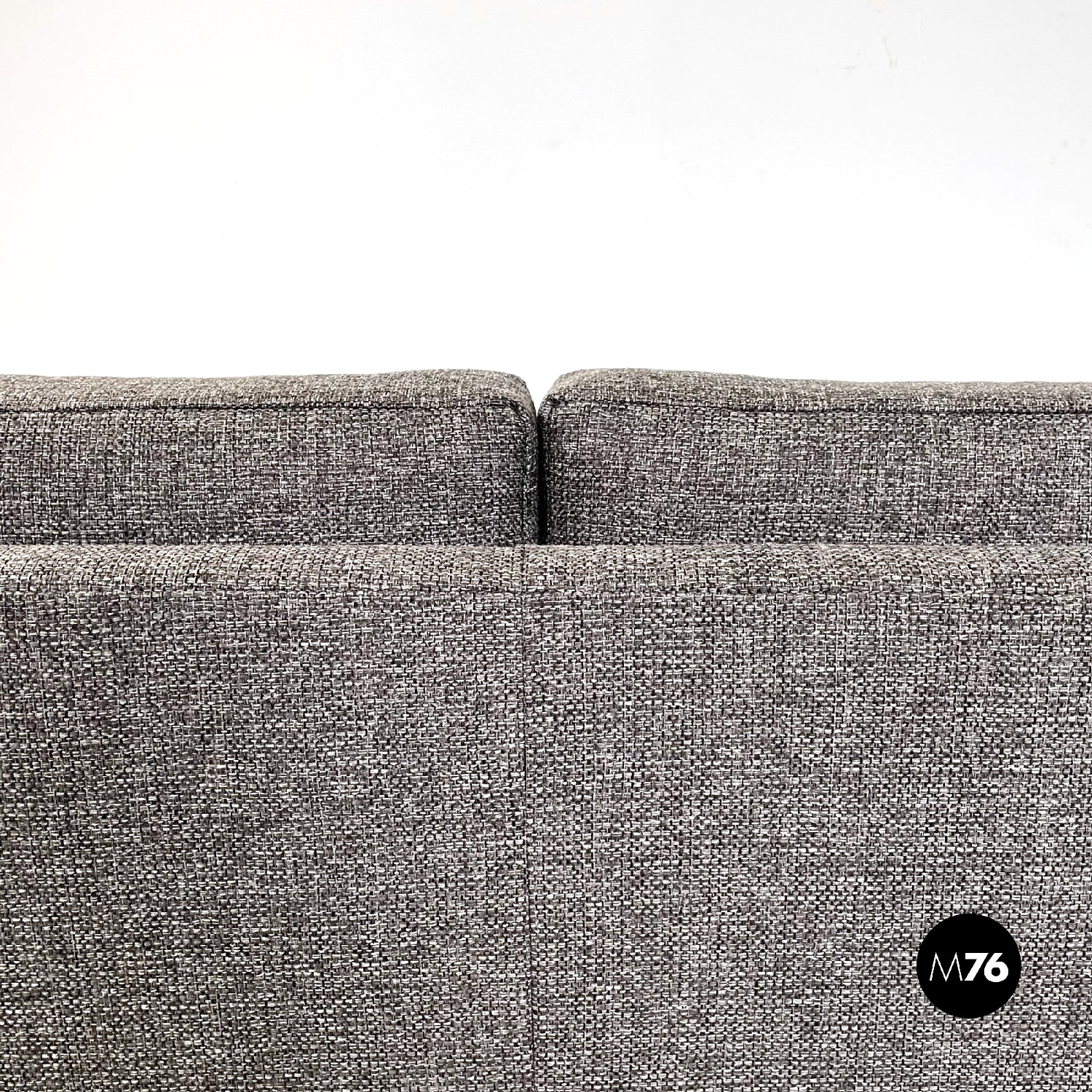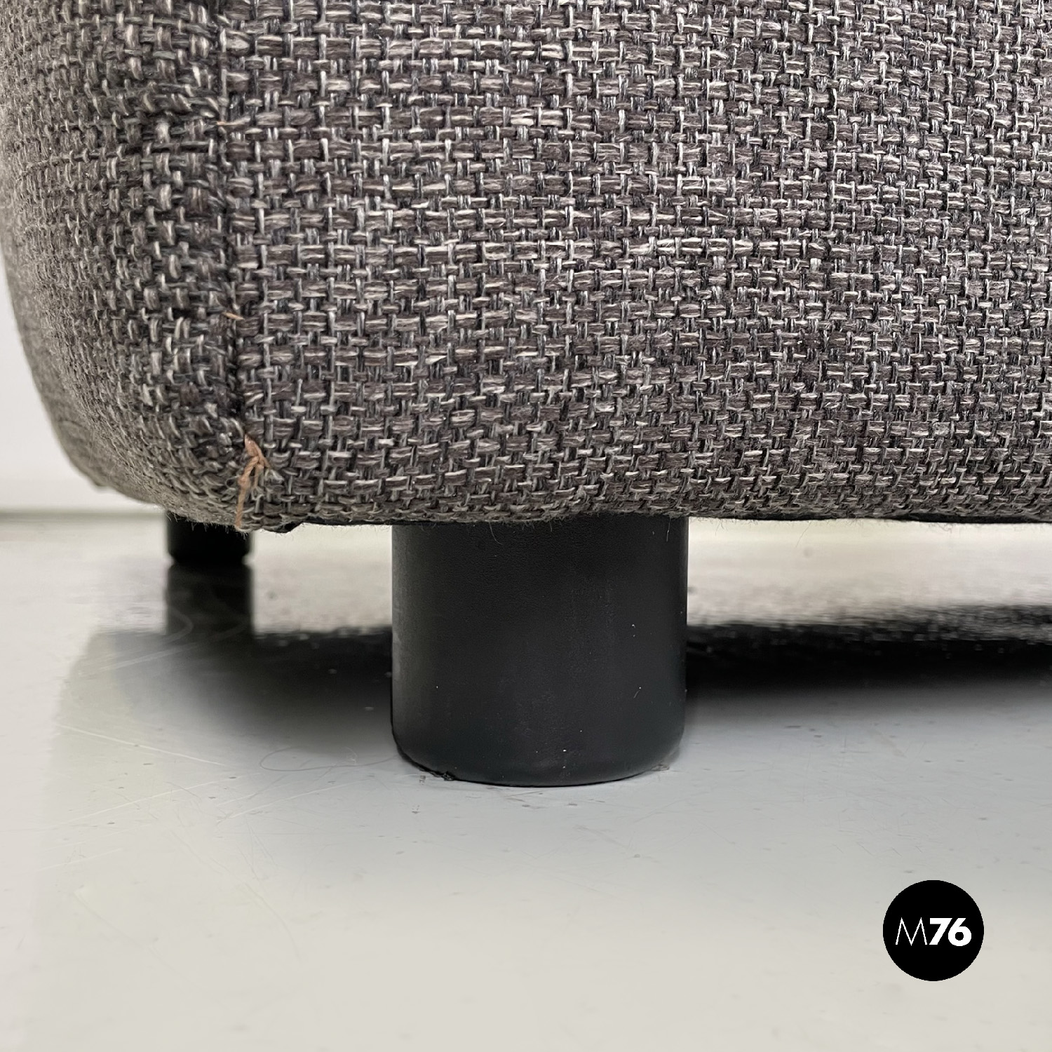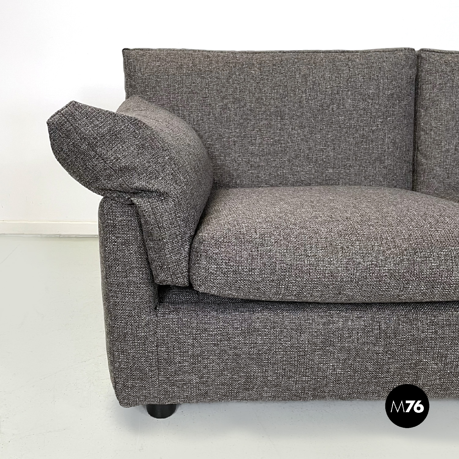 Divano a due posti rettangolare. La seduta è composta da due cuscini a cui corrispondono altri due cuscini a comporre lo schienale. I braccioli sono composti a loro volta da due cuscini che partono dalla seduta e allungandosi curvano per creare un appoggio. La struttura è interamente rivestita di un tessuto grigio-marrone a trama spessa. I quattro piedini sono dei cilindri in plastica nera.