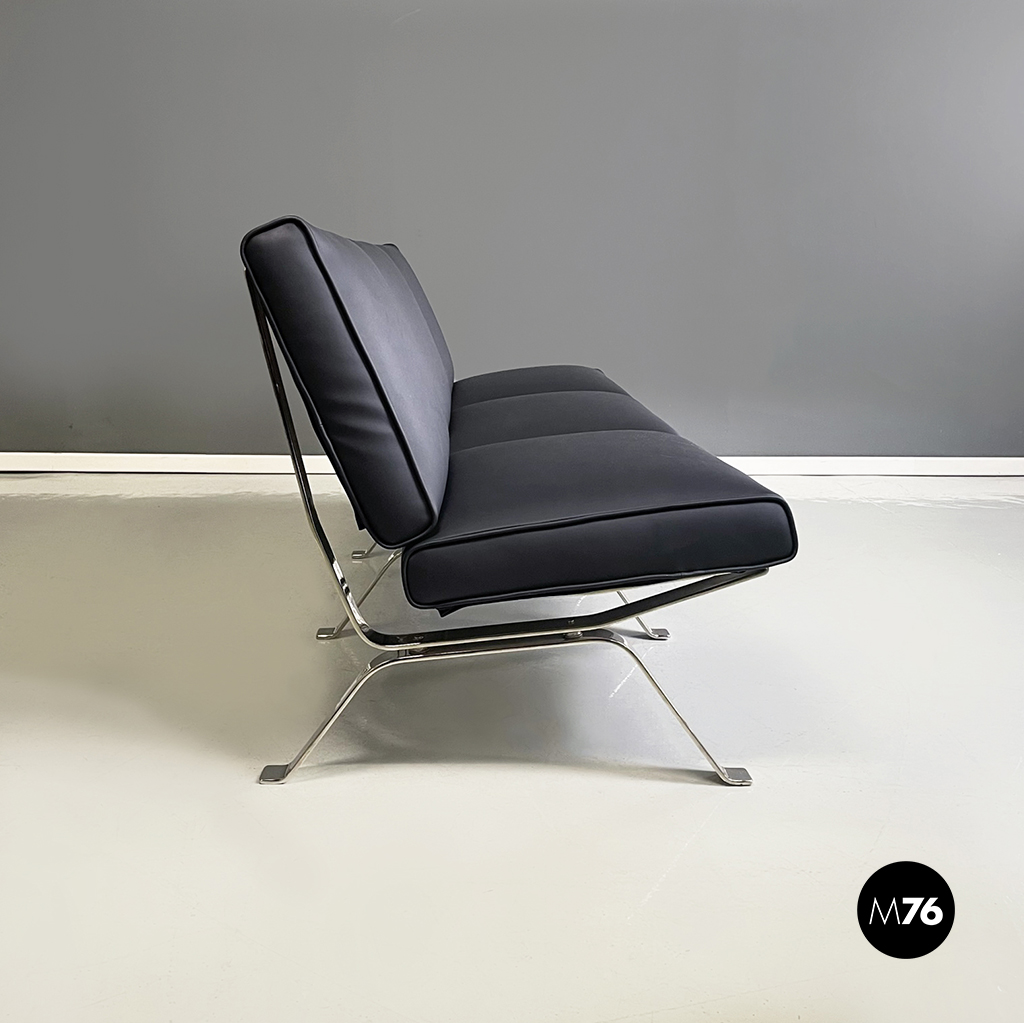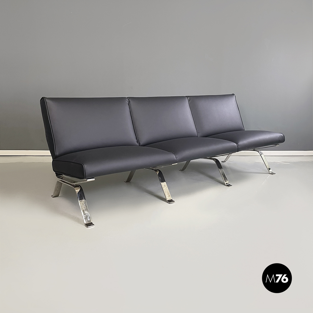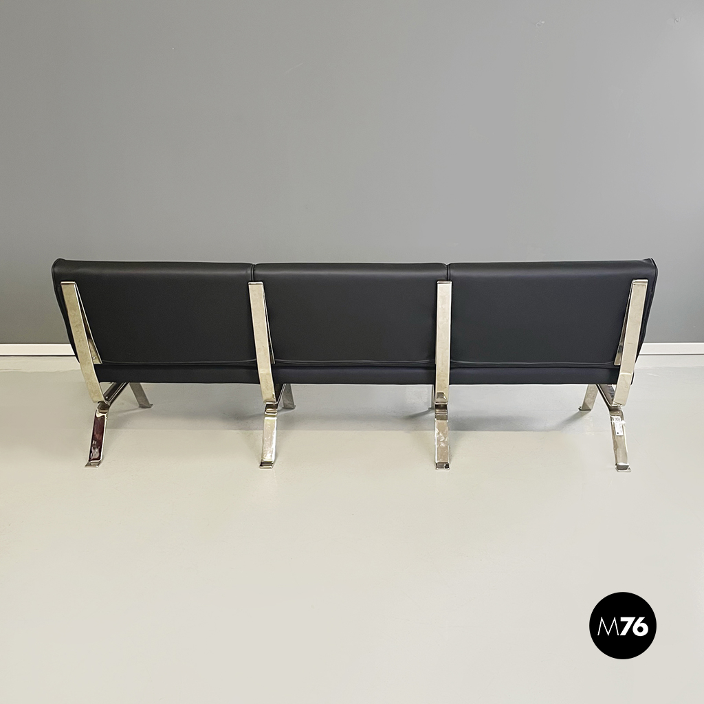 Divano tre posti, con seduta imbottita e zampe in acciaio cromato e rivestito in cotone verde scuro.