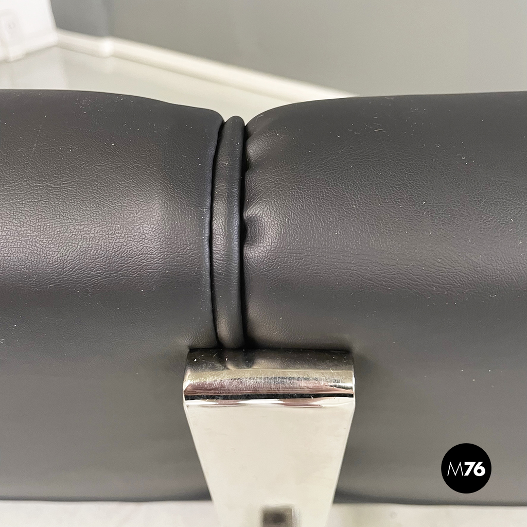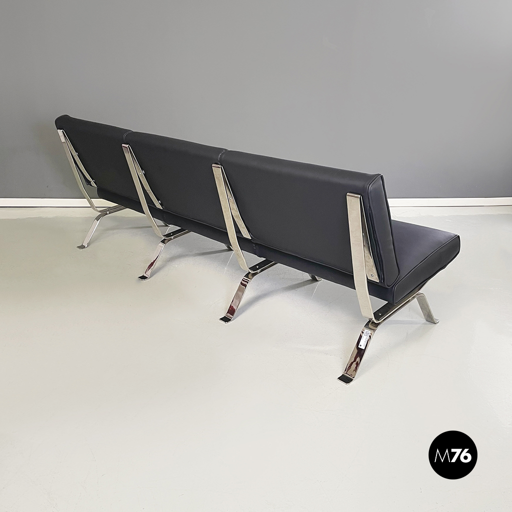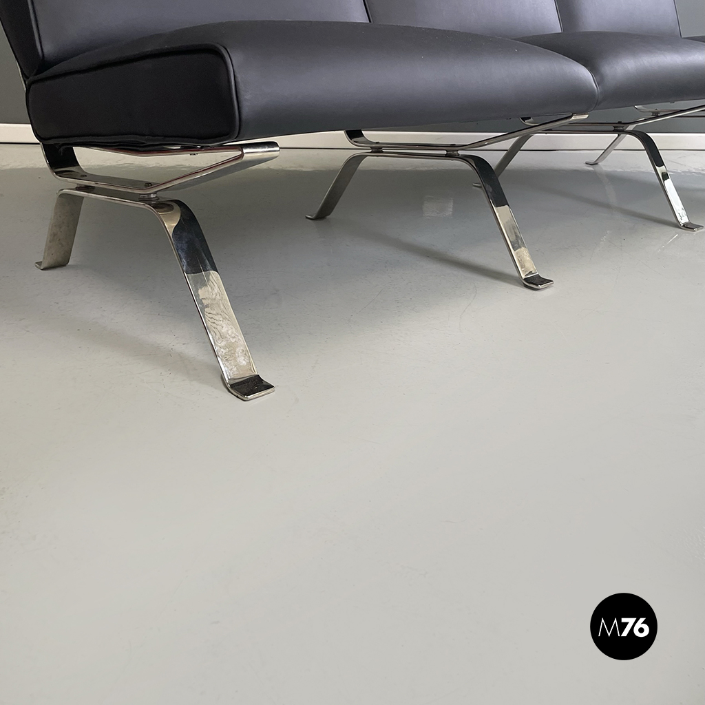 Divano tre posti, con seduta imbottita e zampe in acciaio cromato e rivestito in cotone verde scuro.